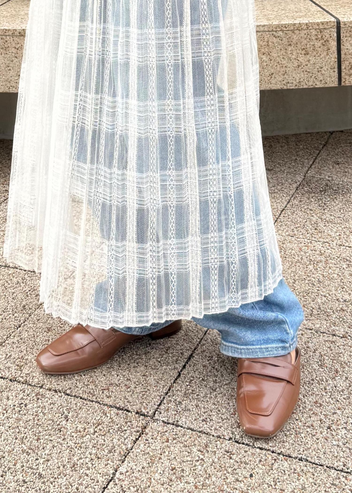 デニムパンツにスカートをレイヤードしたお出かけコーデ