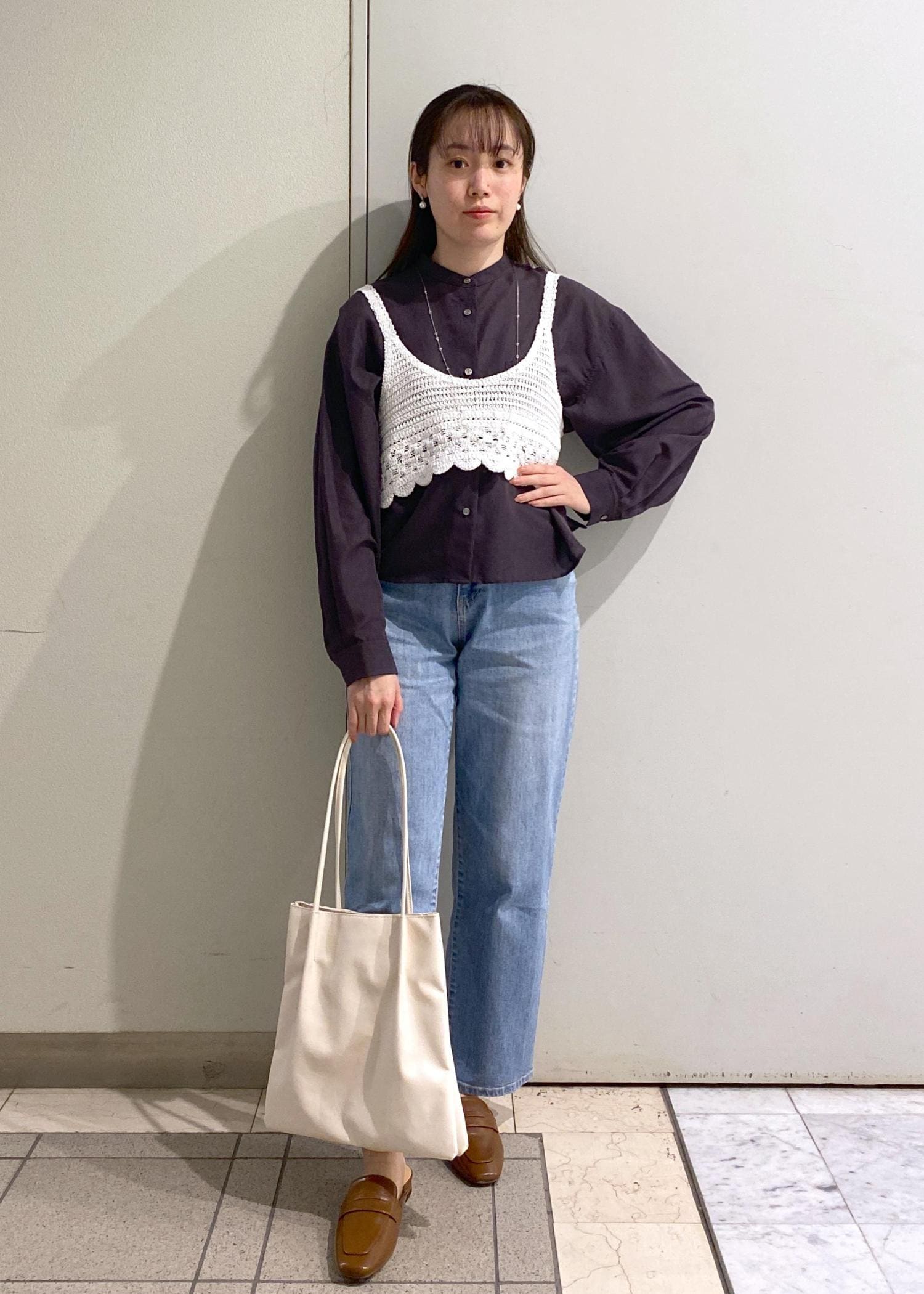 ビスチェとバッグ、シャツとシューズの色味を揃えて全体に統一感を出しています。