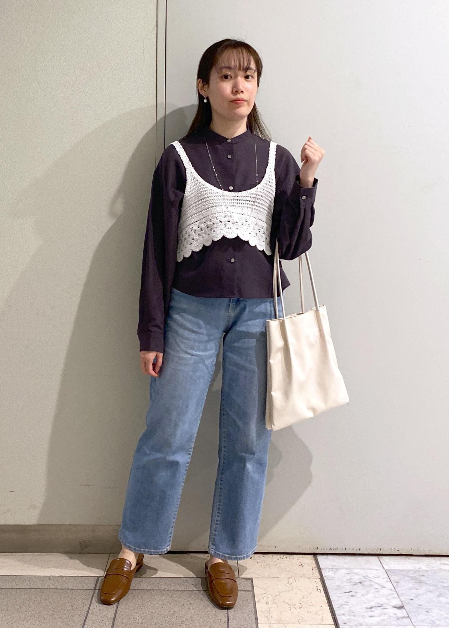 ビスチェ×シャツのカジュアルレイヤードコーデ