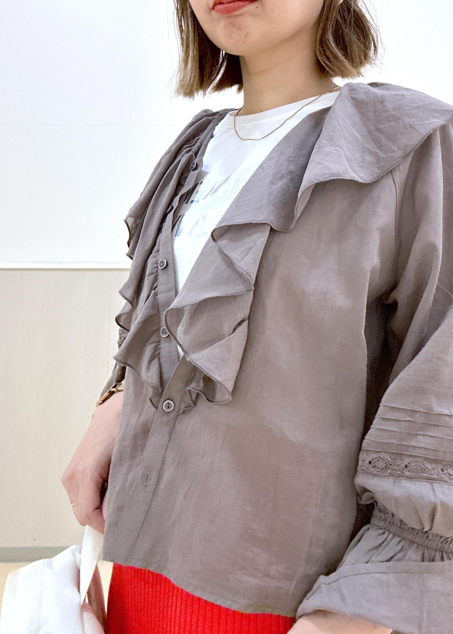 カーディガンやスウェット、ジャケット等から襟を出すと存在感ある着こなしのレイヤードスタイルに。