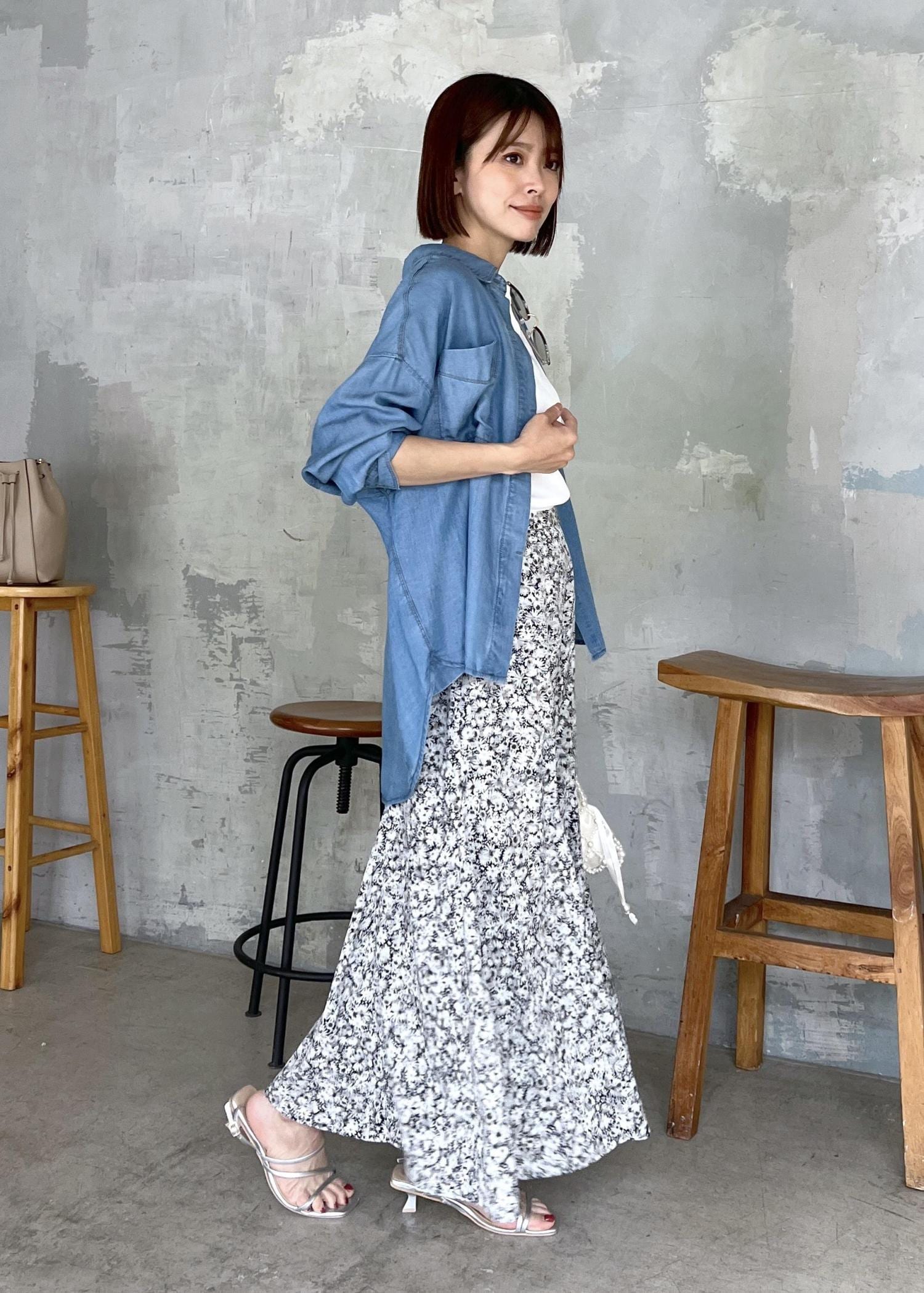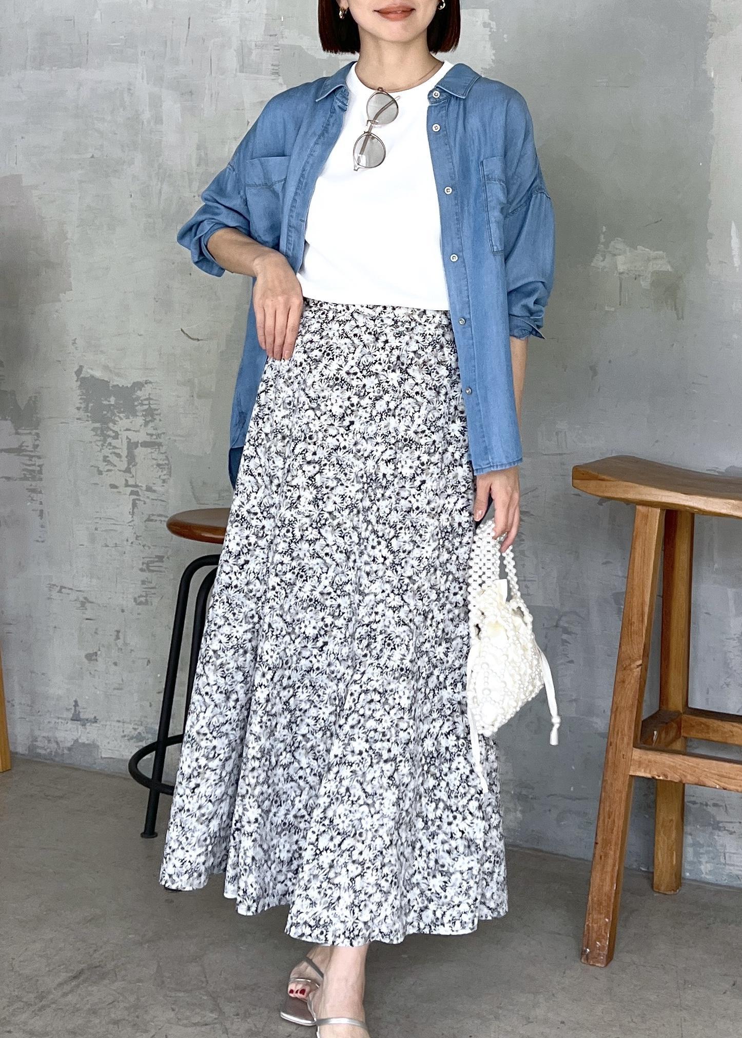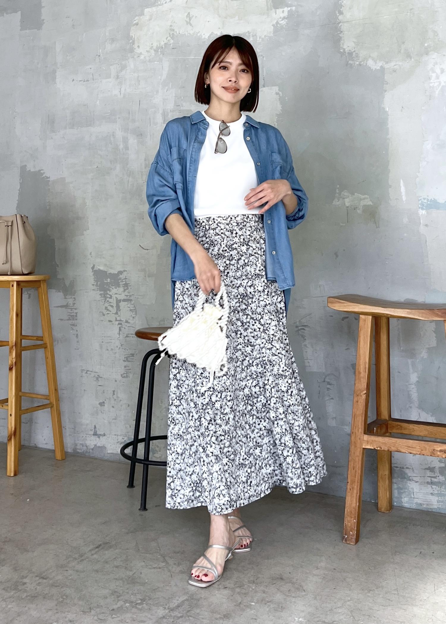 小花柄のスカートを合わせてフェミニン×カジュアルなスタイリングにしました。