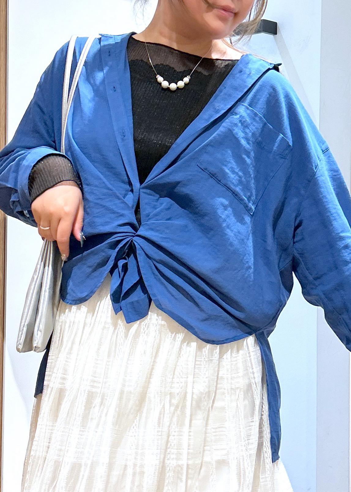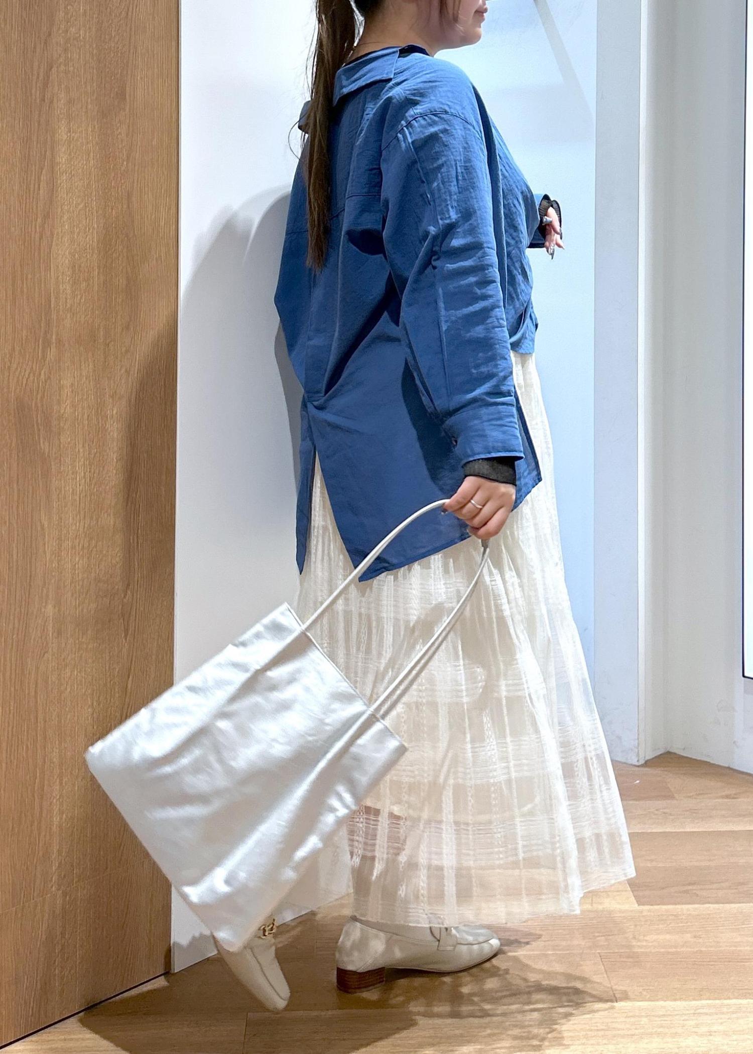 シャツ自体がゆったりめの作りなので前で少しアレンジをしてダボッとし過ぎない印象に仕上げました。