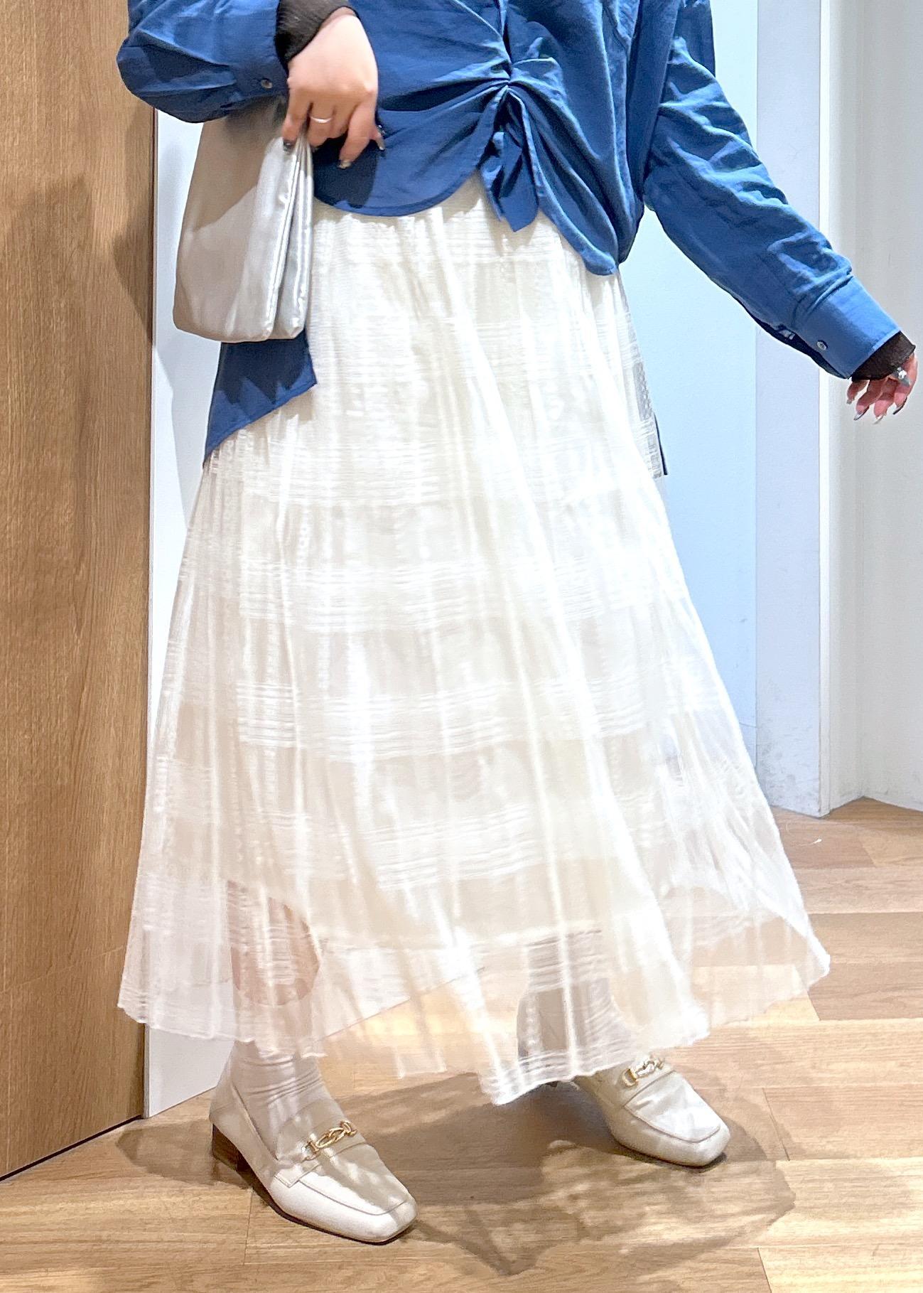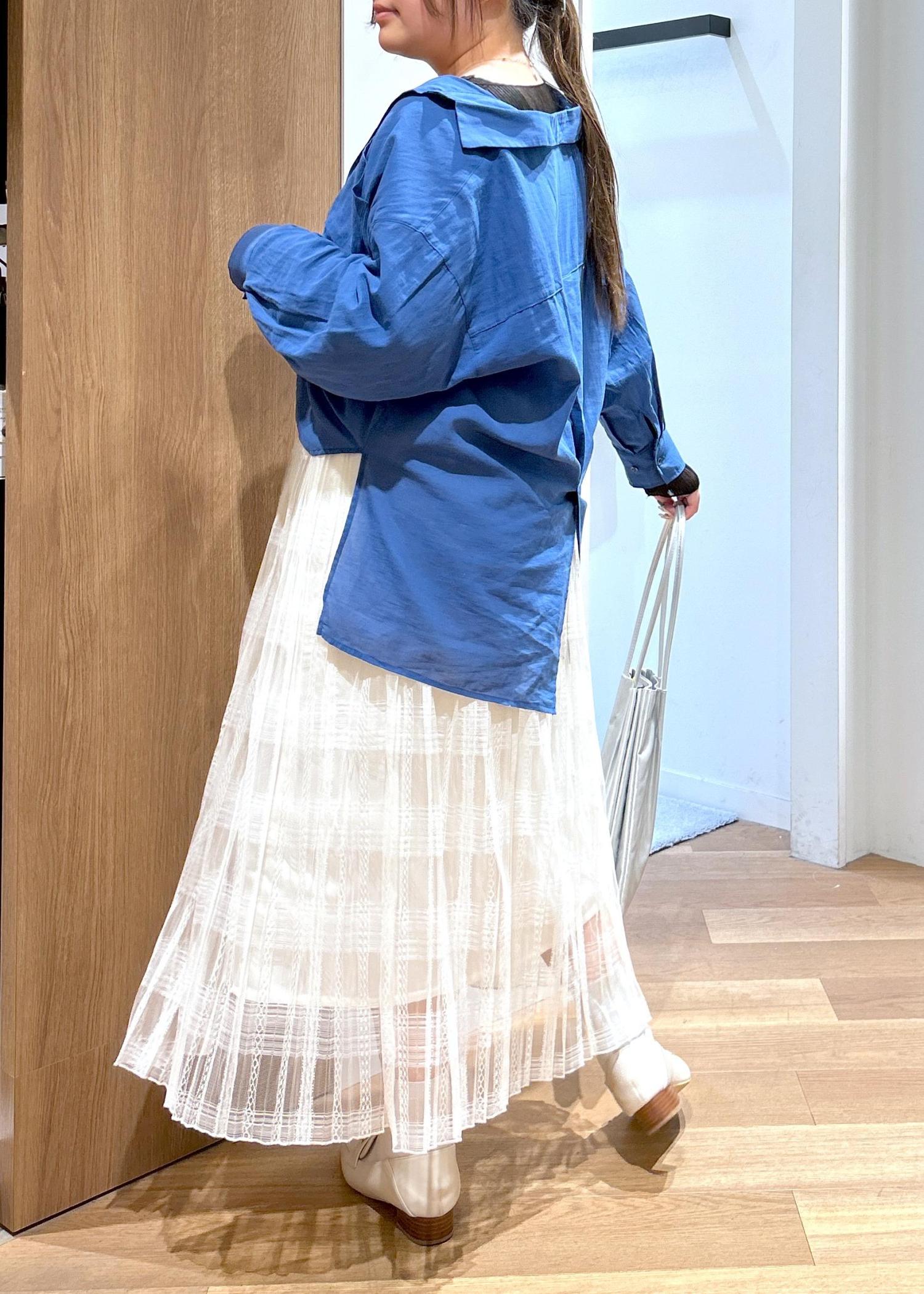綿ボイルシャツとレーススカートを合わせインナーにシースルートップスを使い春らしいコーディネートにしました!