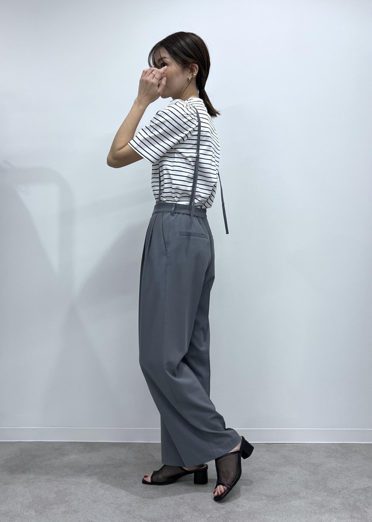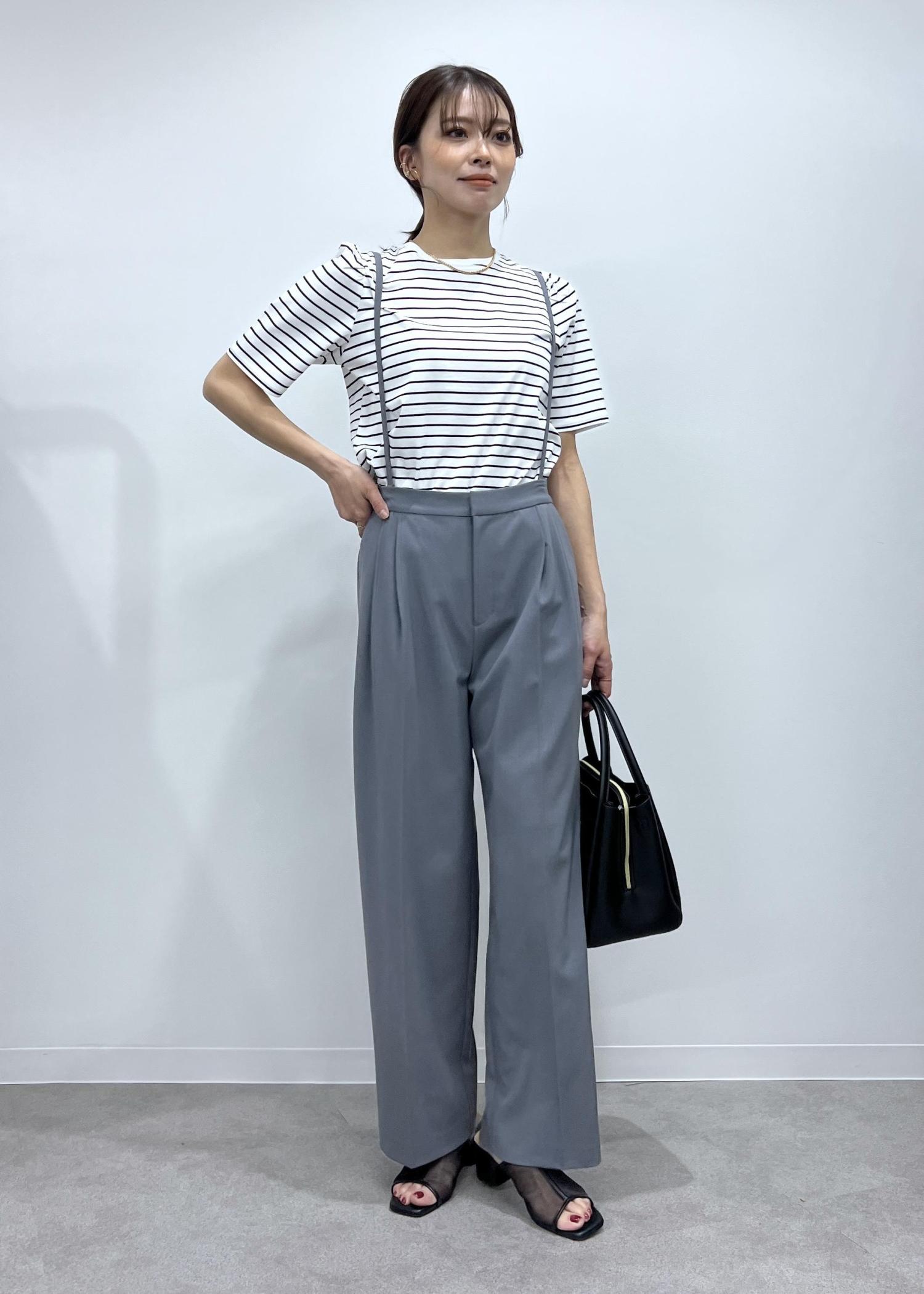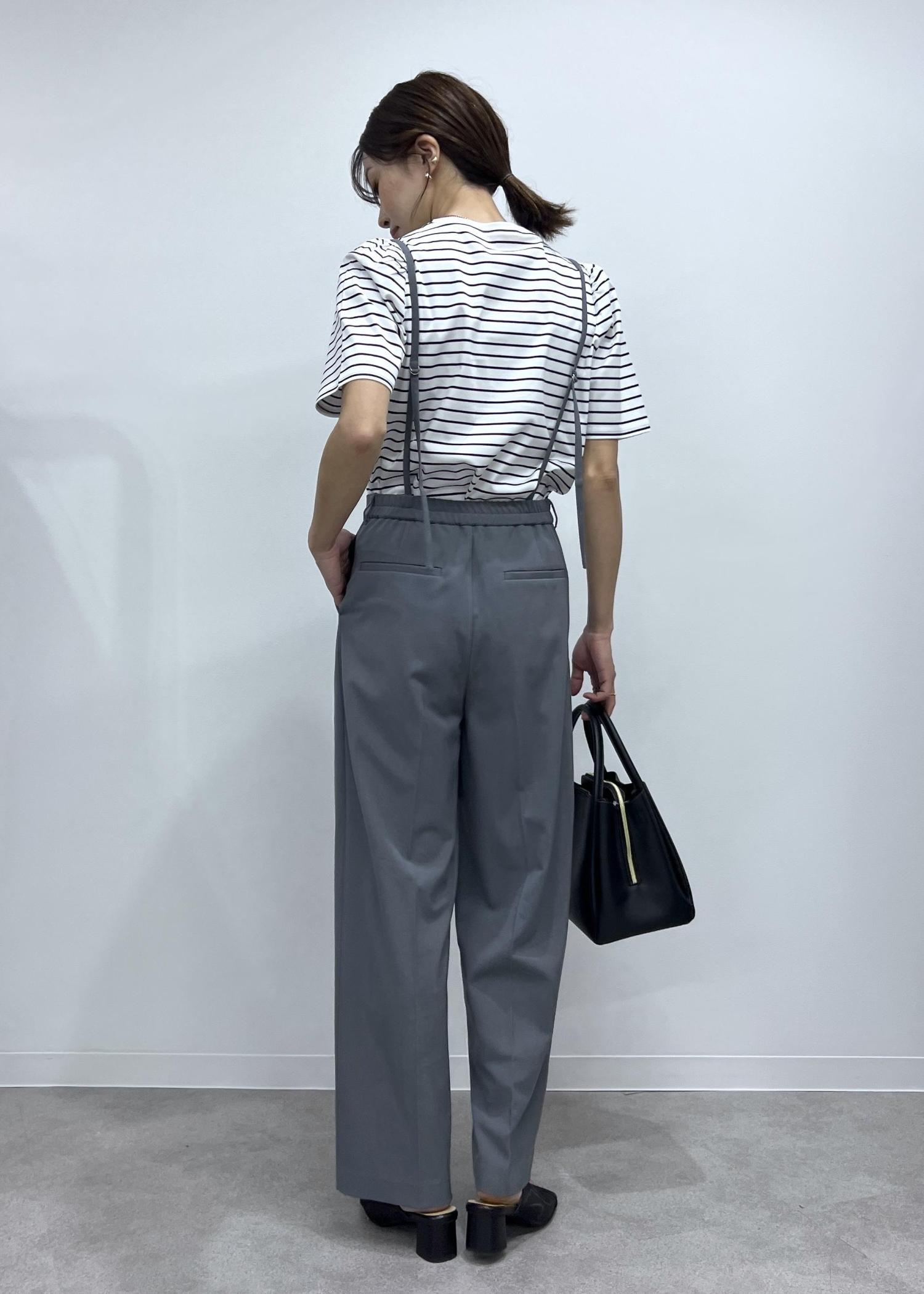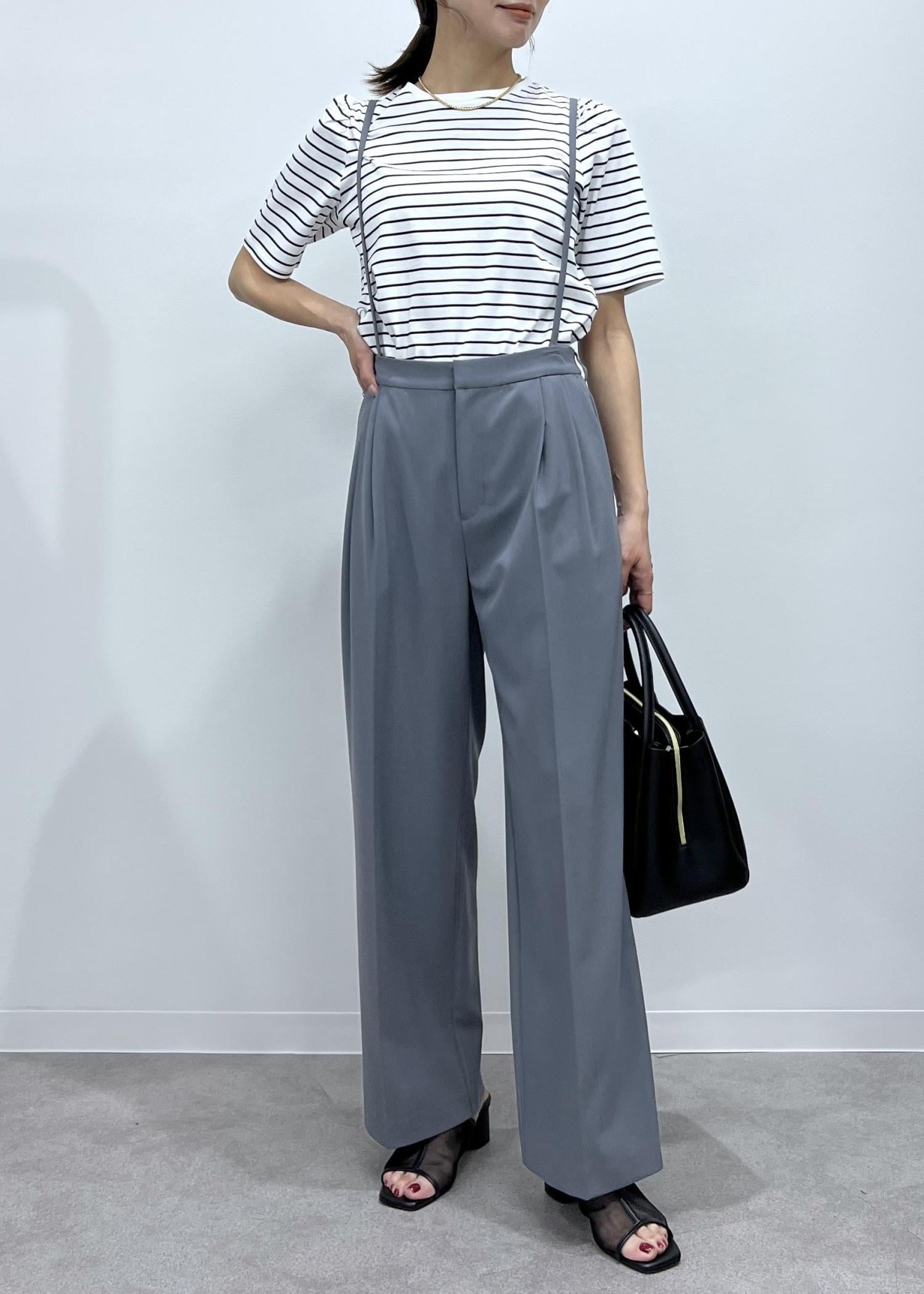 グレーのパンツはサスペンダー付きで、コーデのポイントになってくれます。