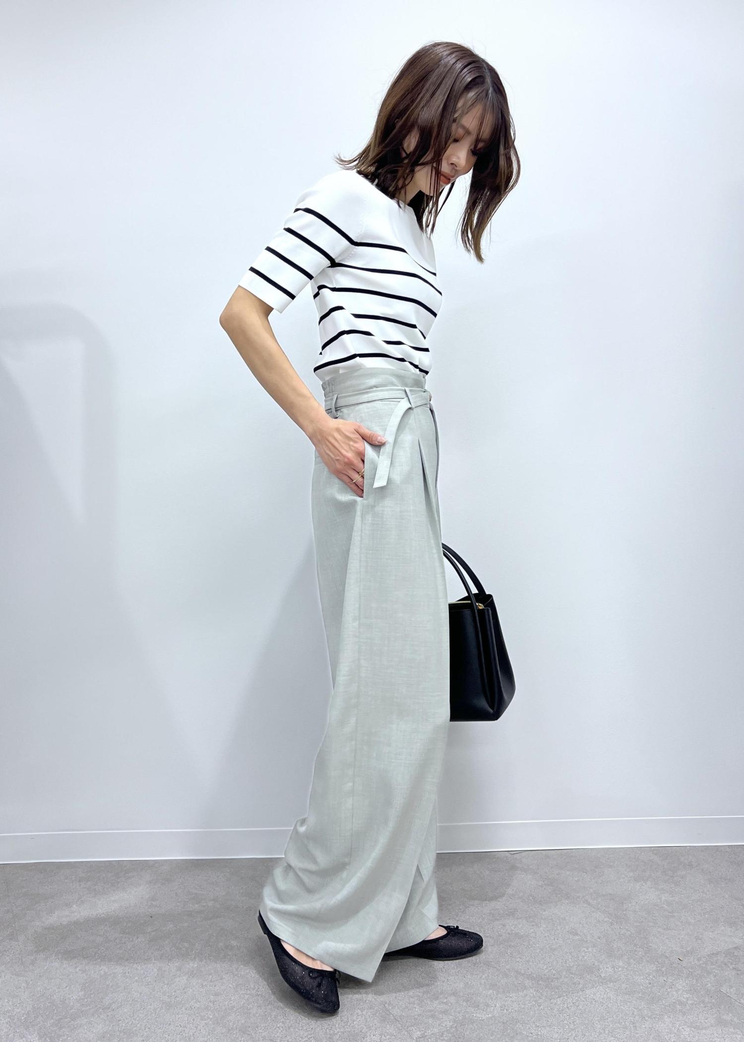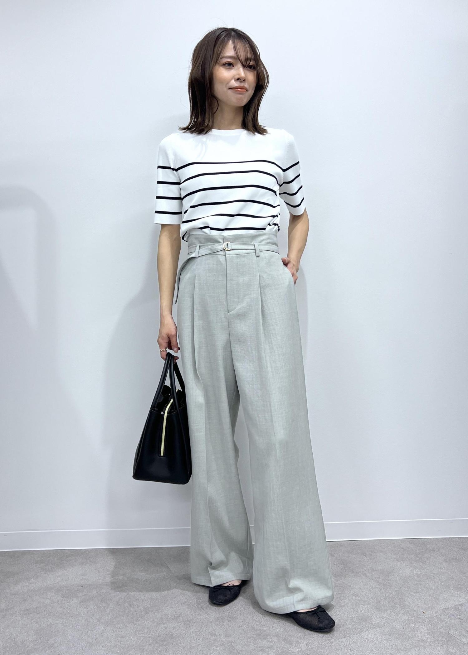 接触冷感のニットをインして、暑い日にも着やすいきれいめカジュアルコーデにしました。