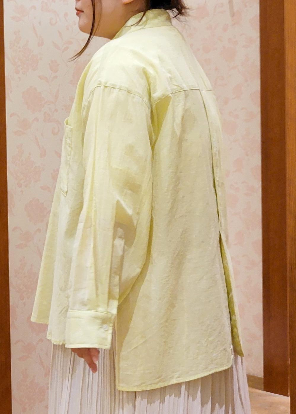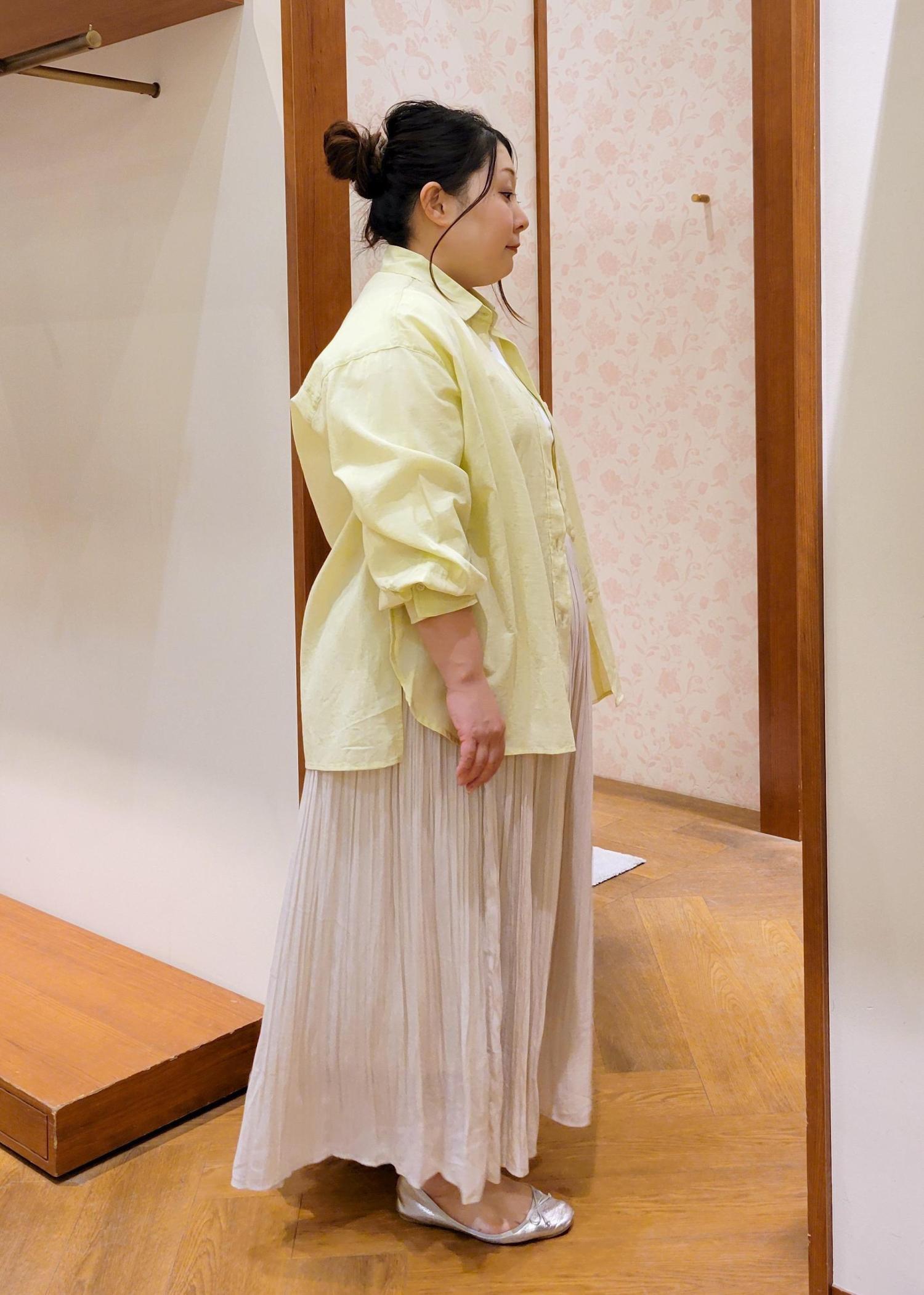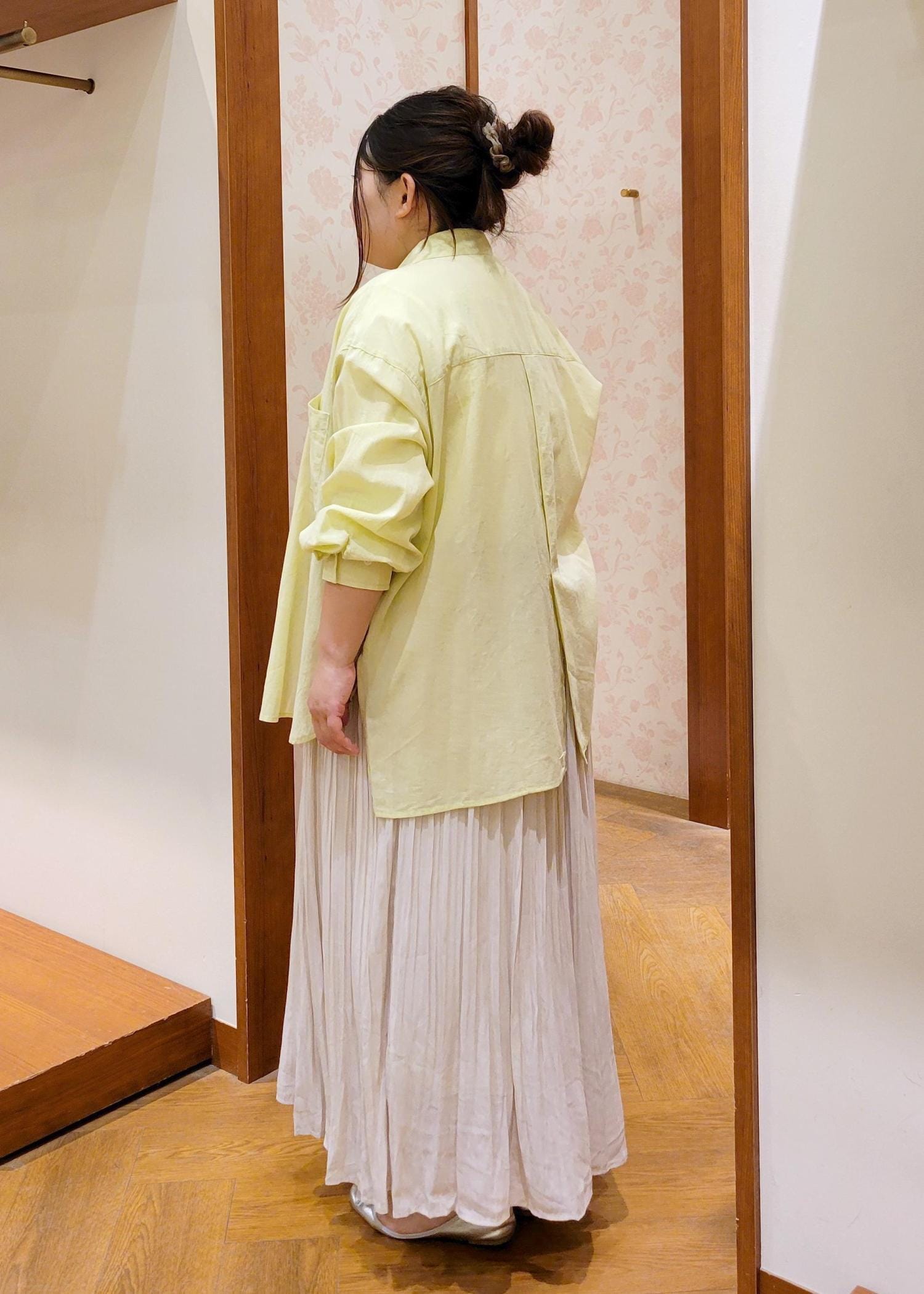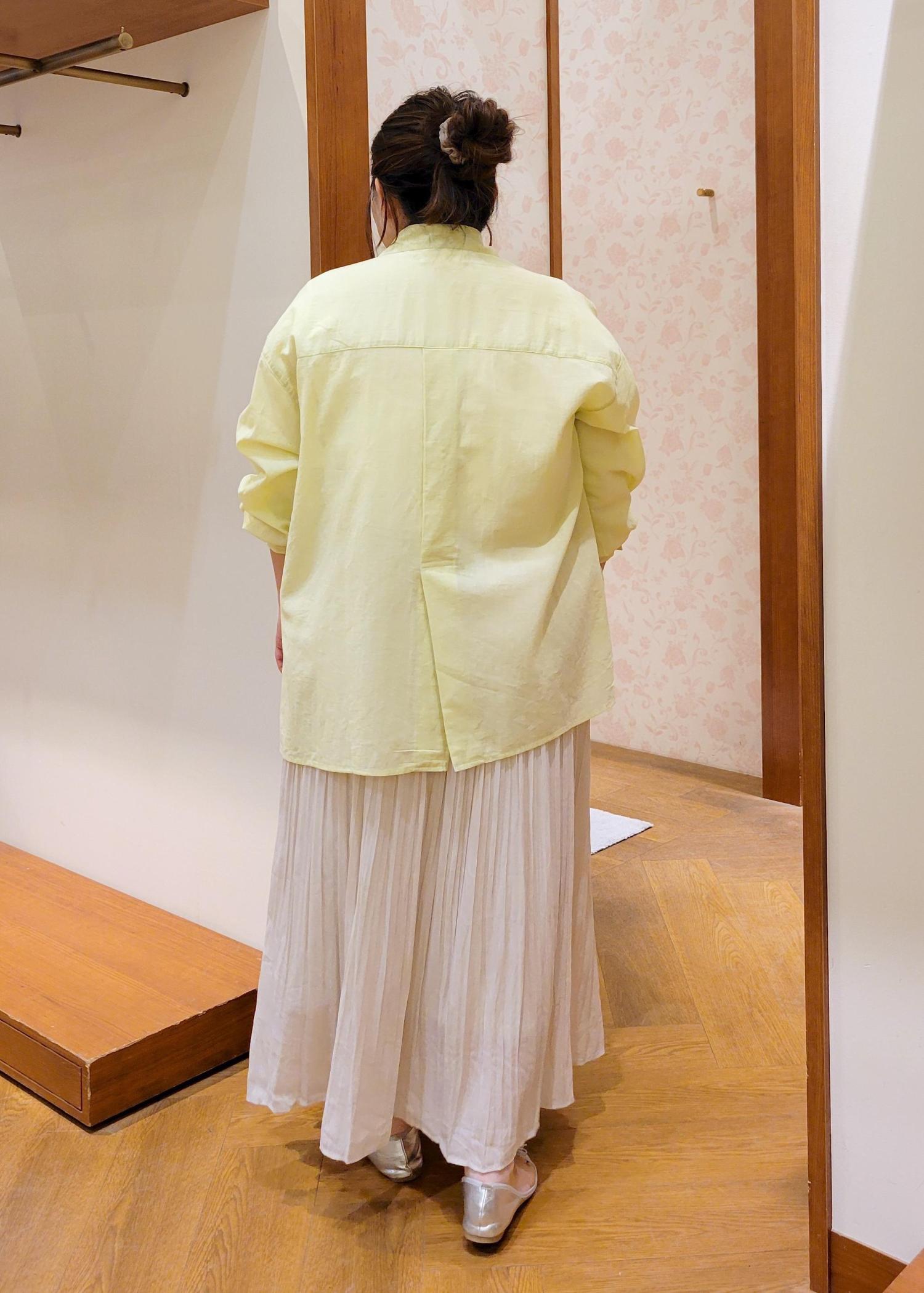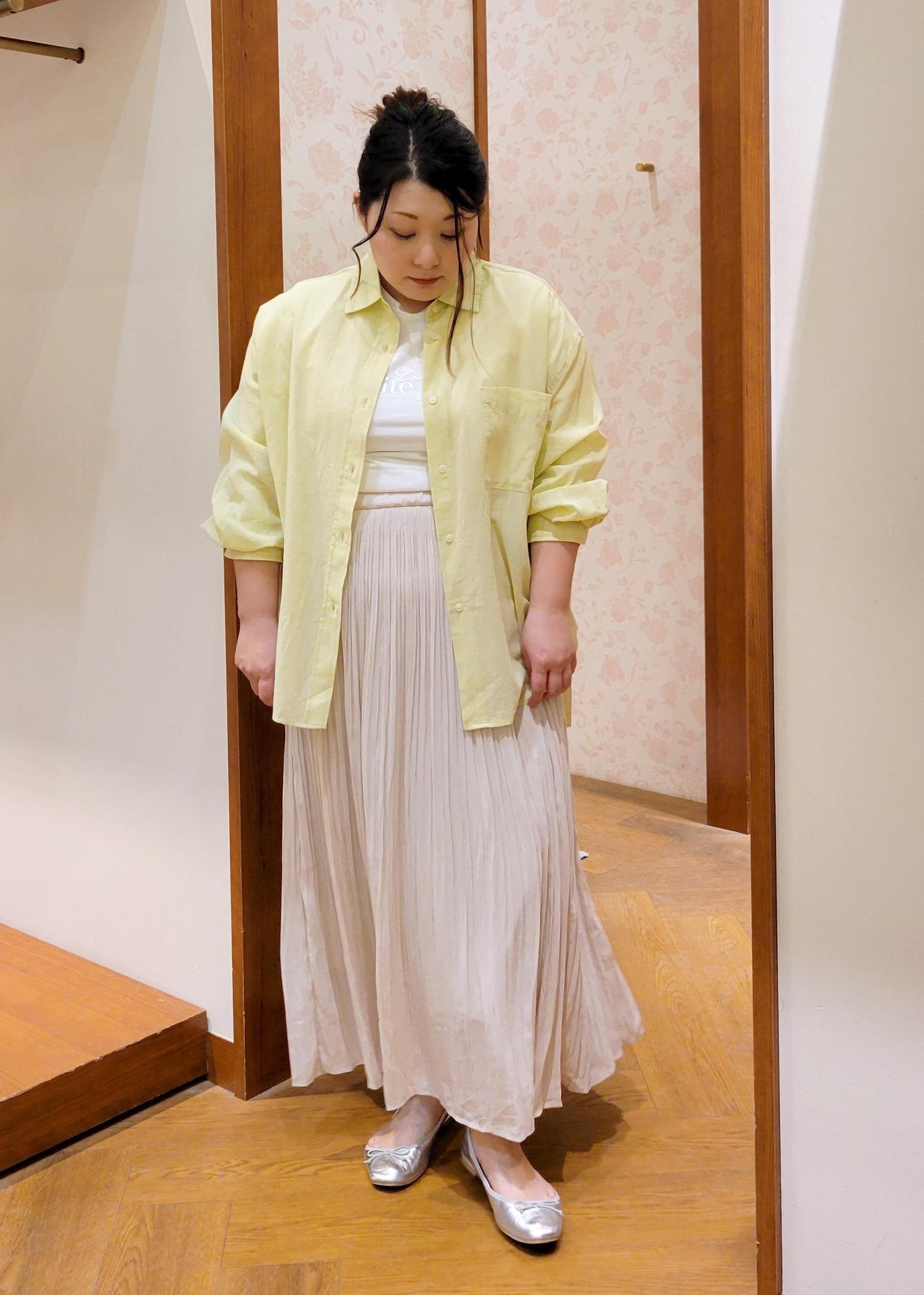 綿ボイルバックタックシャツのイエローを合わせたスタイリングです。春にぴったりなイエローを引き立てるために、そのほかのアイテムはベージュやシルバーで落ち着いたカラーにしました。