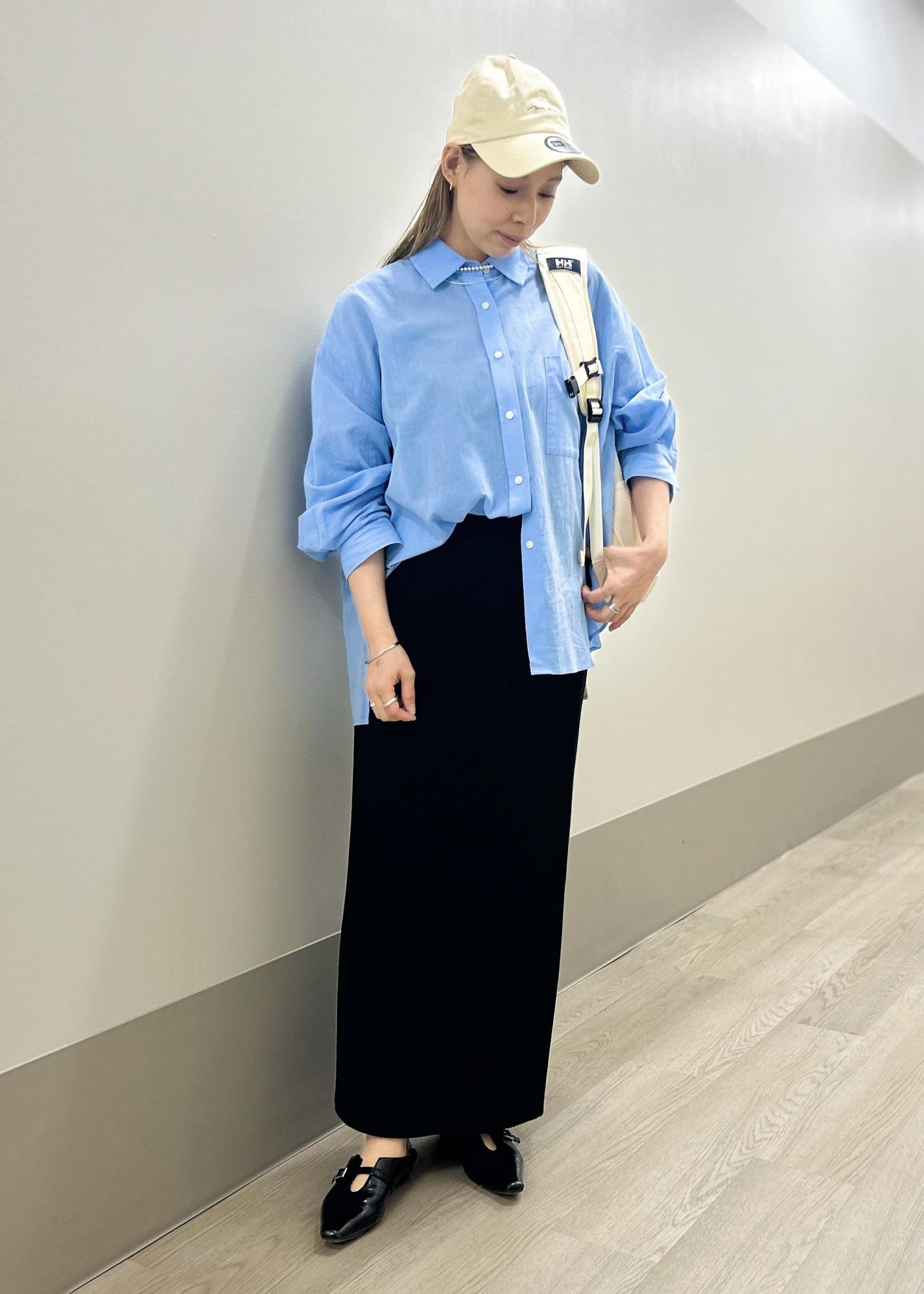 シャツと綺麗めなスカートをカジュアルなリュックとキャップで合わせたコーディネートです。