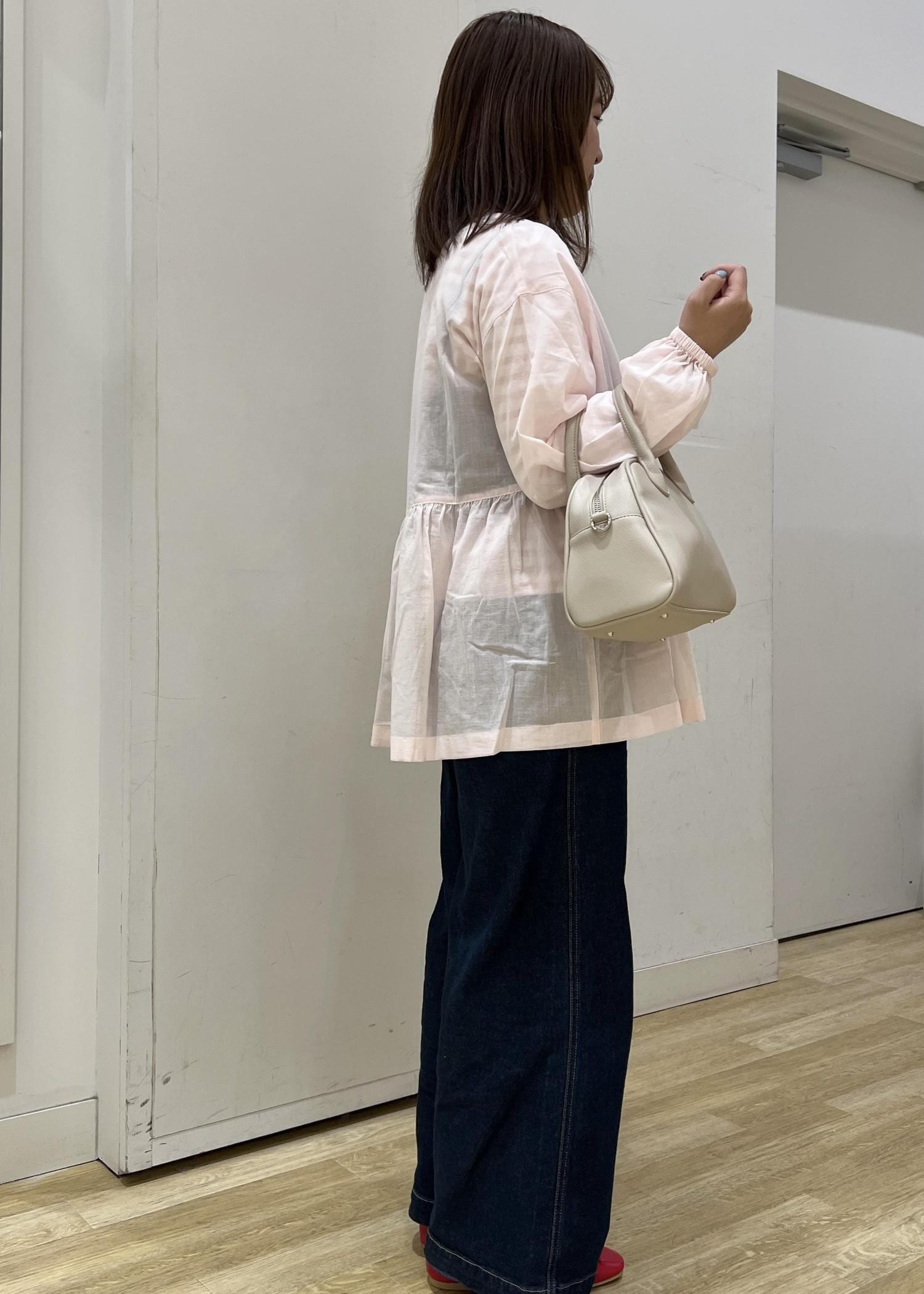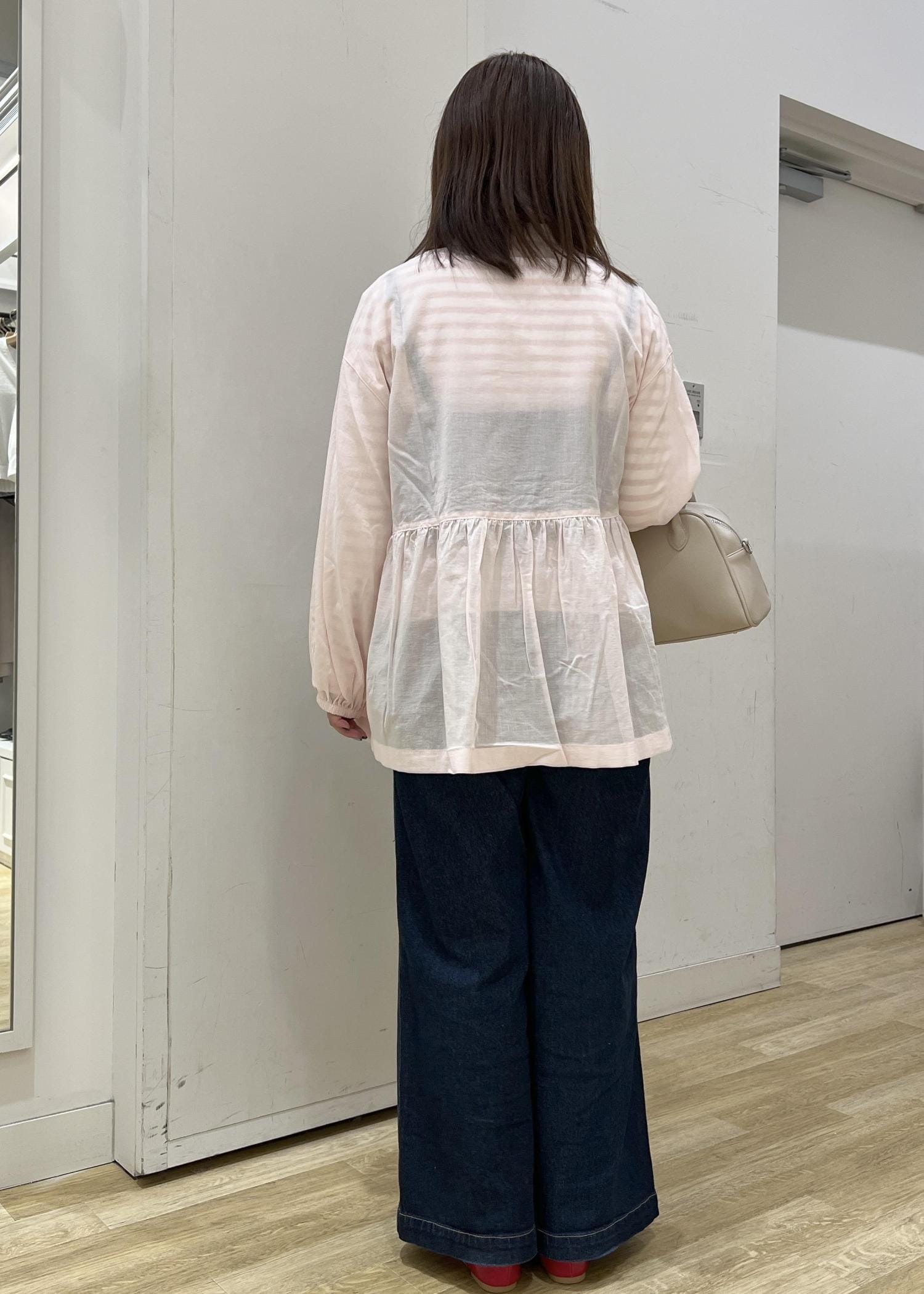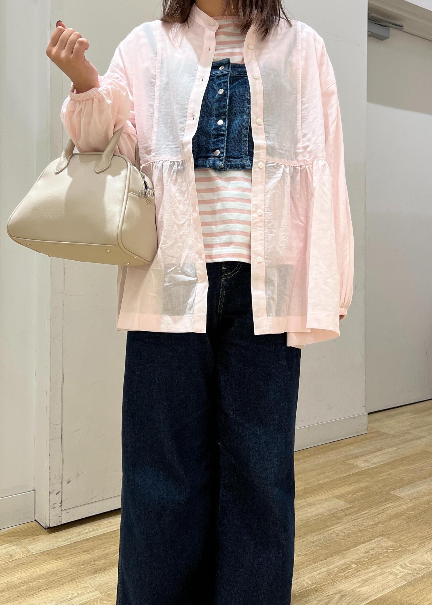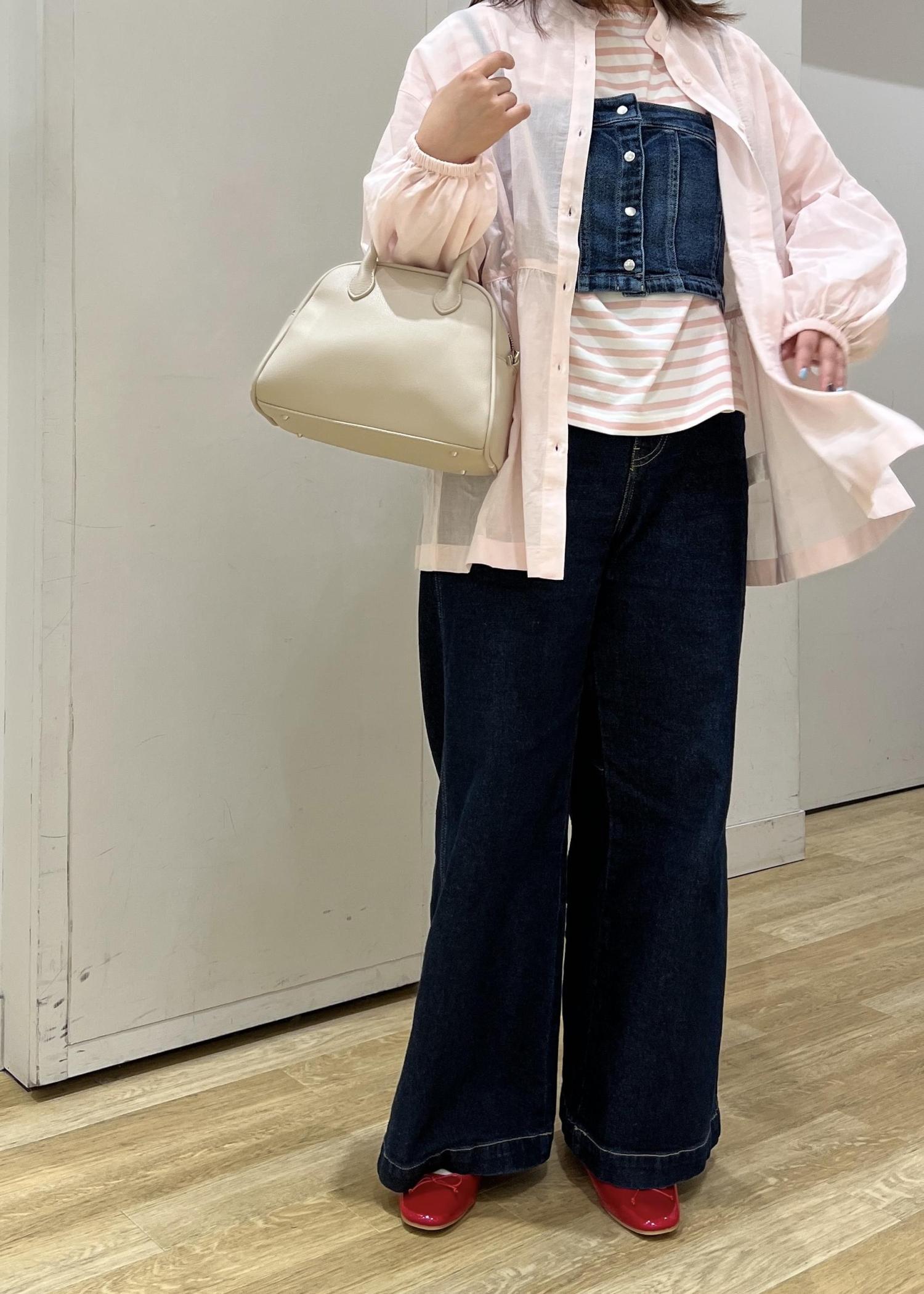 シャツとボーダーのトップスの色を春らしいピンクにし、パンツとビスチェをデニムにすることでコーディネート全体に統一感を出しました!