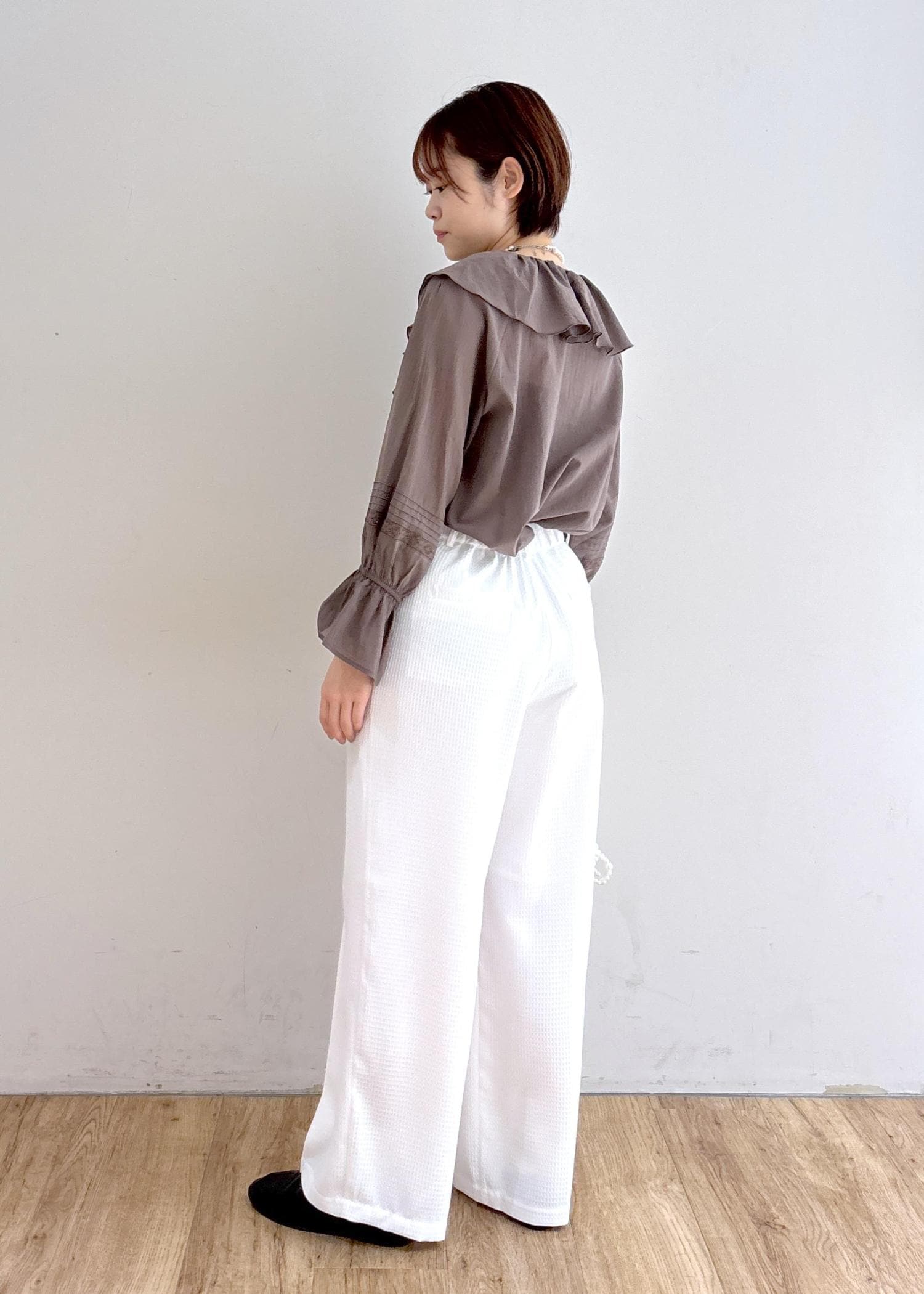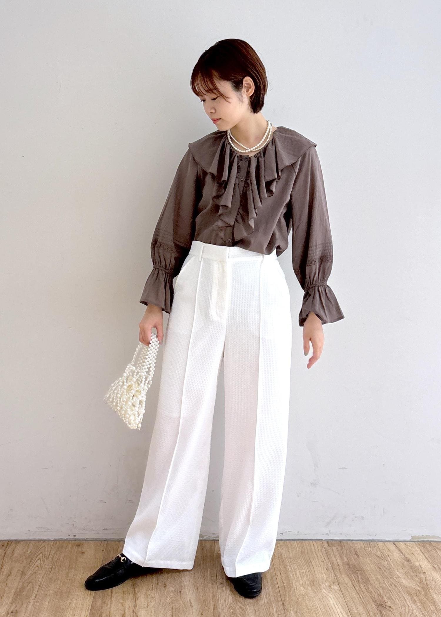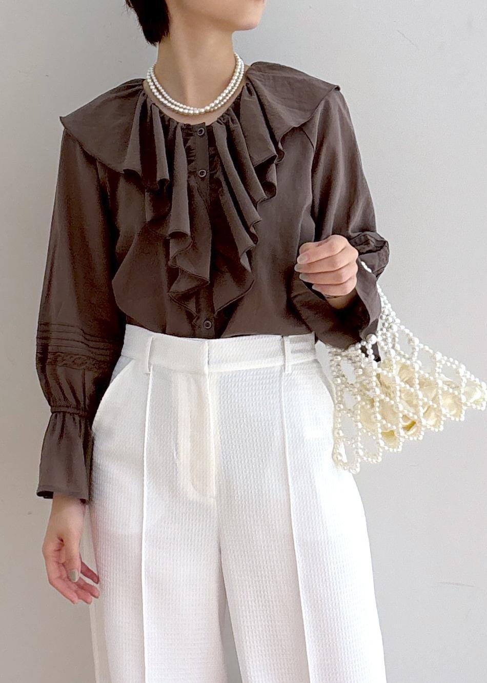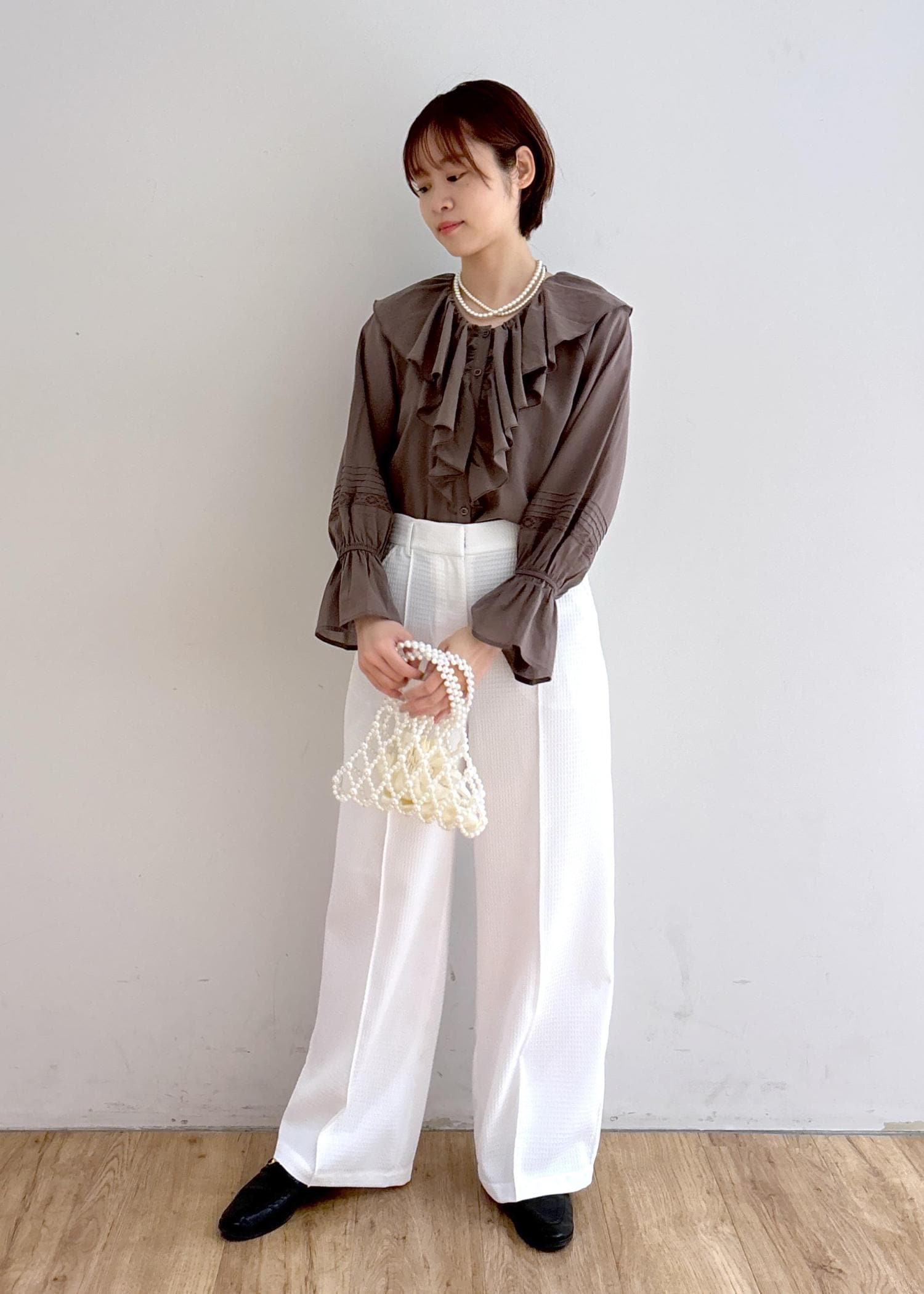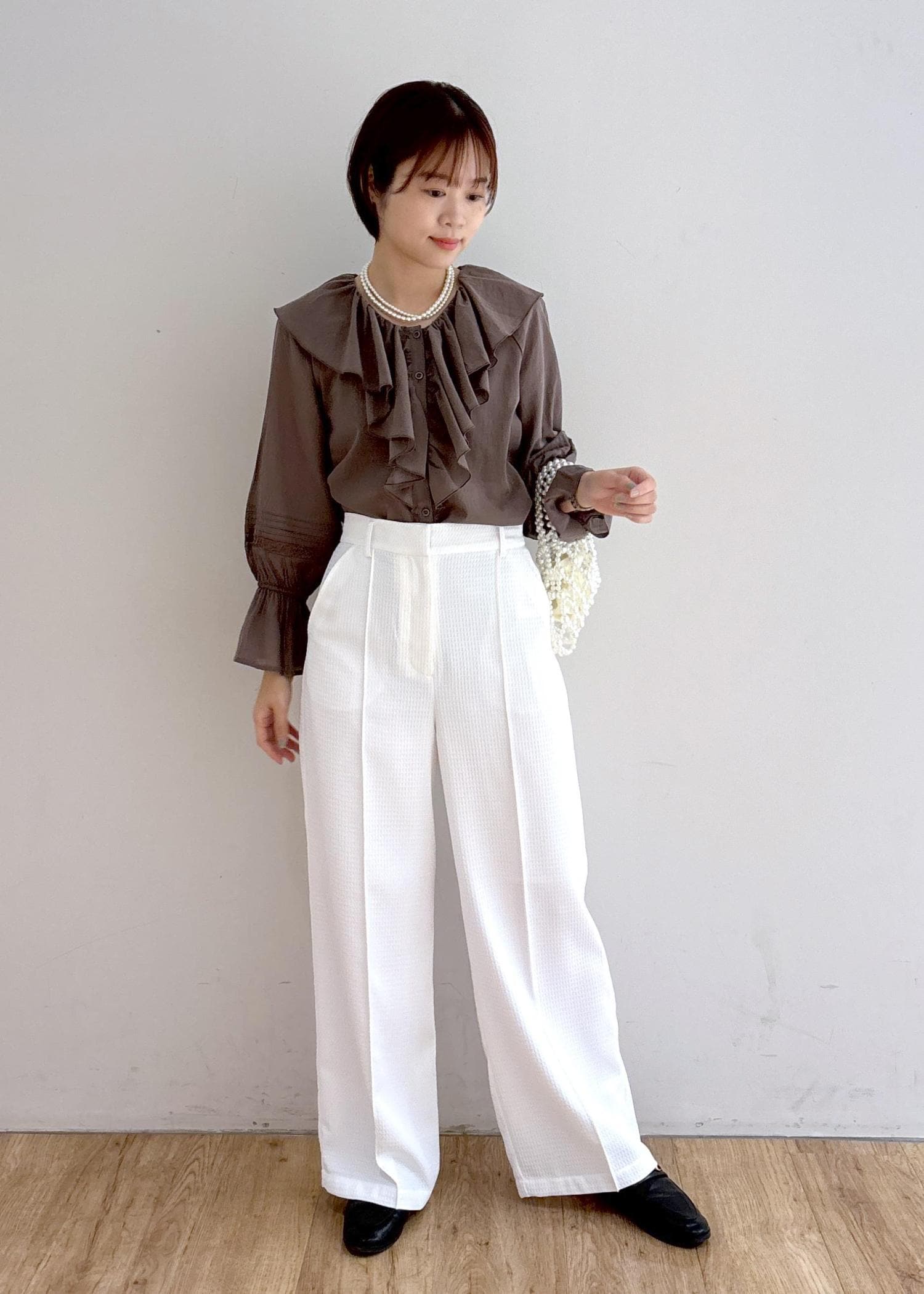 フリルブラウス×パールで上品な大人カジュアルコーデ。