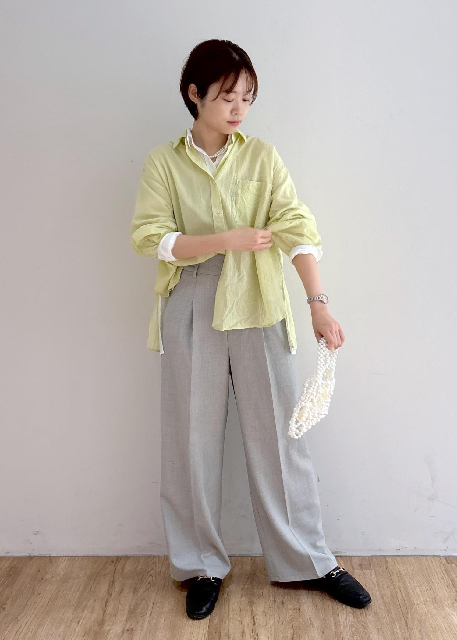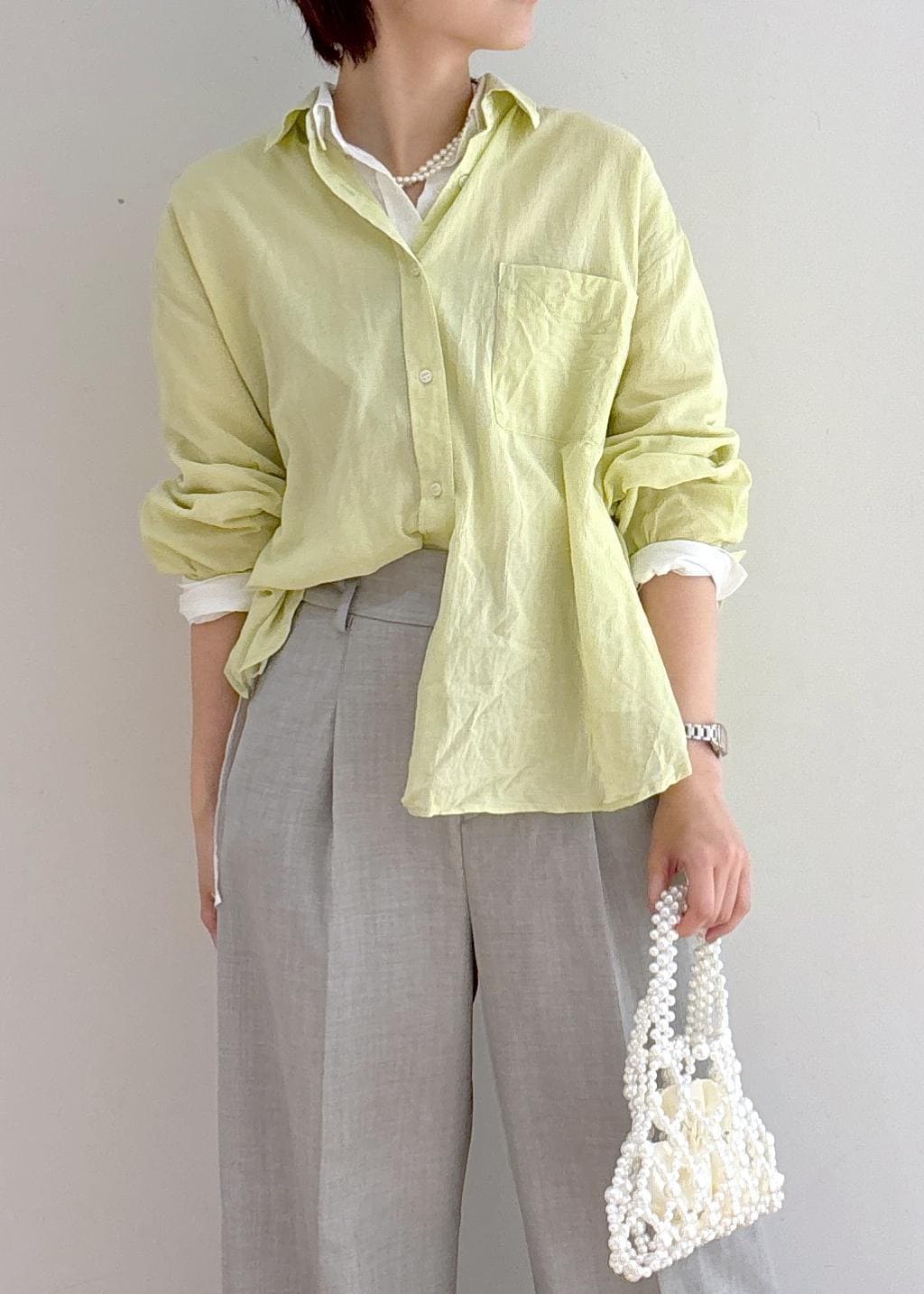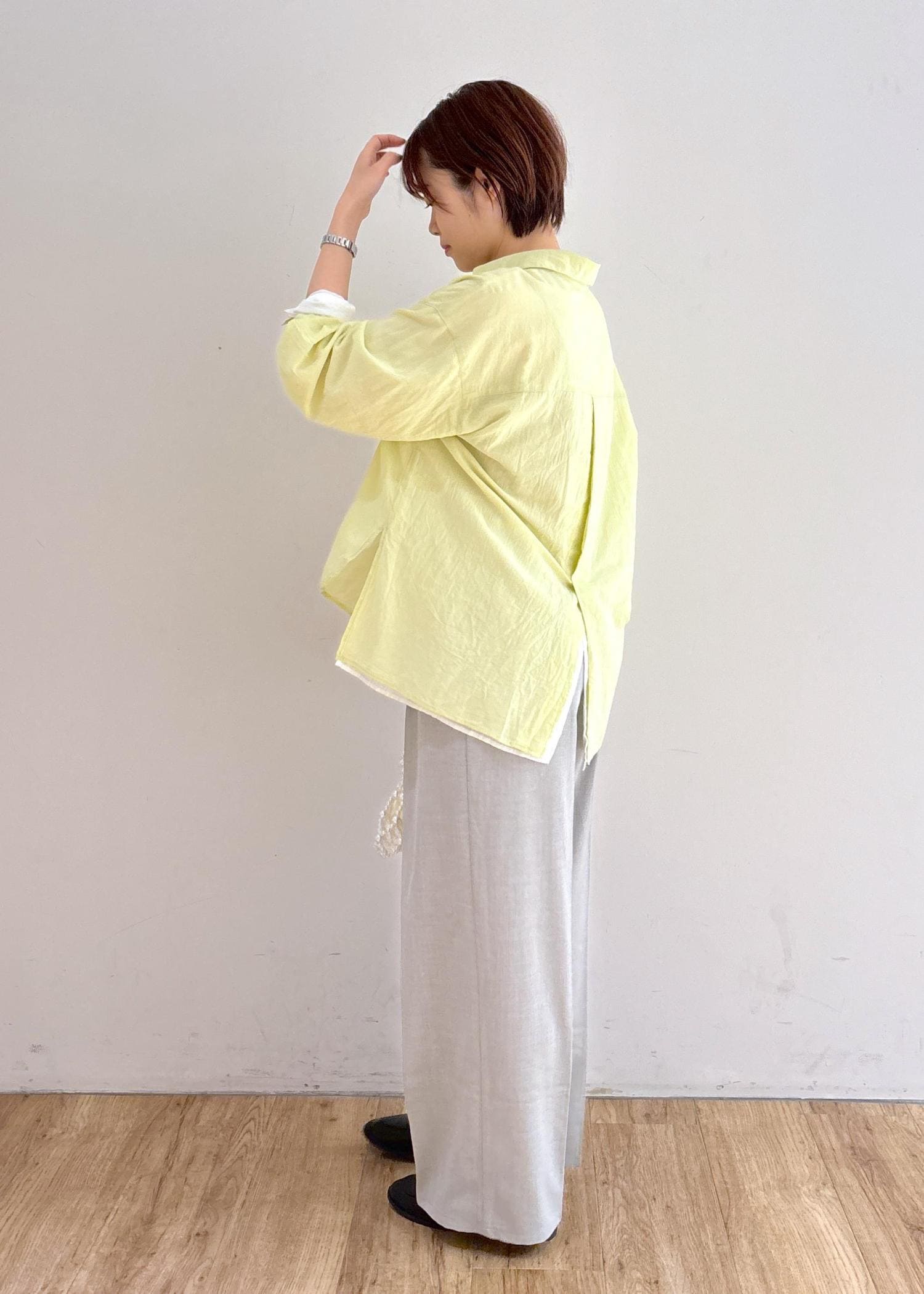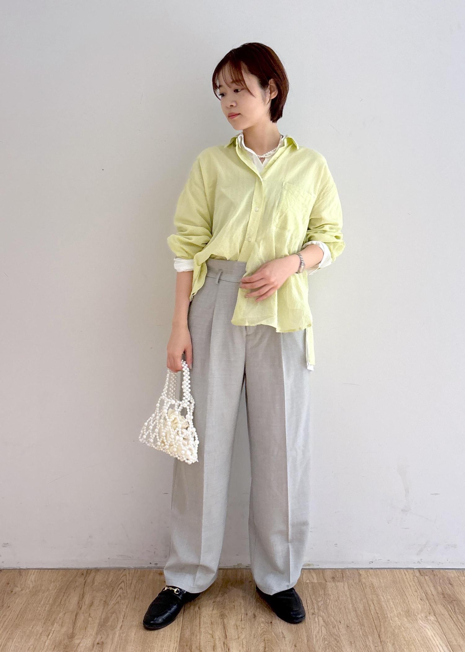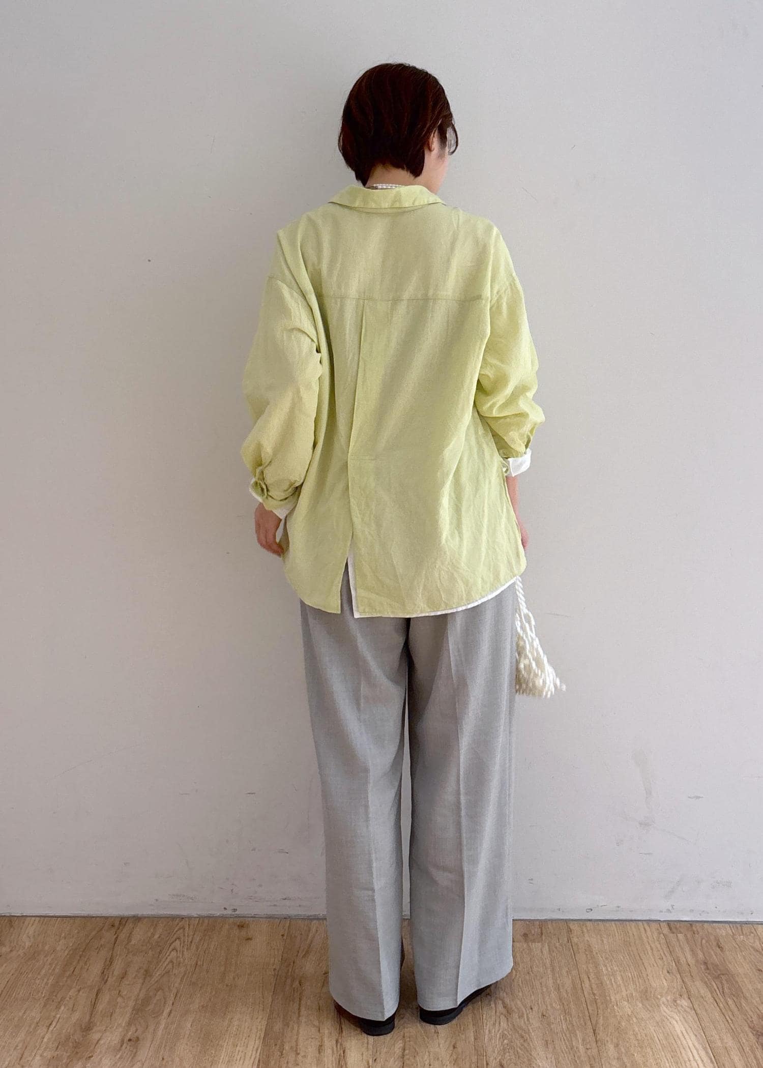 イエローのカラーがパッと目をひくシャツの下に、色違いのシャツを重ねて。