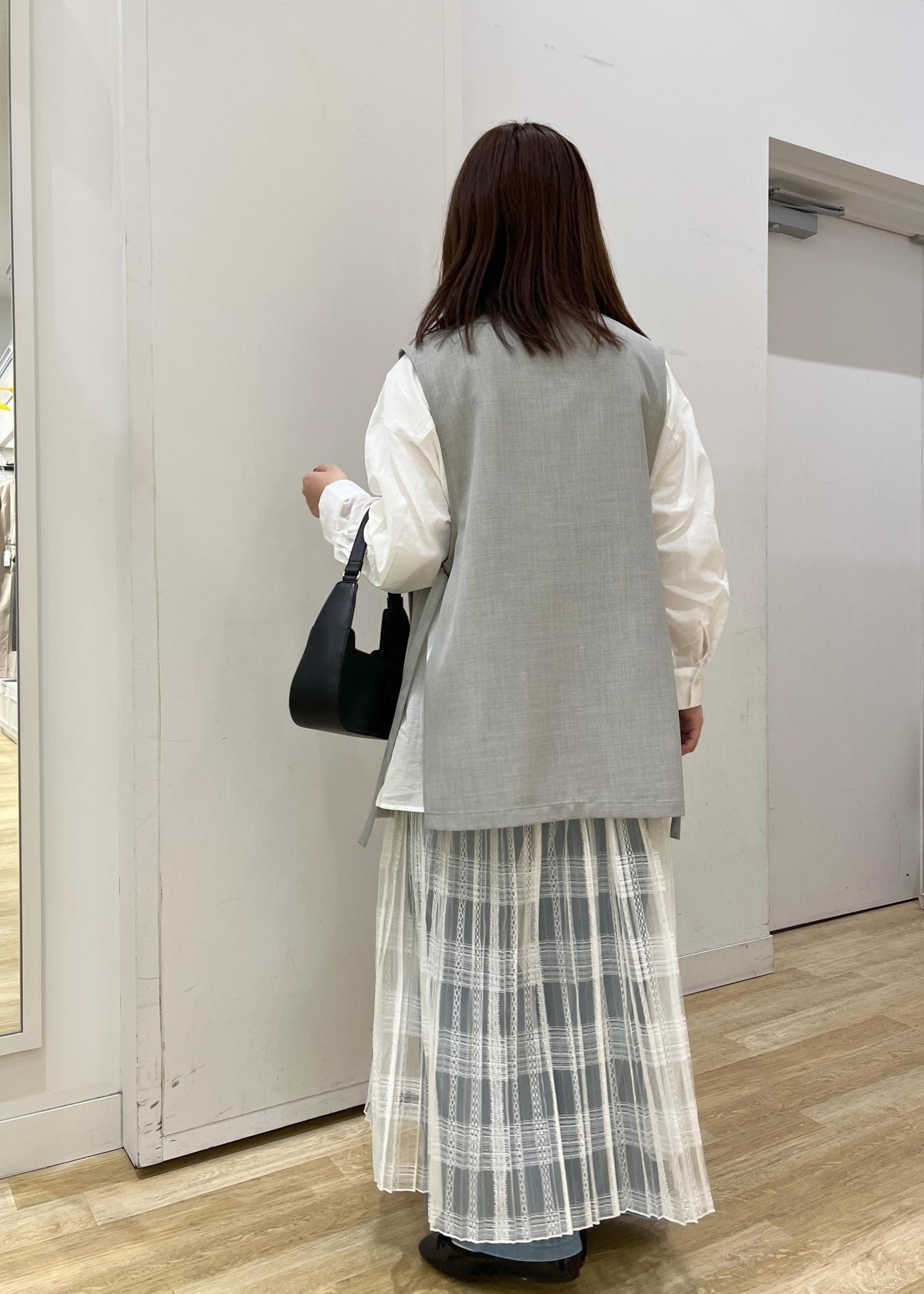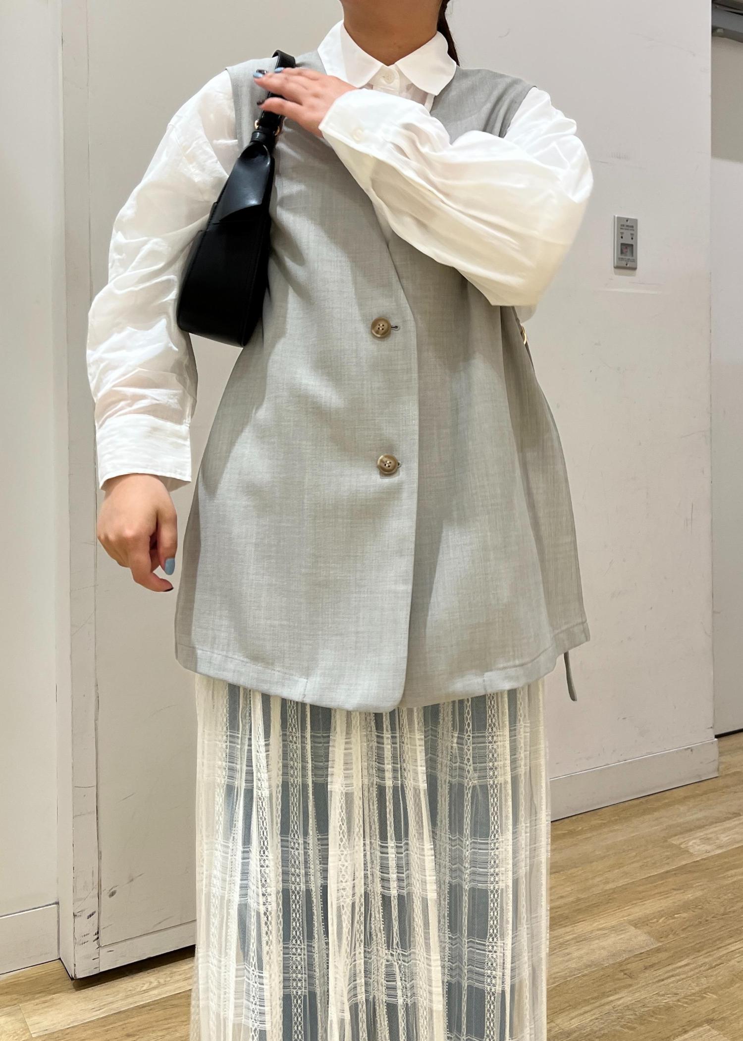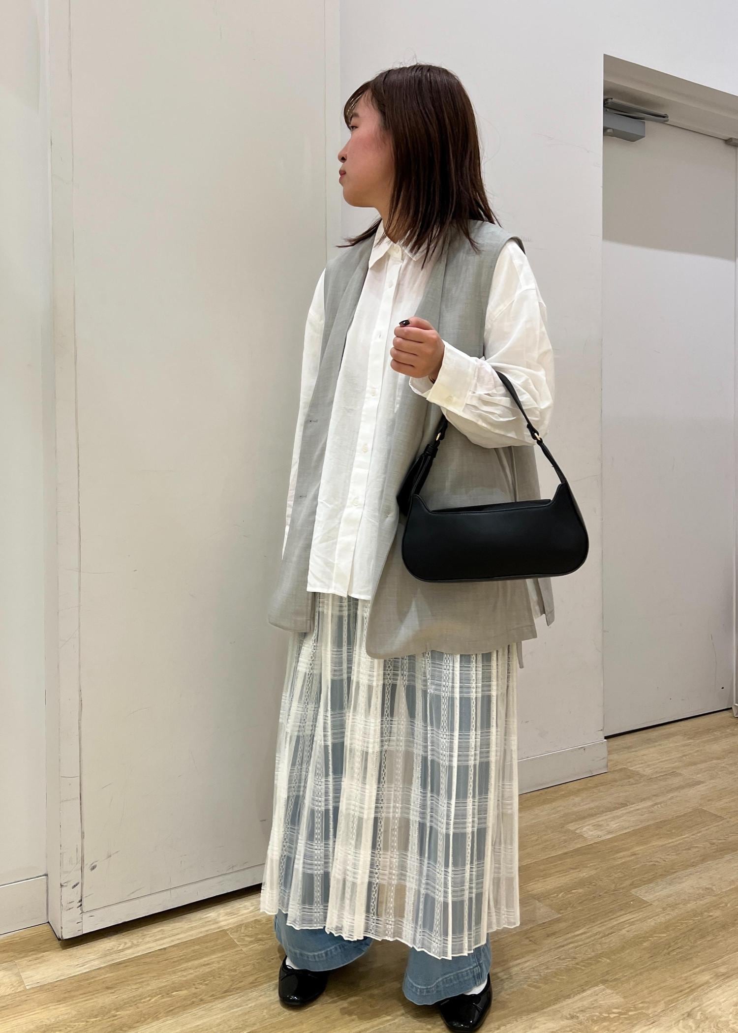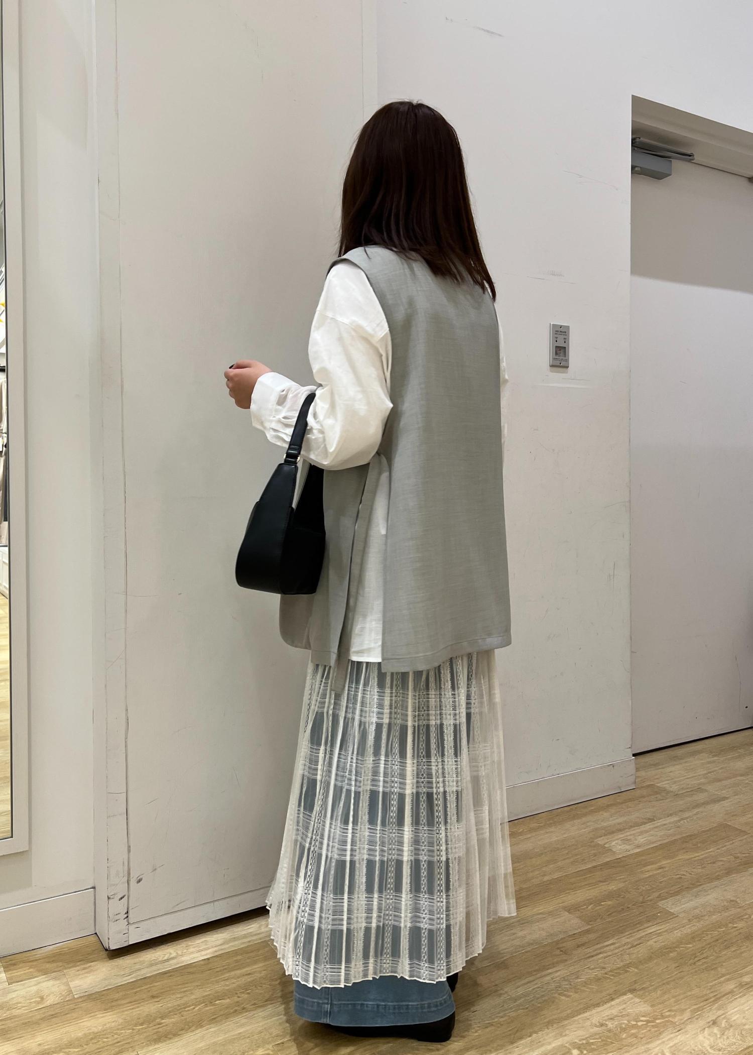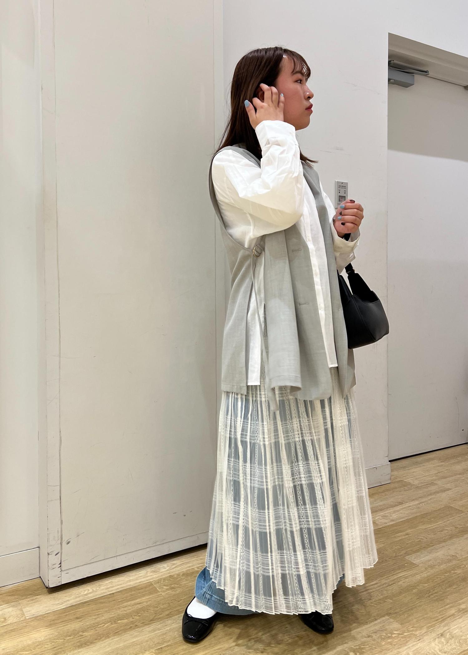 デニムやシャツのみだとカジュアルになりすぎるのをあえて、レイヤードしてスカートを重ねたり、ジレを羽織ったりして大人の雰囲気を出しました!また、小物は黒で締めてメリハリのあるコーディネートにしました!
