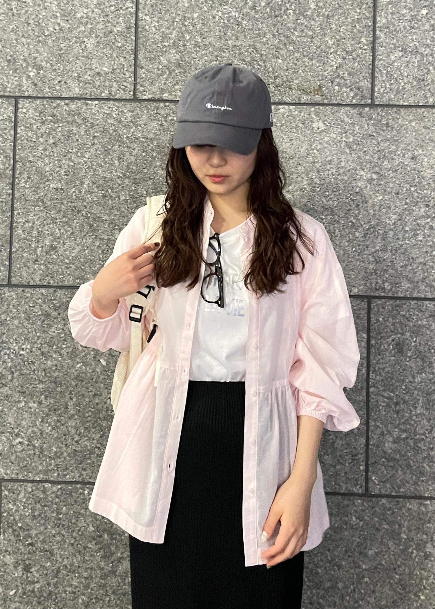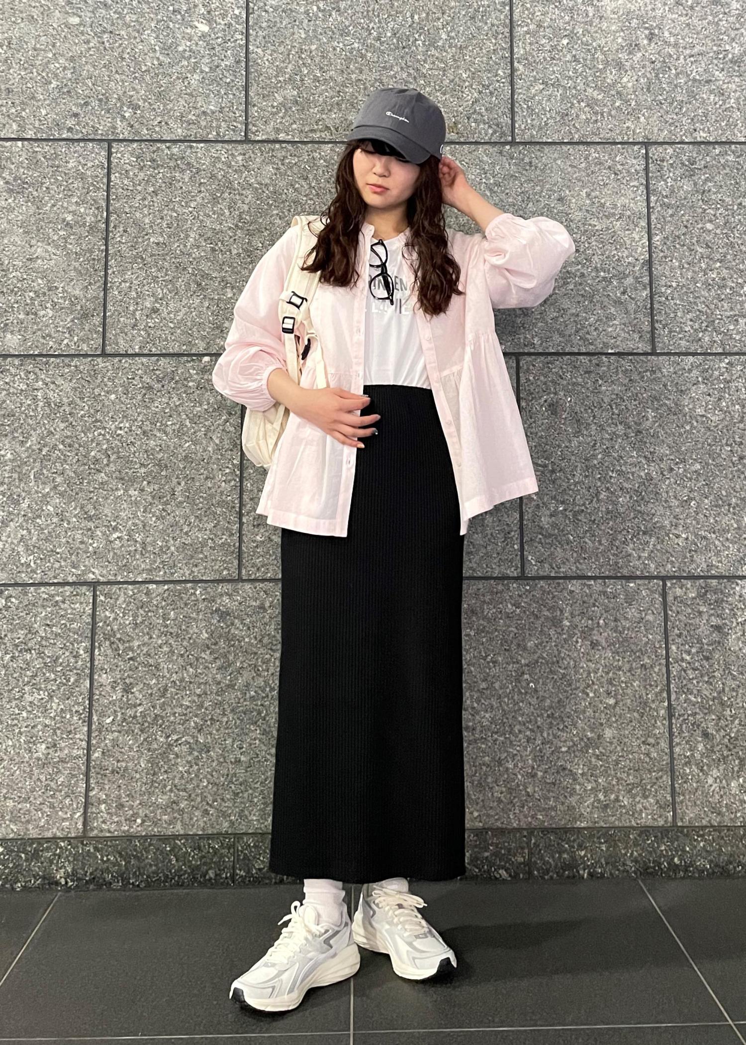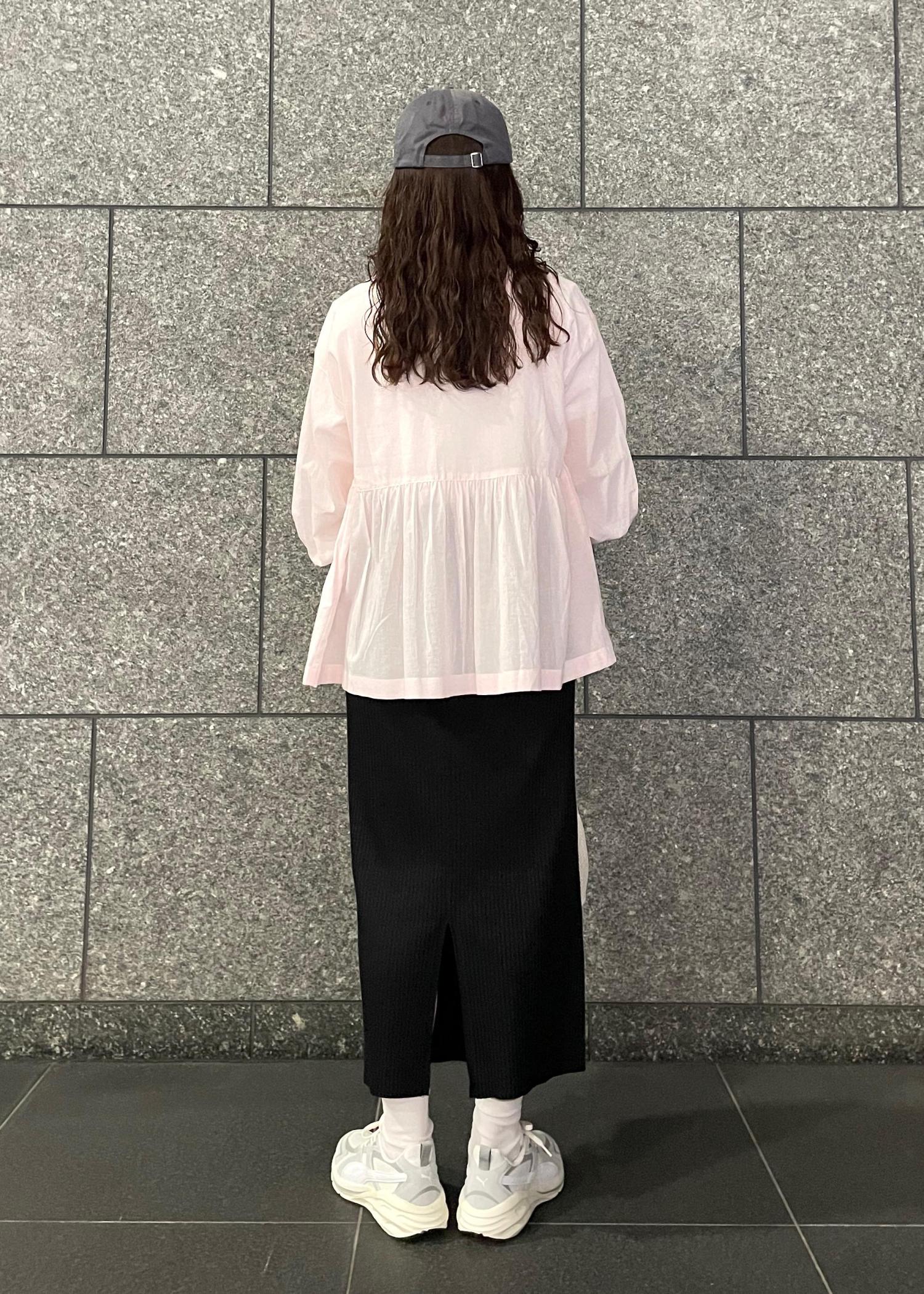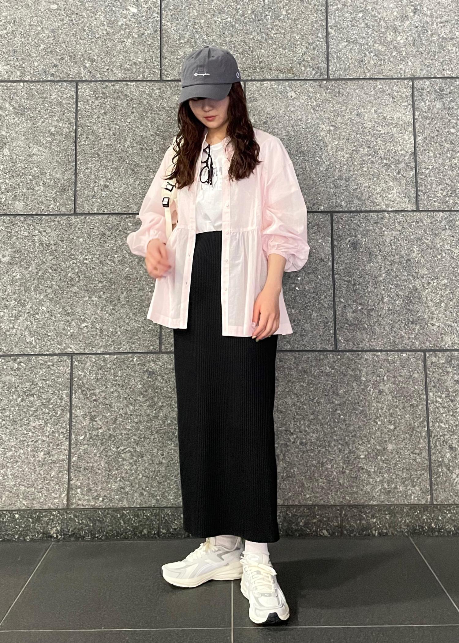 ピンクのペプラムシャツが可愛くなりすぎないように、他のアイテムはモノトーンでまとめました!