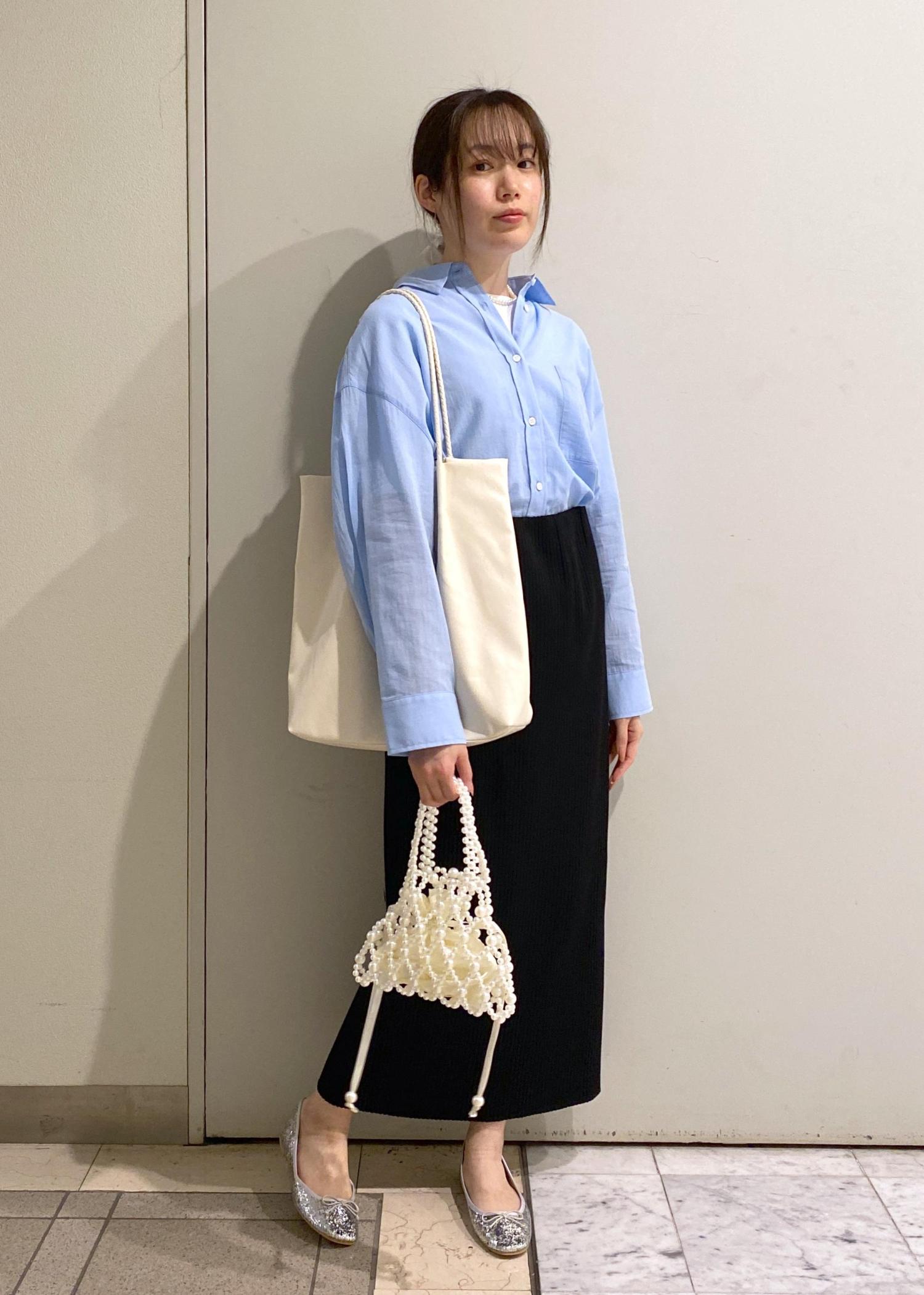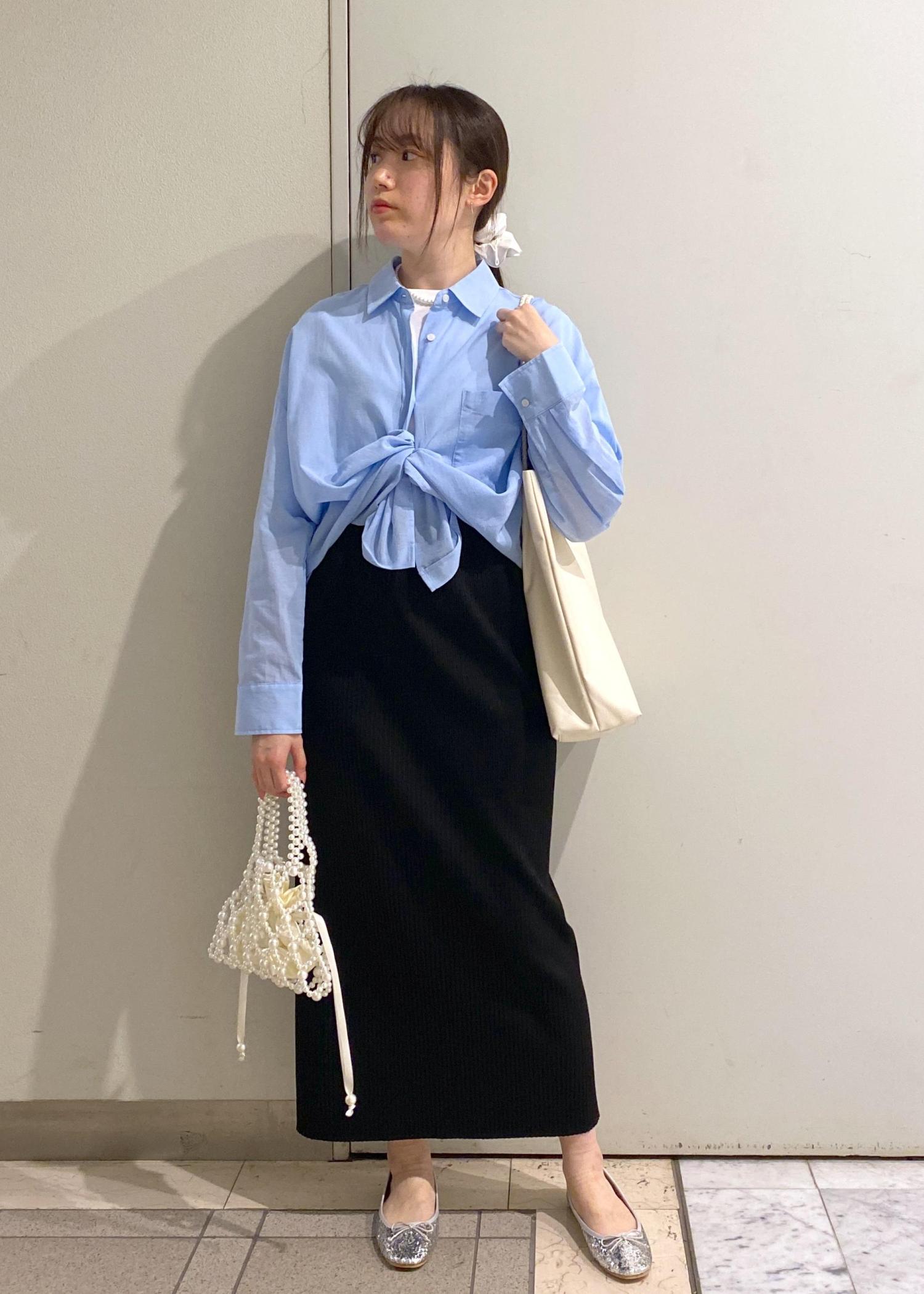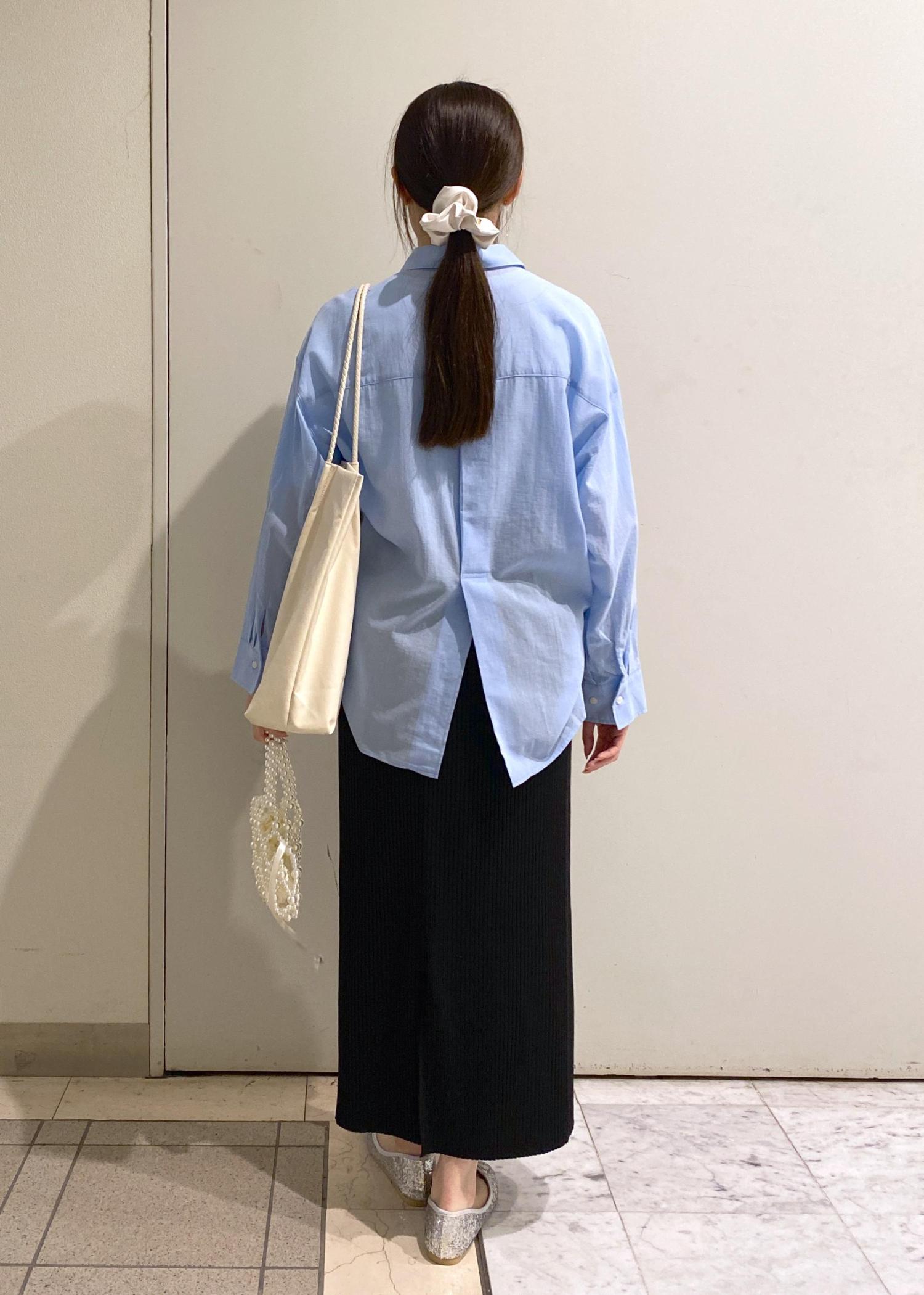 ウエストインにするとオフィスカジュアルに。シャツアレンジは水色担当さんの推し活コーデに。