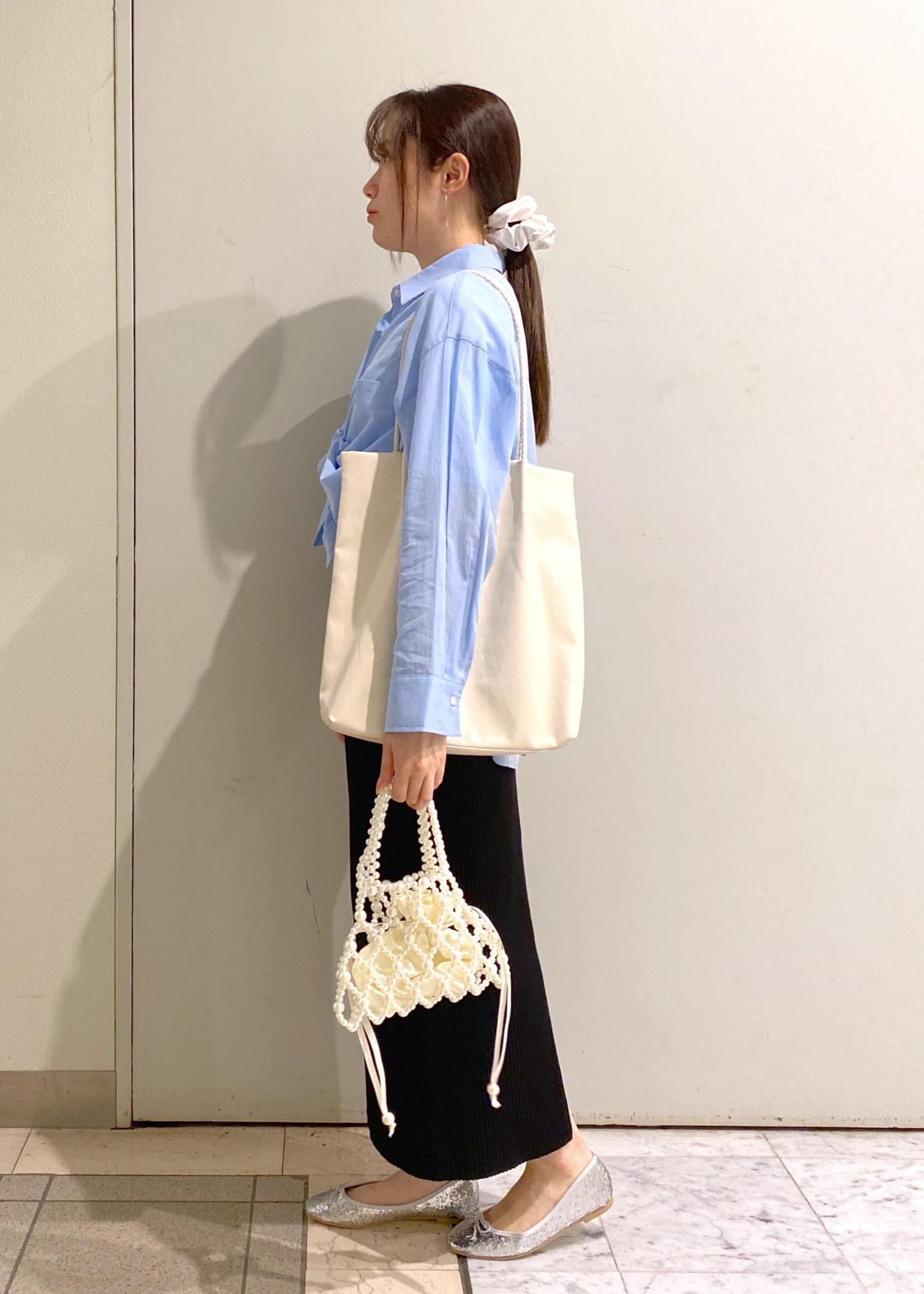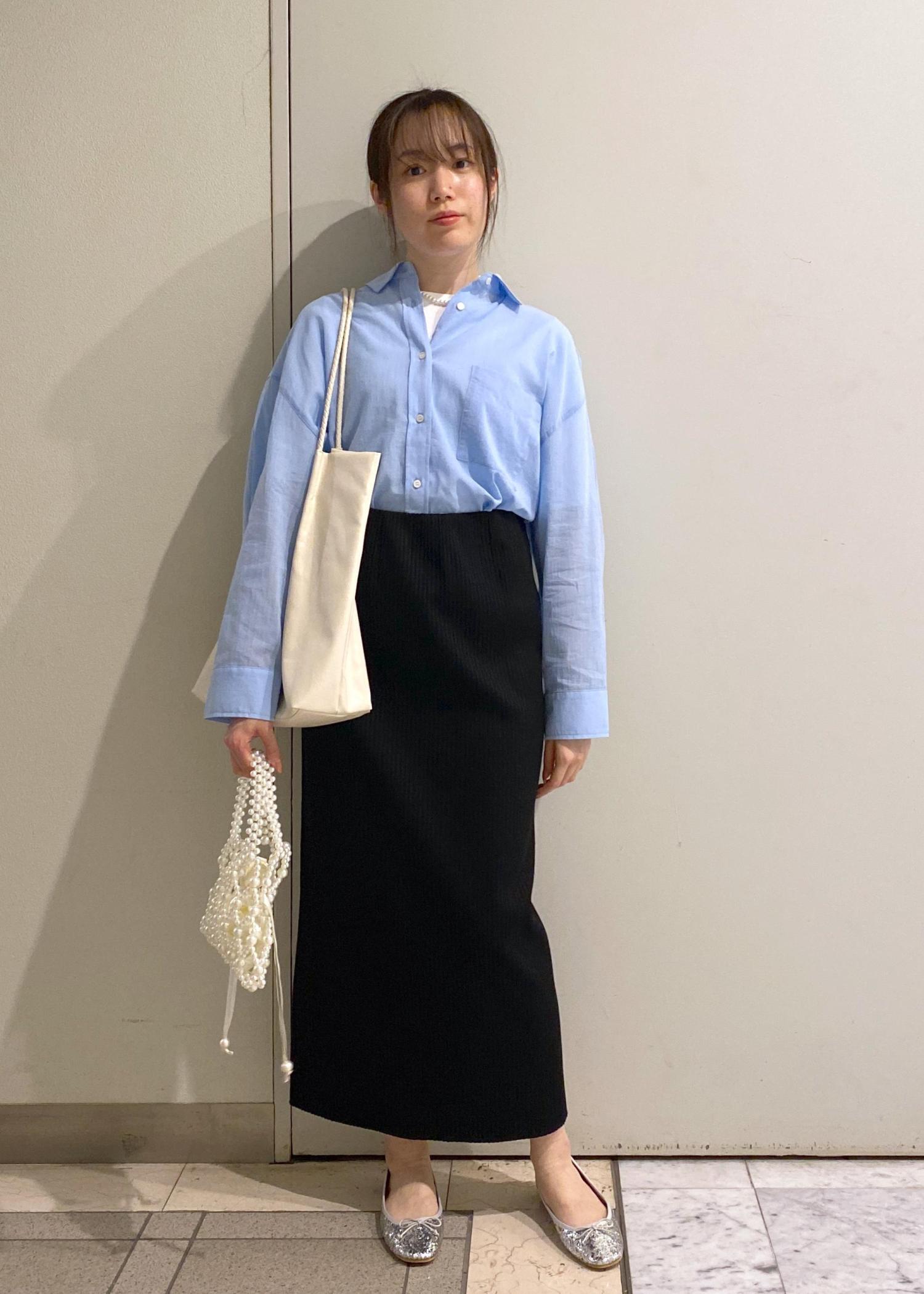 トップスにボリュームを出したので、ボトムスはIラインのスカートを合わせてスタイルアップ効果も⇧