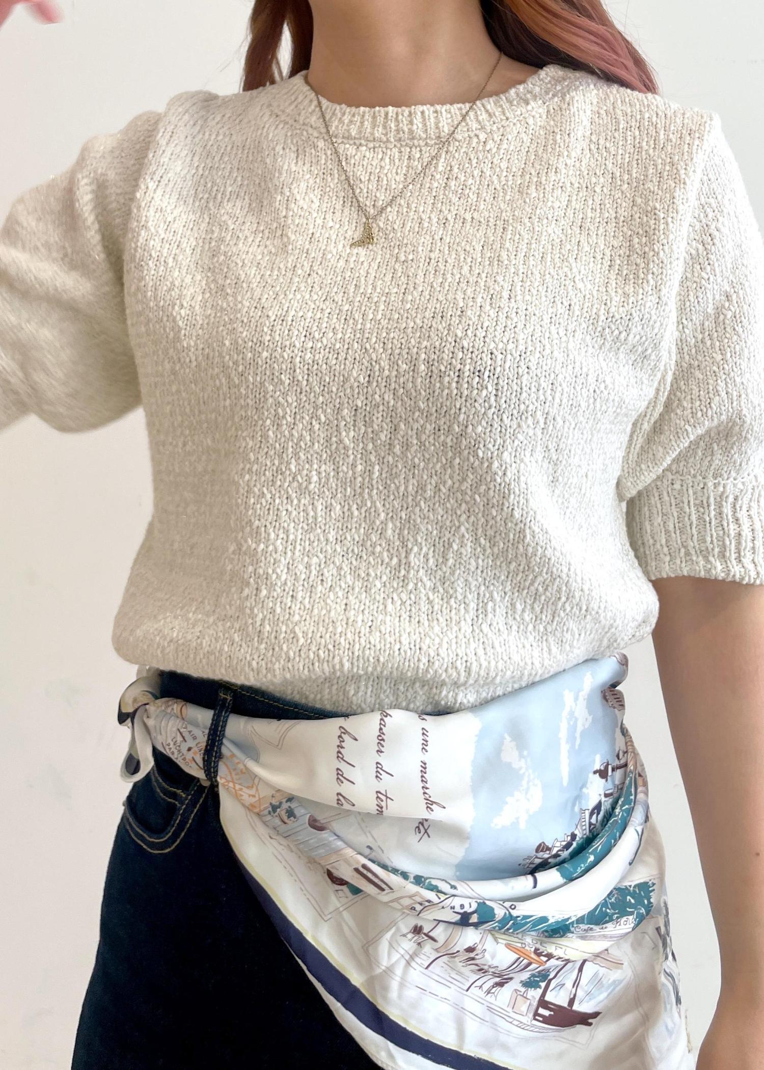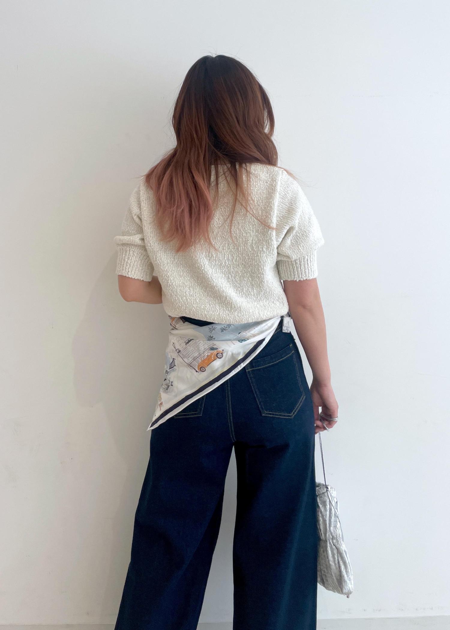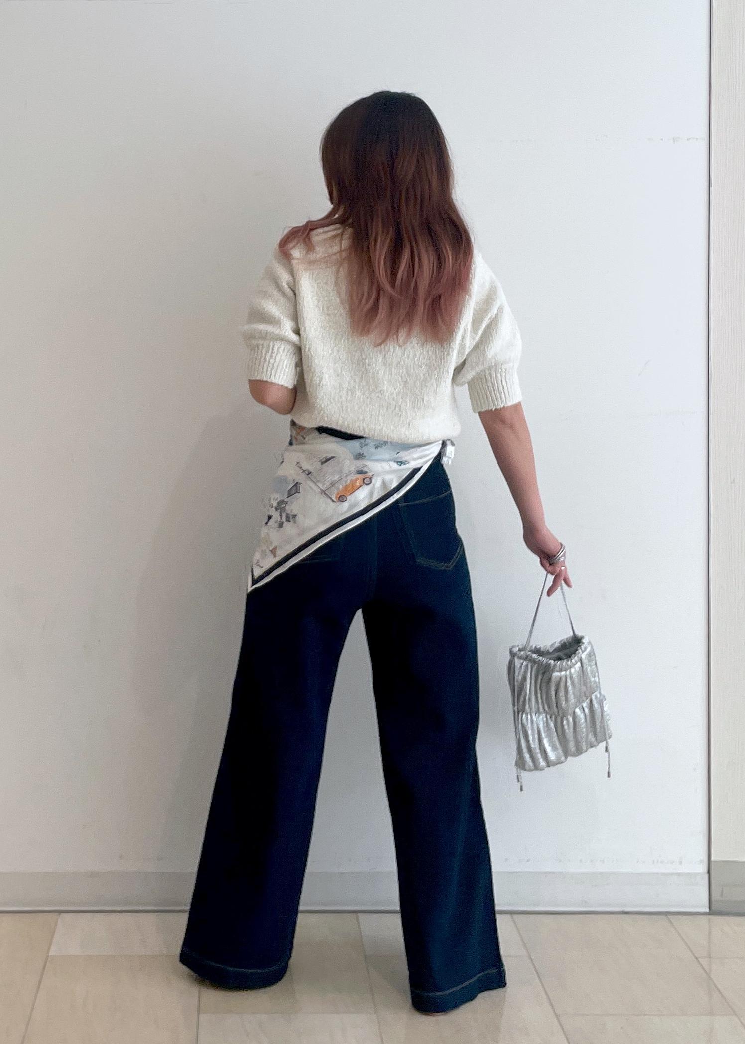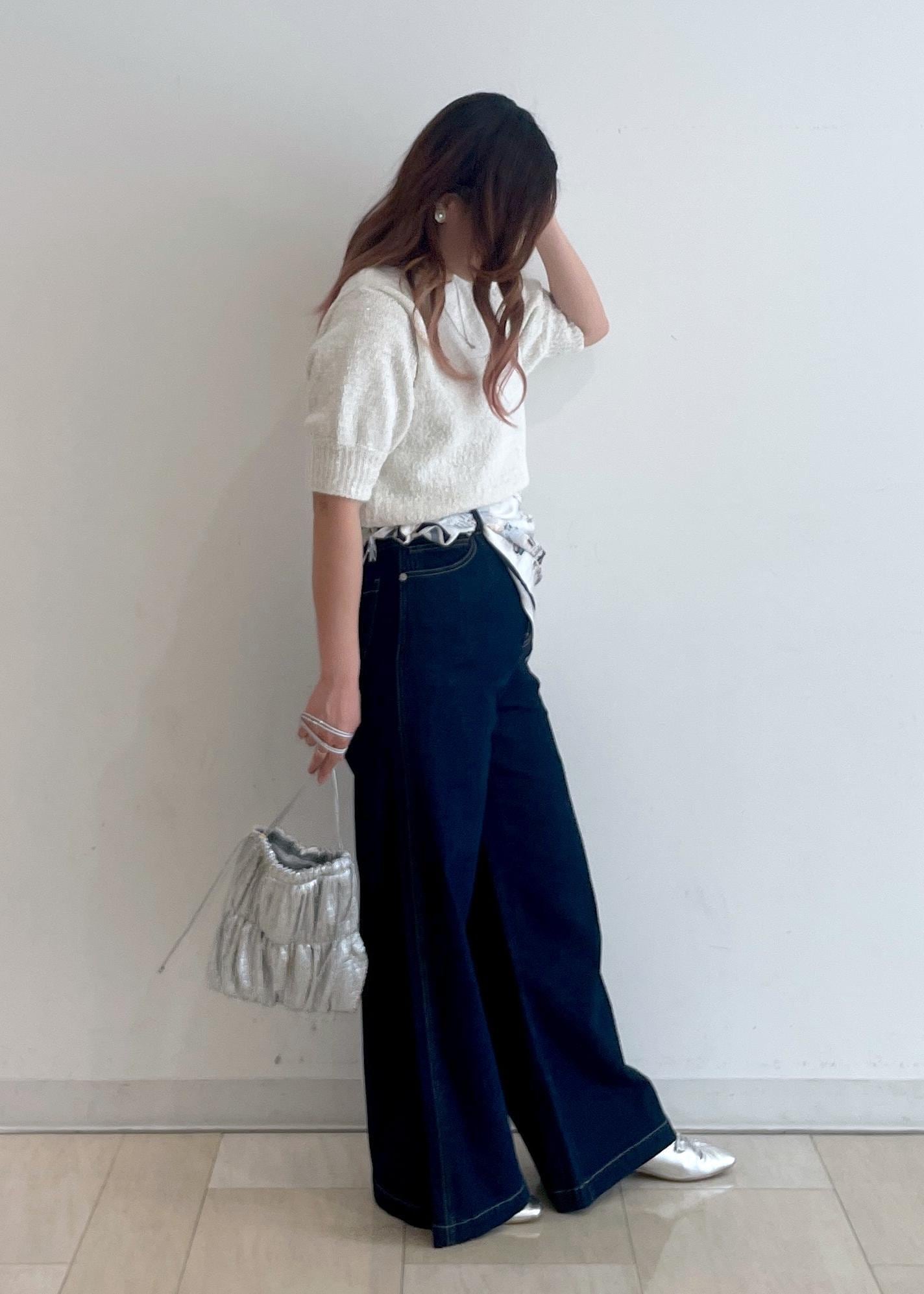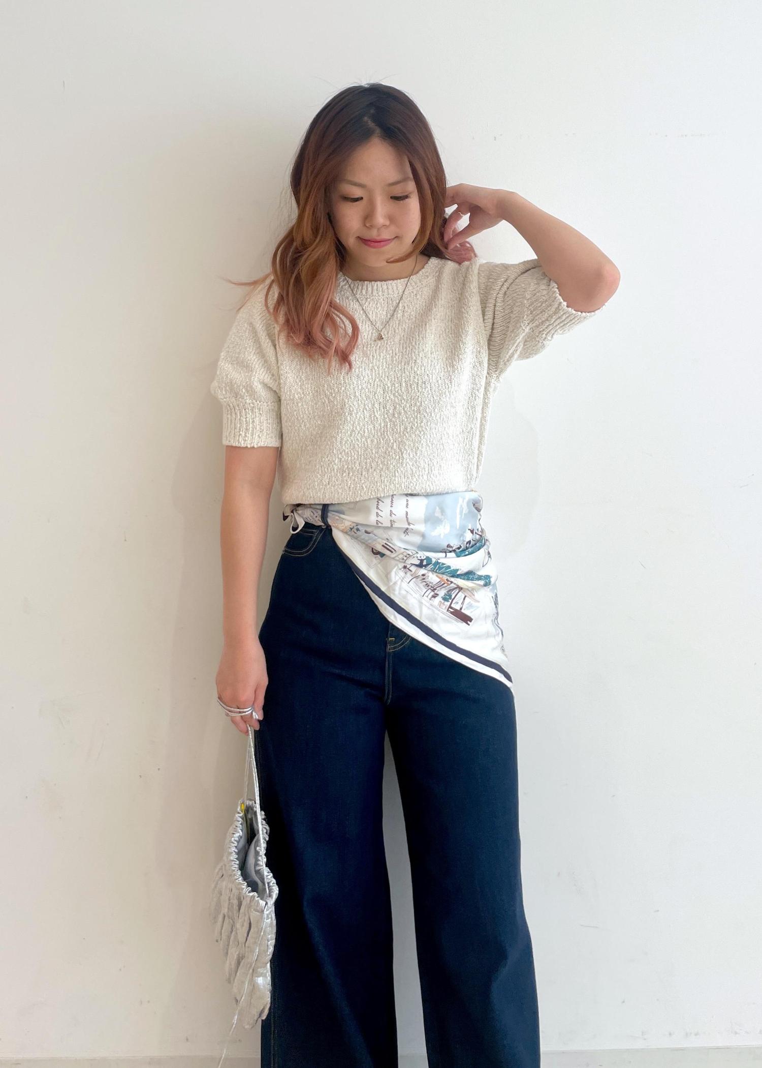 上品見えするハーフスリーブのサマーニットとデニムを合わせてシンプルキレイめコーデにしました!