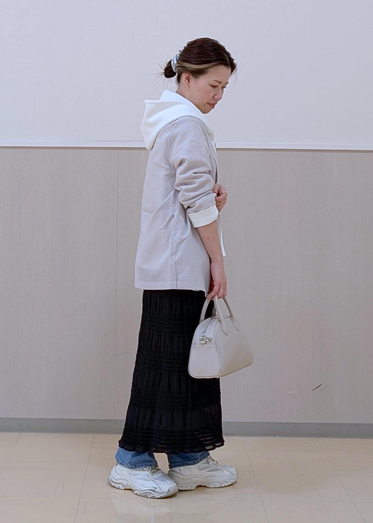 パーカーはダブルジップなので、中にデニムビスチェを合わせて見えても可愛いスタイリングにしました。