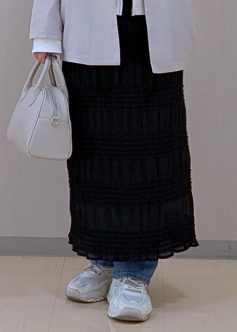 そして、プリーツとフリルがあることでヒップラインを拾いにくいという特徴があるので、デニムとのレイヤードスタイルでもすっきり見せてくれます♪