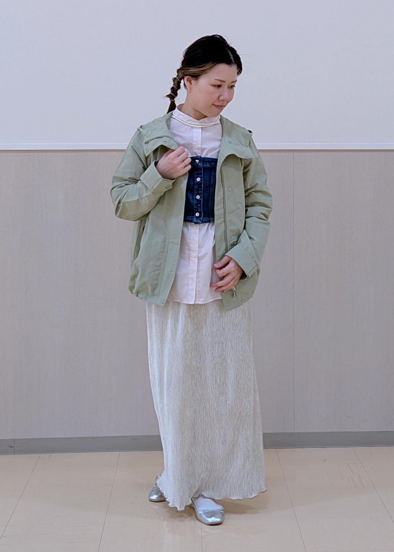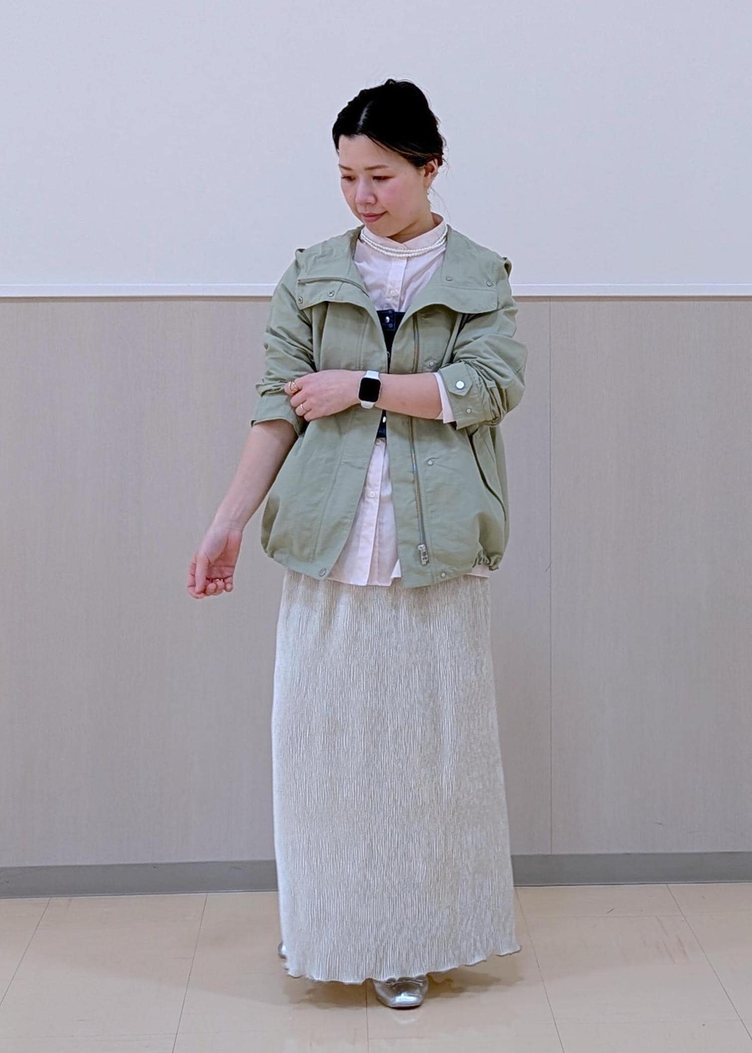 私の身長だとスカート丈がギリギリ足首になるので、上に着るものは腕まくりをすることで、肌見せのバランスが整うので、小柄さんは腕まくり必須です♪