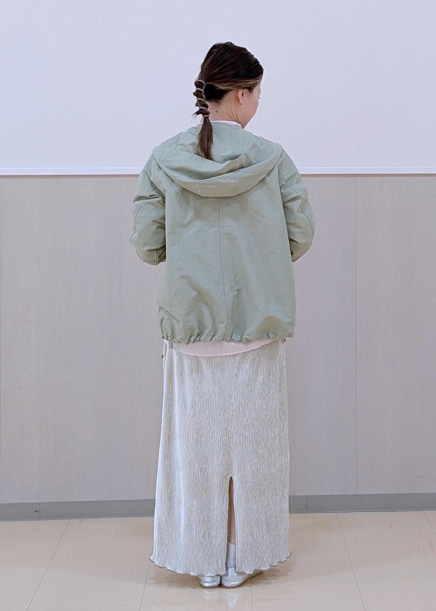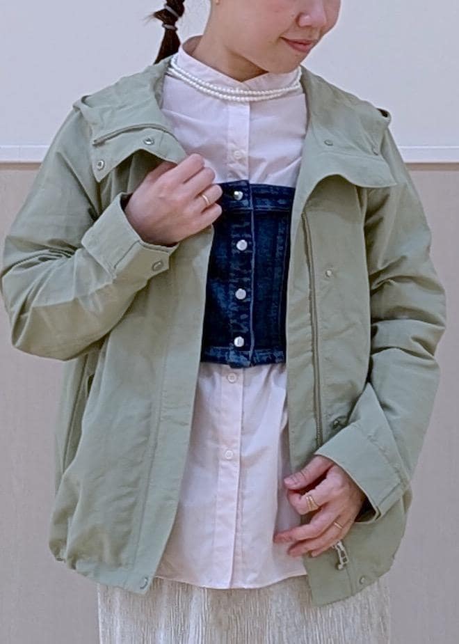 ベーシックなマウンテンパーカーに、少しフェミニンな要素をプラスしたレイヤードスタイルにしてみました♪