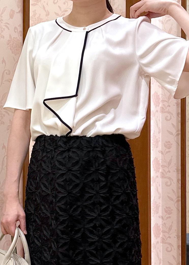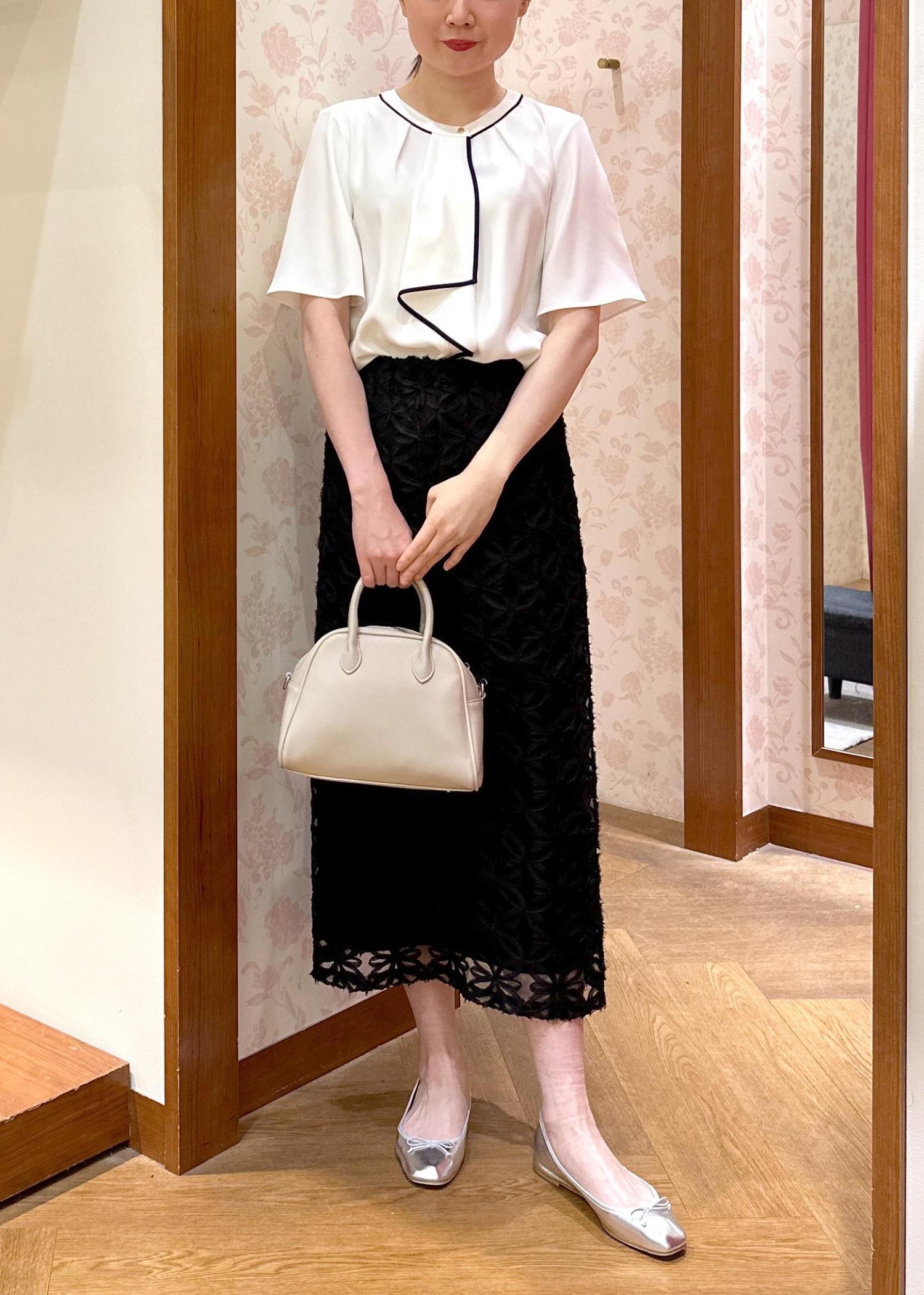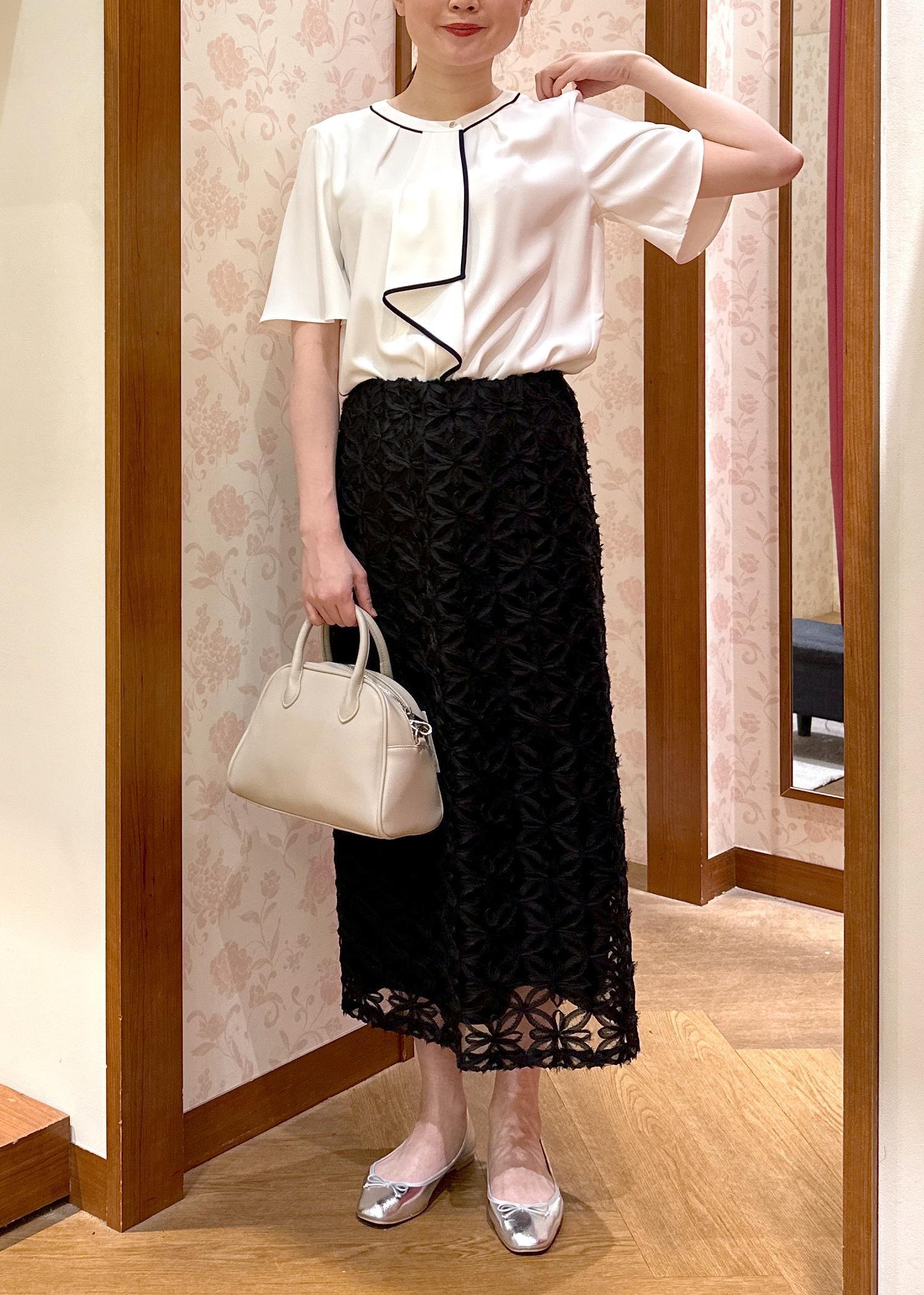 体型カバーができるさらっと心地よいブラウスに、総ゴムのIラインスカートを合わせるだけでメリハリが付き、着心地も抜群です◎