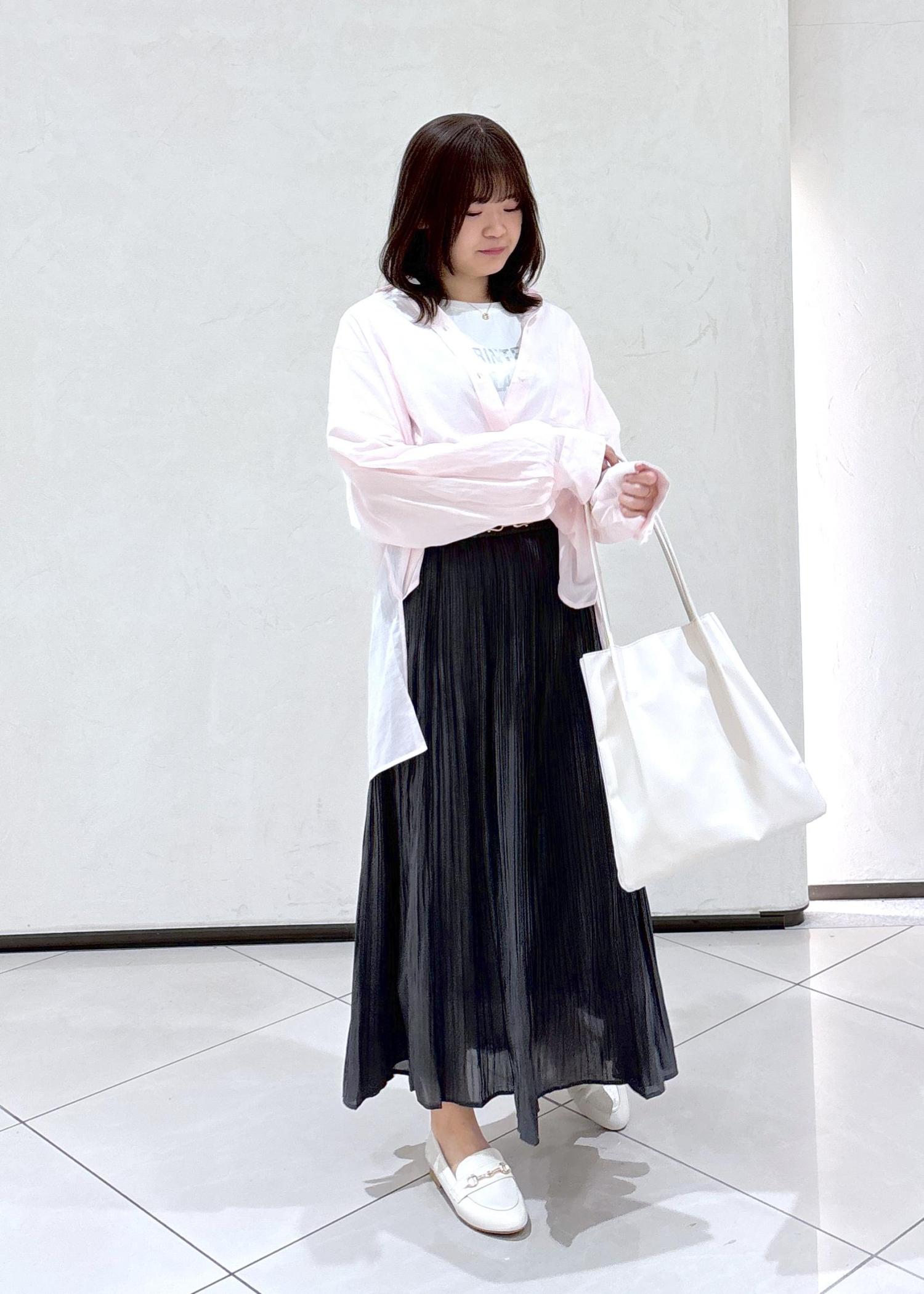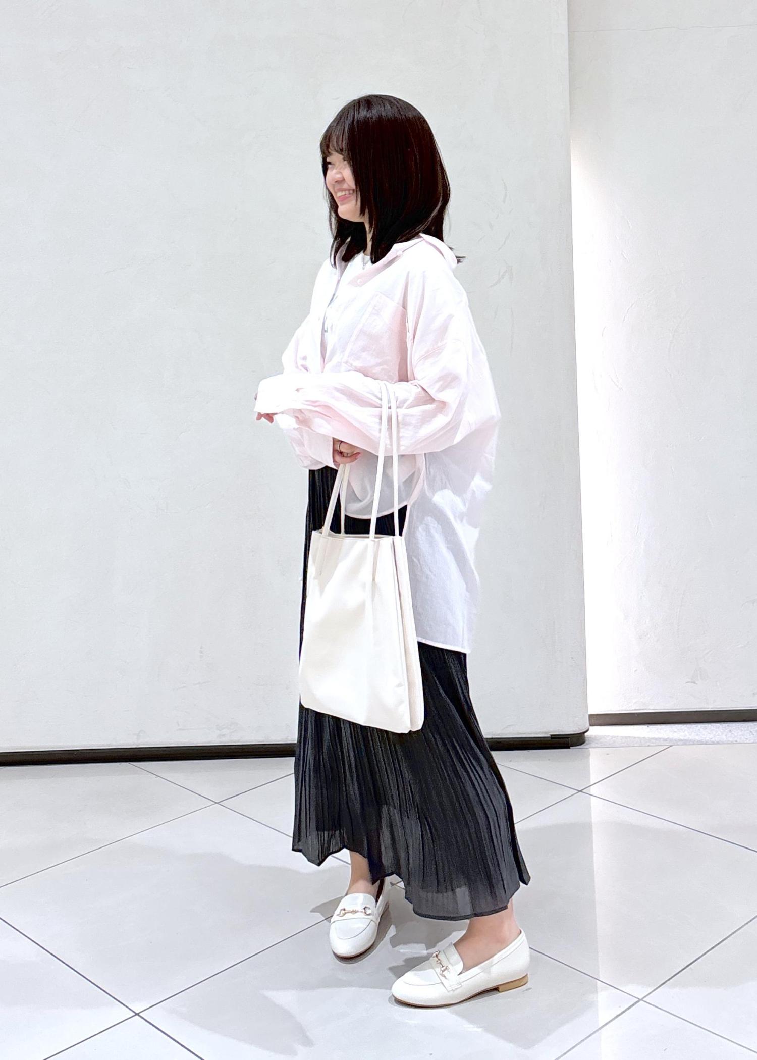 ピンクの淡い色味に締め色で濃いグレーを合わせて、大人フェミニンコーデにしました!