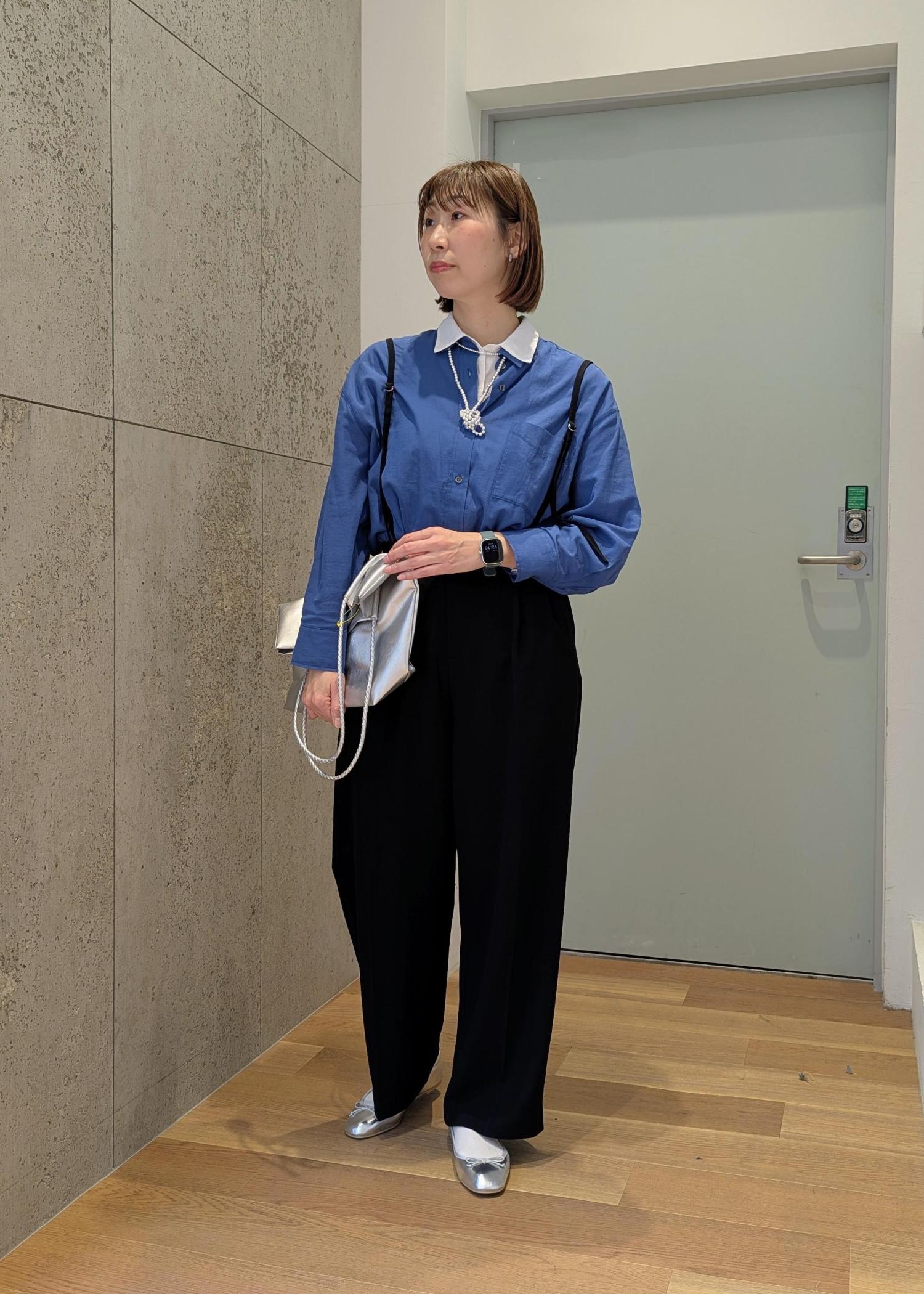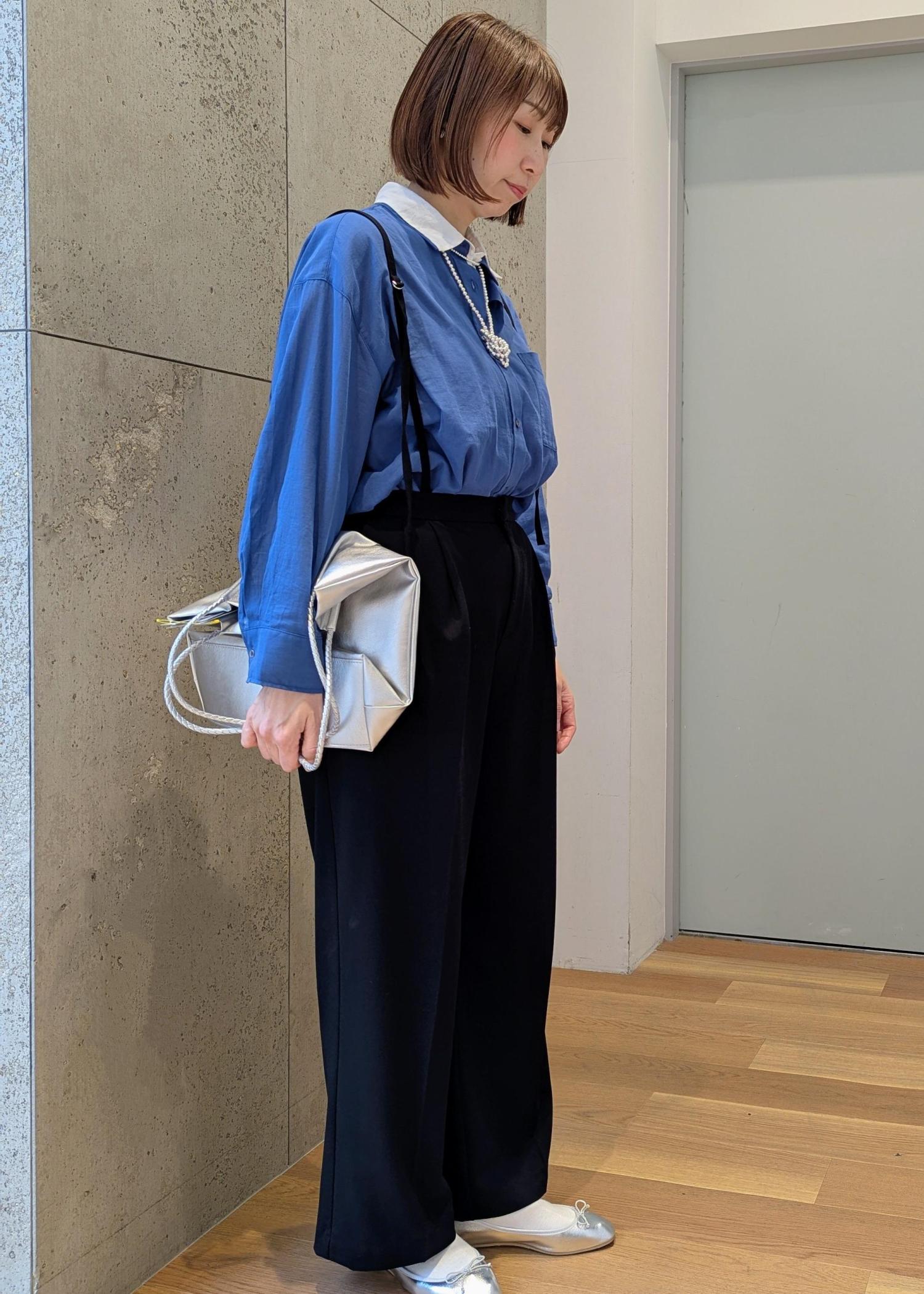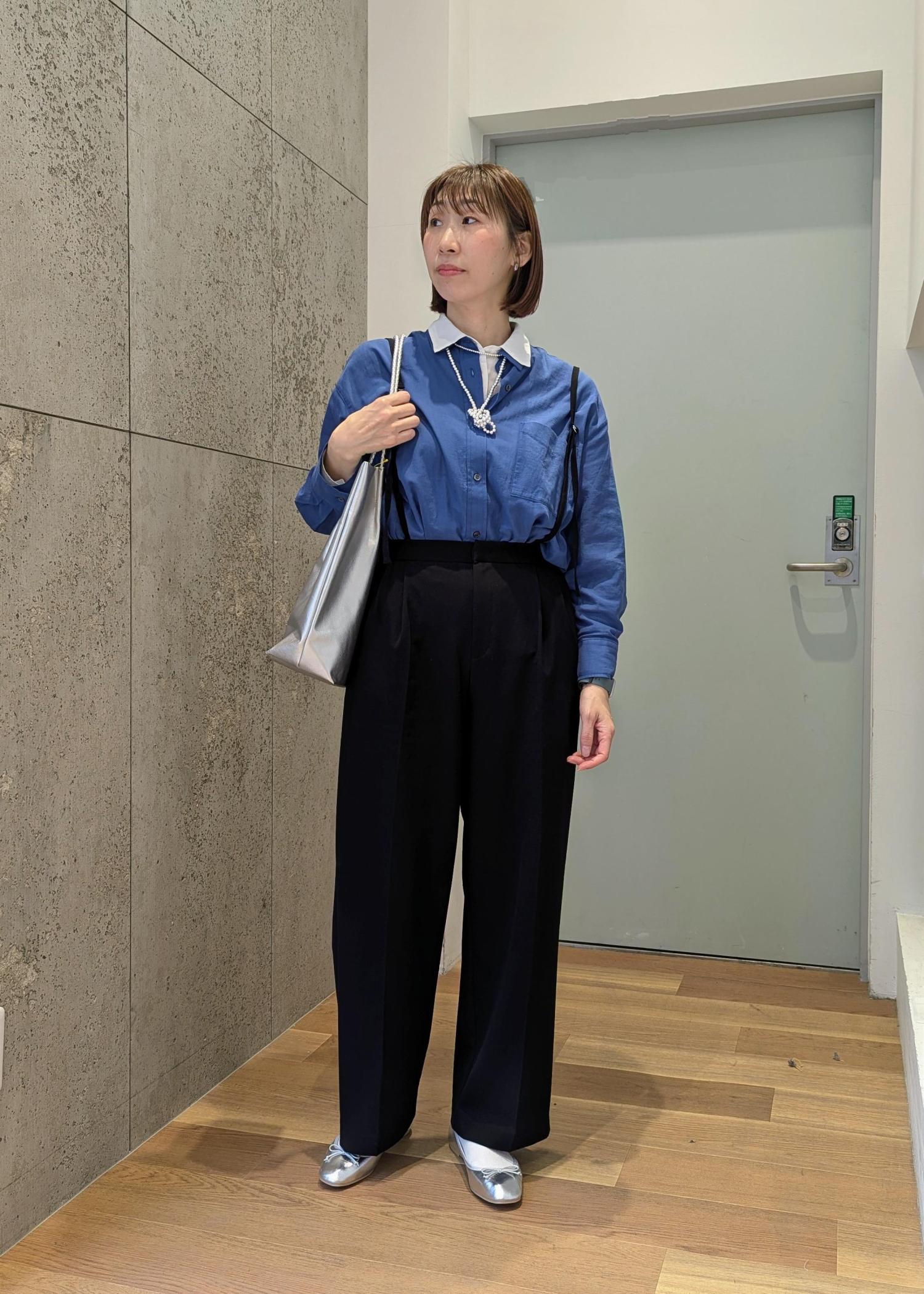 ブラック×ブルーの濃色コーデなので白シャツをレイヤードしたり、軽めのシルバー小物を合わせて抜け感を出すのもオススメです。