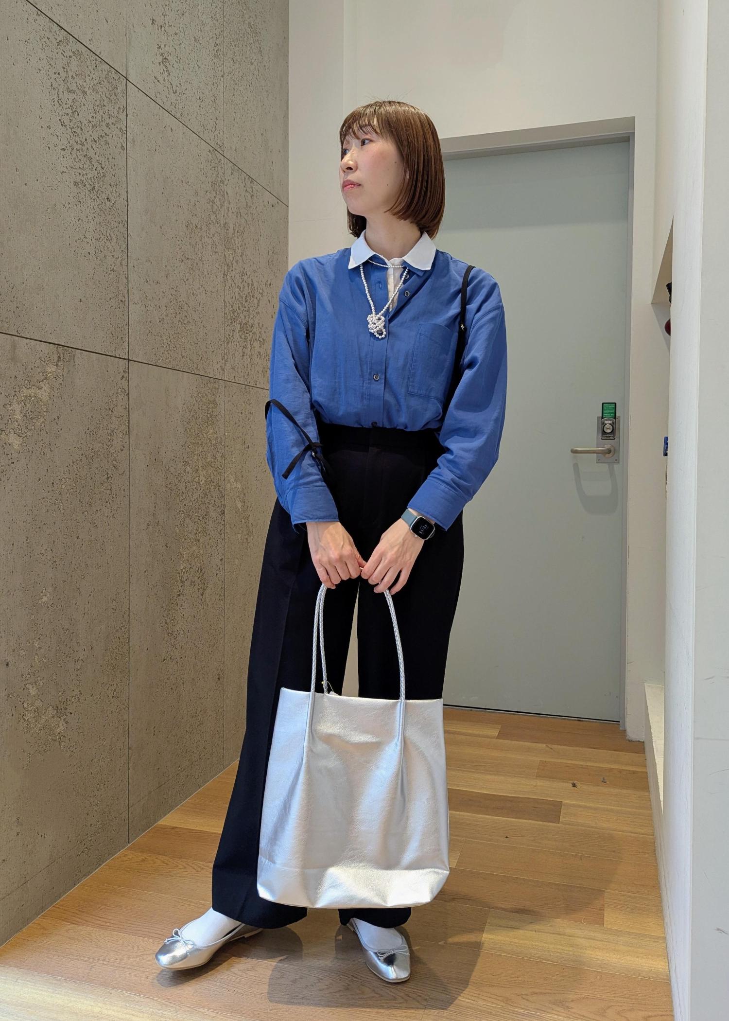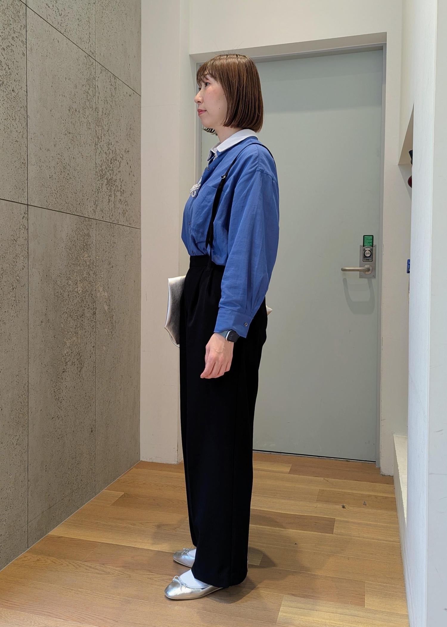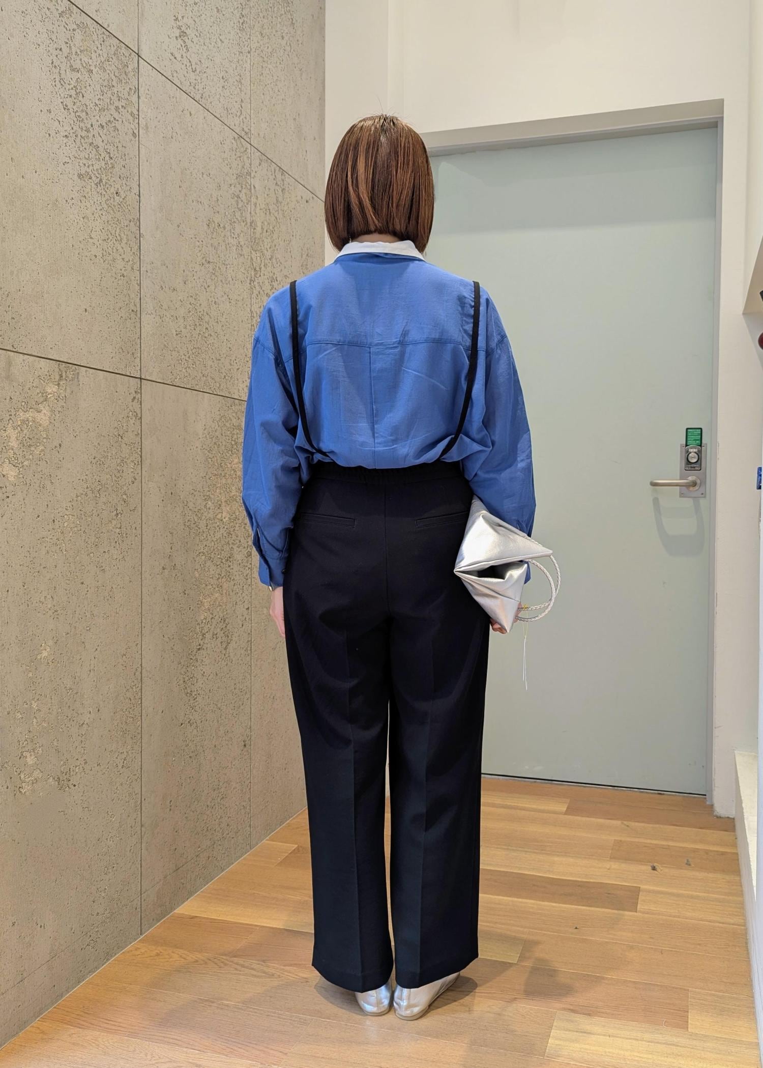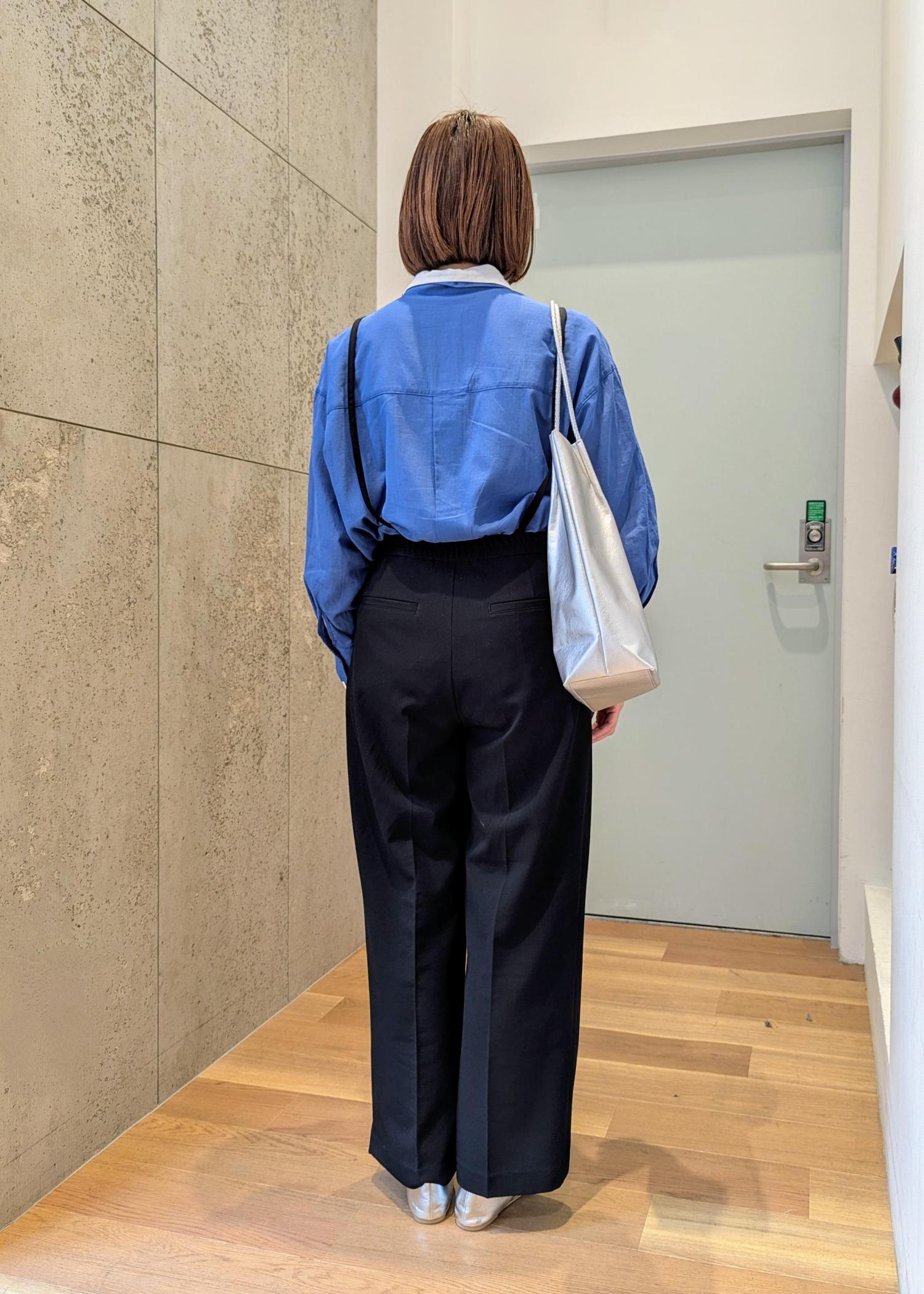 ブラック×ブルーの濃色コーデなので白シャツをレイヤードしたり、軽めのシルバー小物を合わせて抜け感を出すのもオススメです。