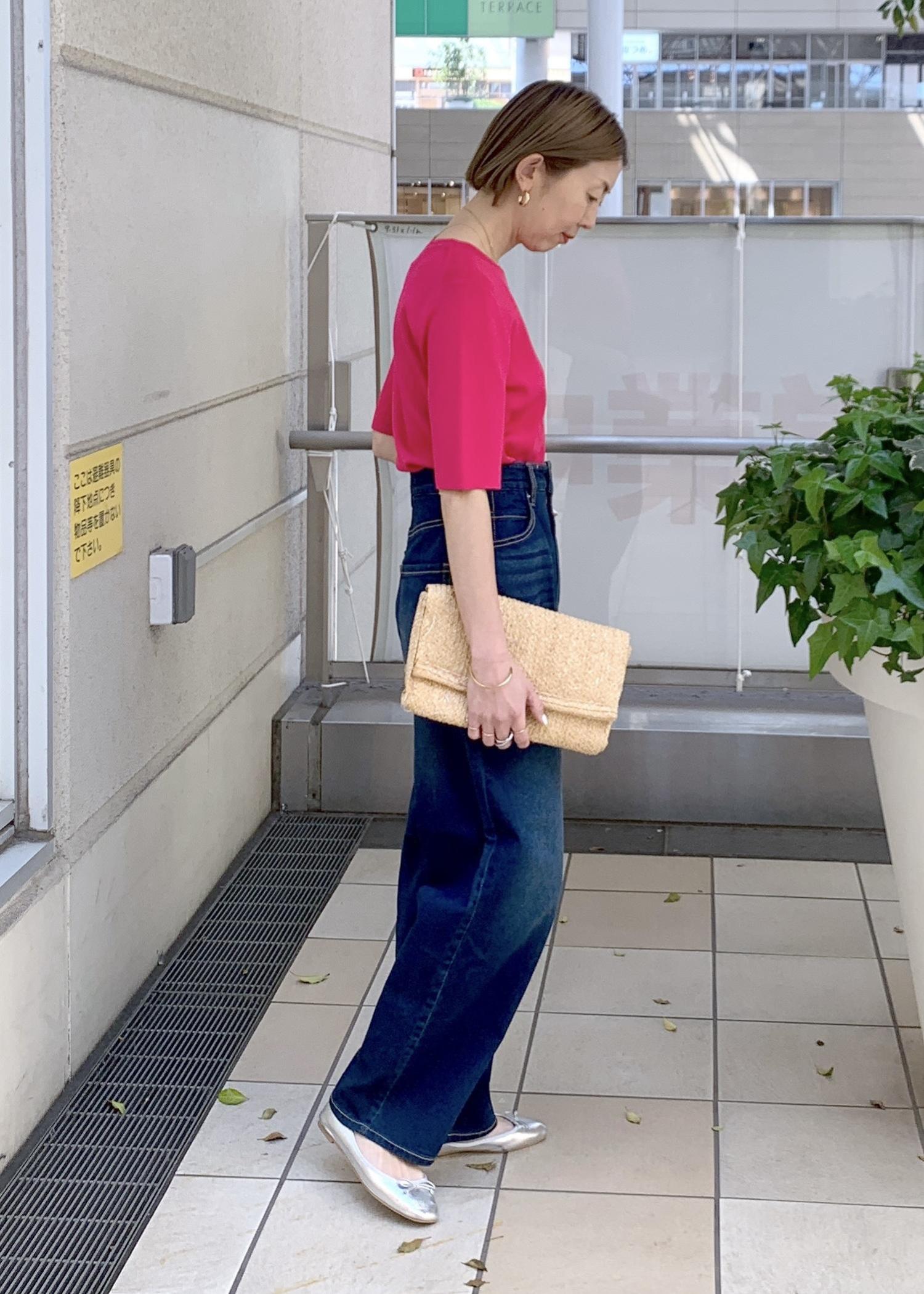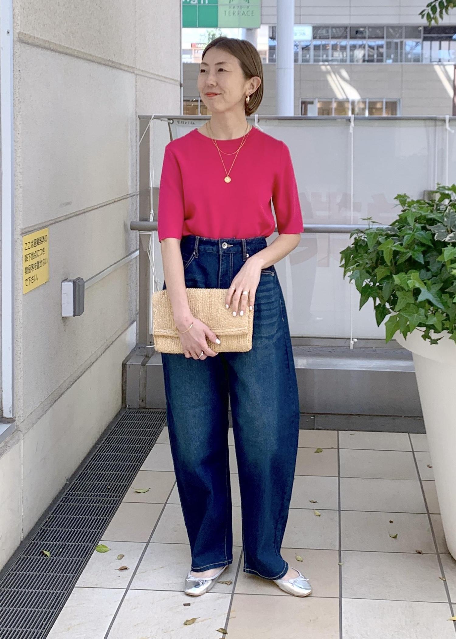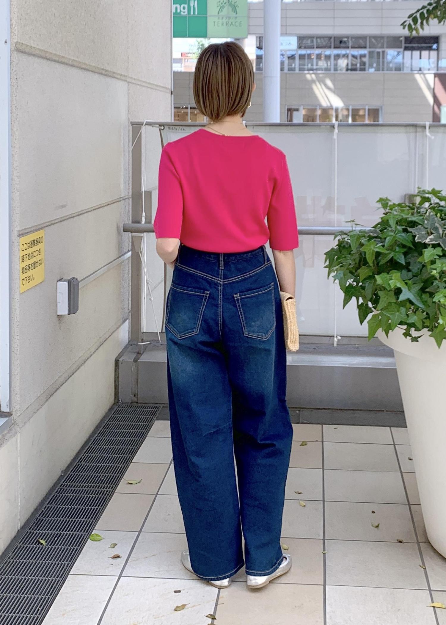 目を惹く鮮やかなピンクニットは春夏にピッタリのカラーです。