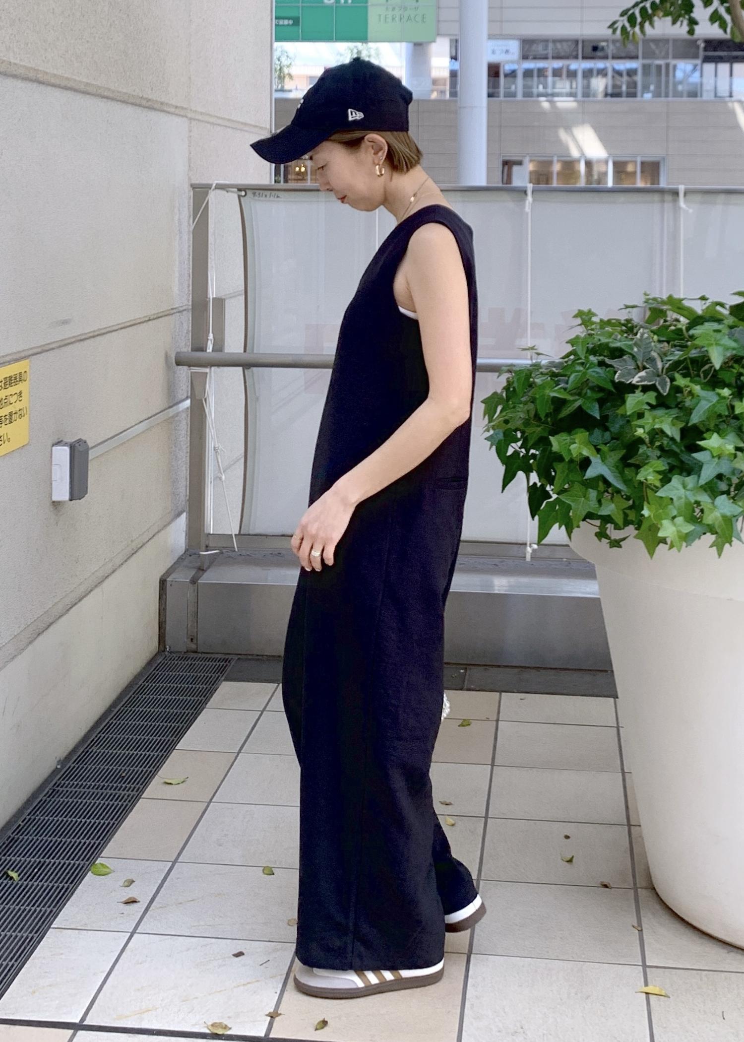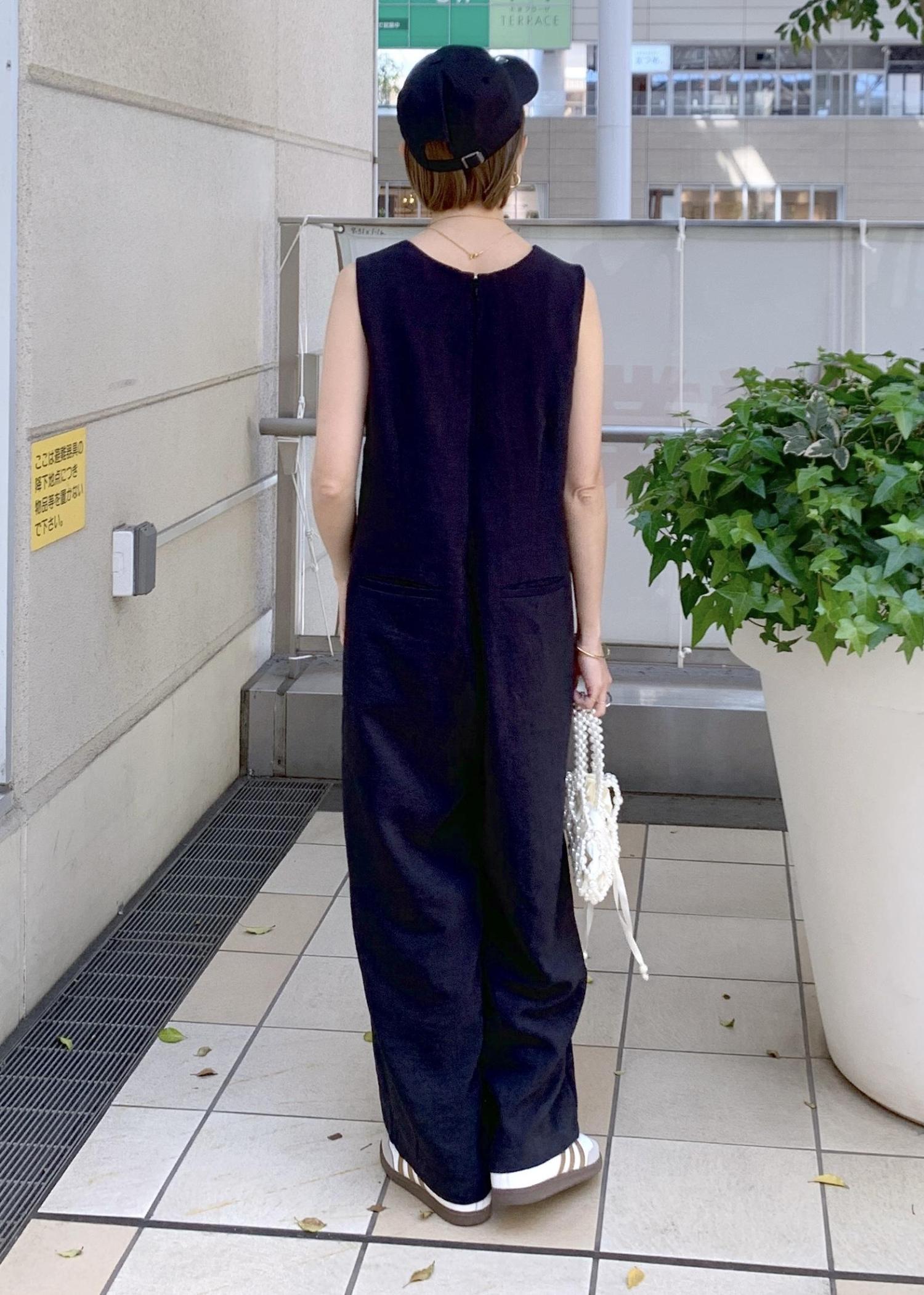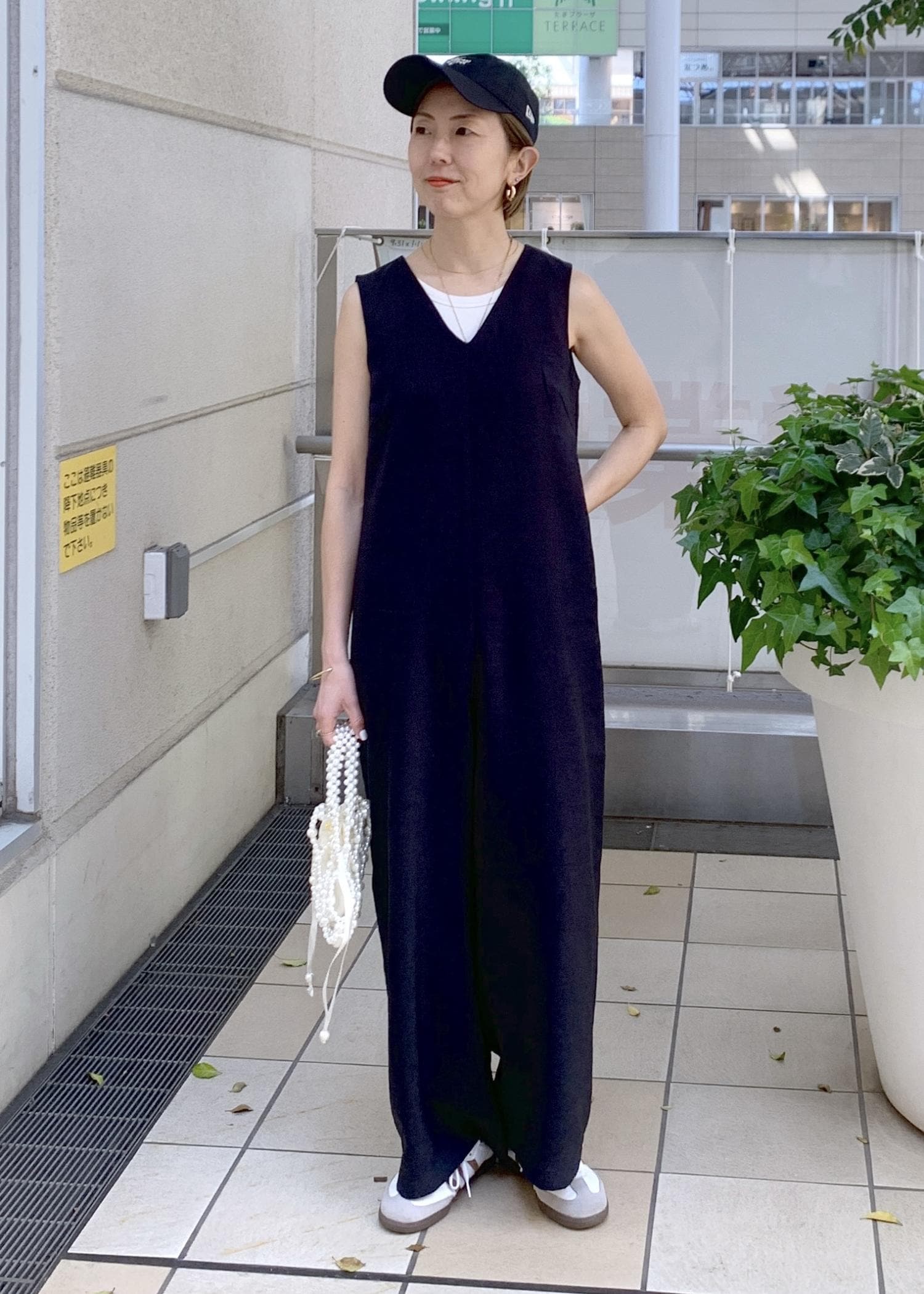 前後Vネックで首元がスッキリと見えるデザインなので、大人も着やすいシンプルなオールインワン。
