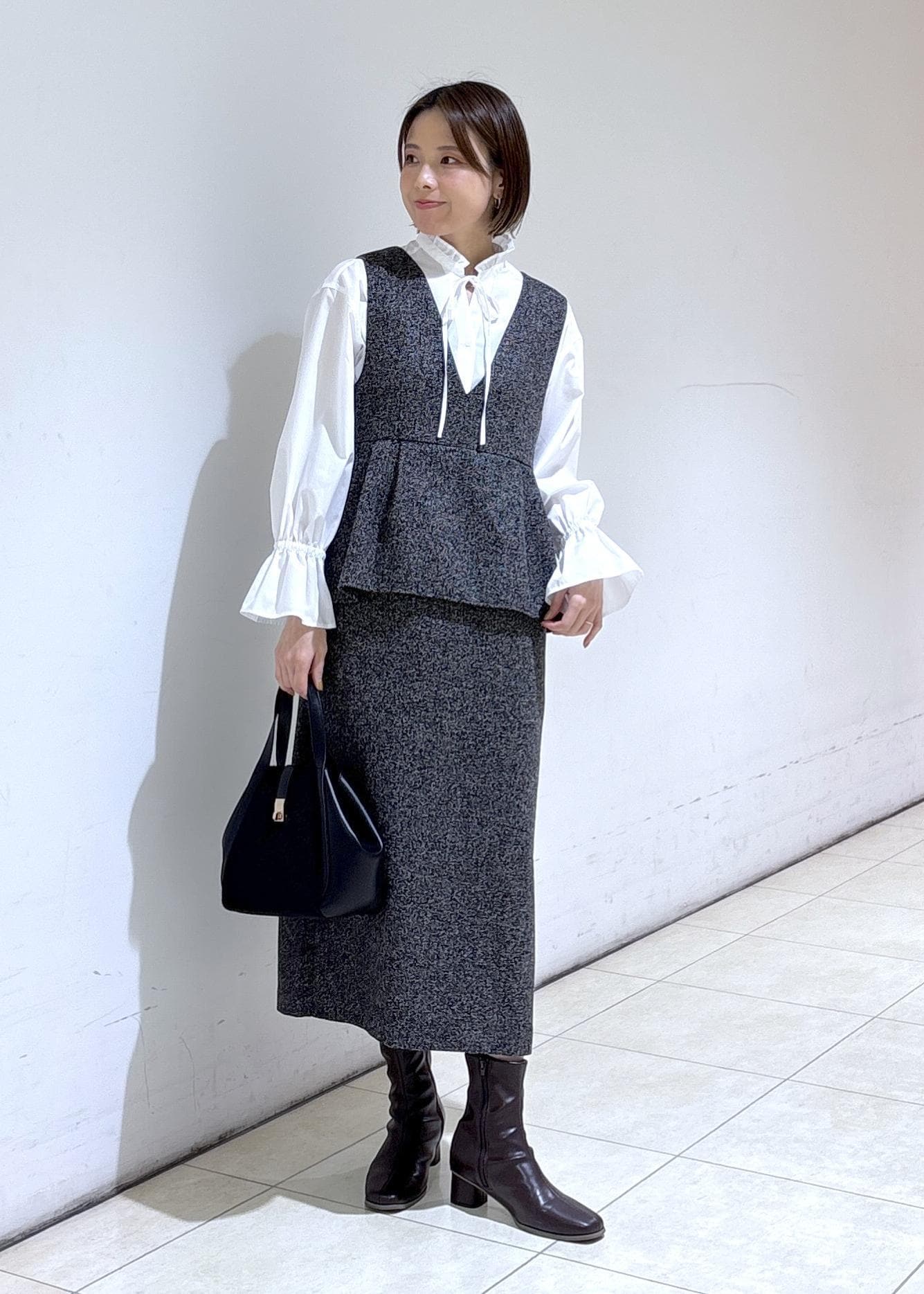 ペプラムシャツにアイラインスカートでスッキリとしたスタイリングにしました。ペプラムシャツは柔らかい綿素材なので低身長の方でもバランス良く合わせられます。