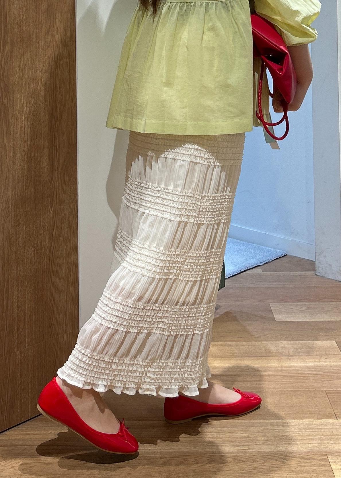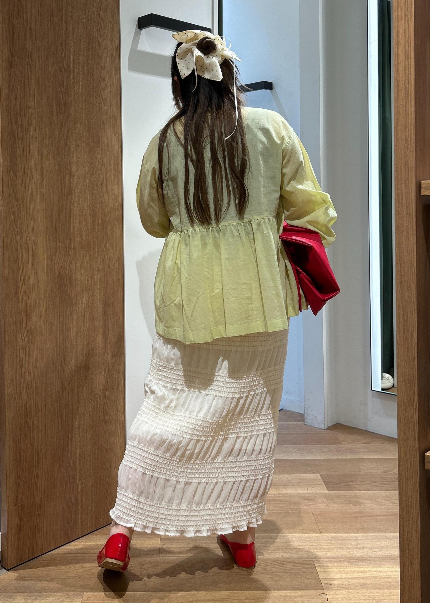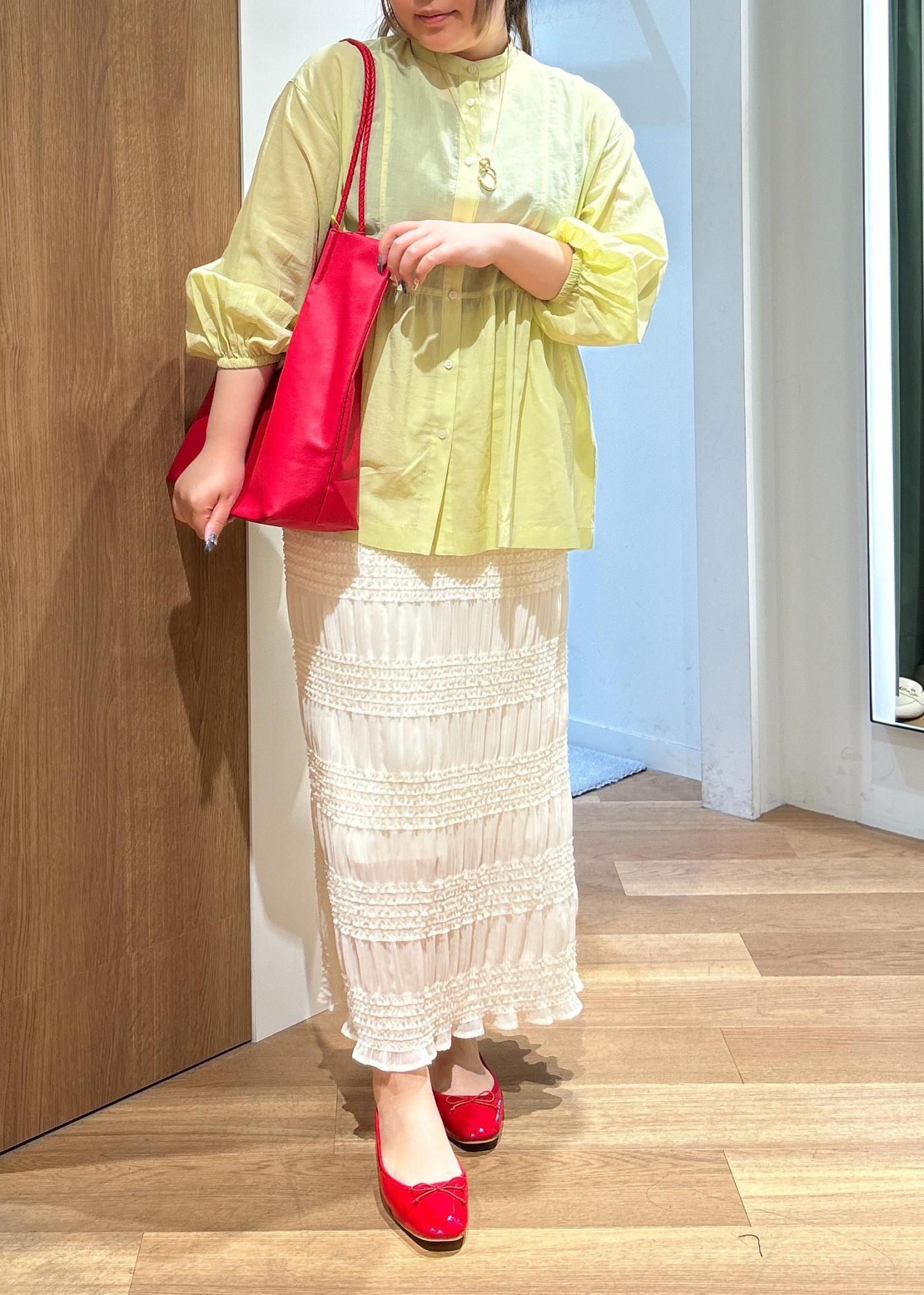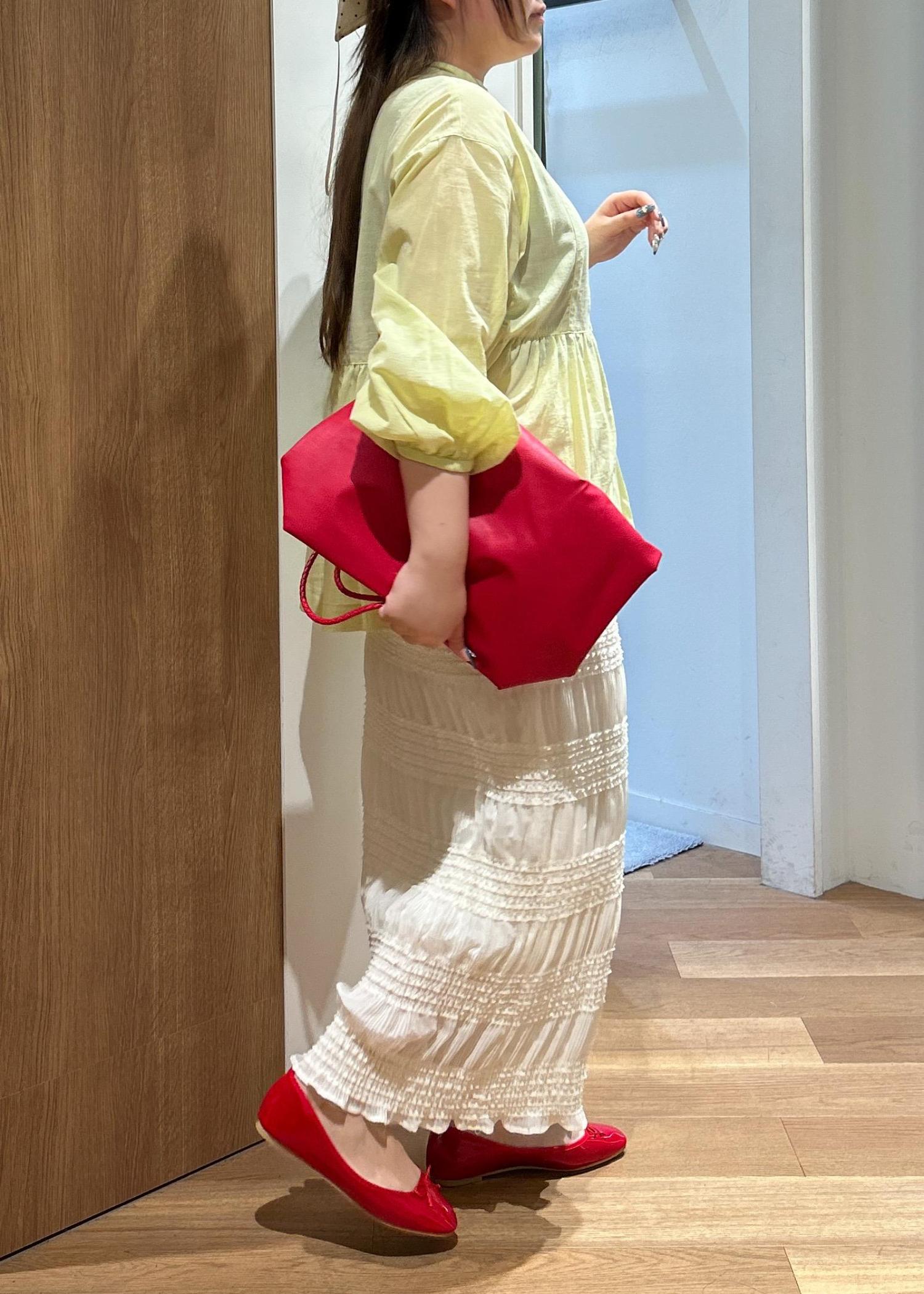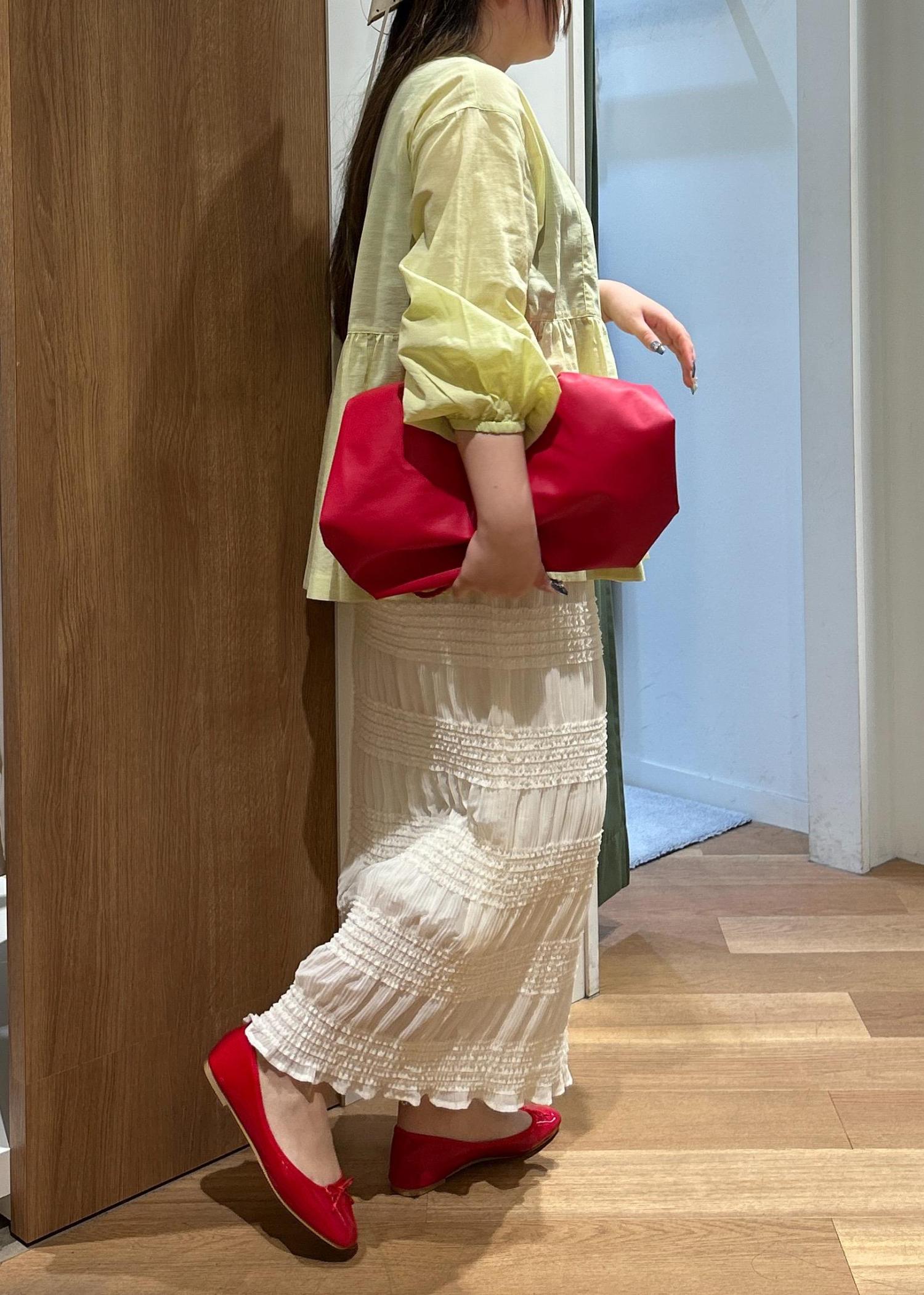 ペプラムシャツとくしゅっとスカートをレッドのワンポイントカラーでまとめてみました!