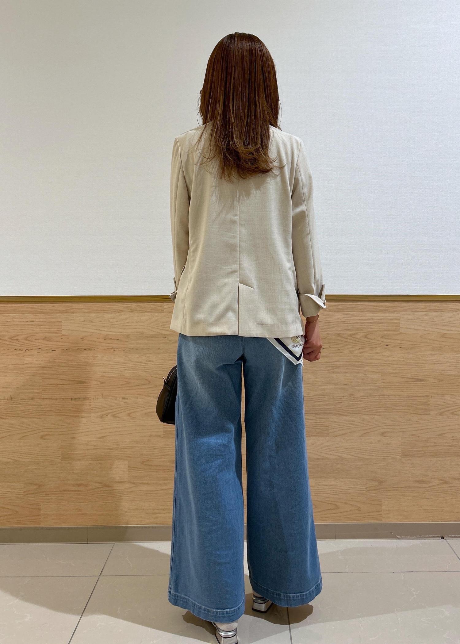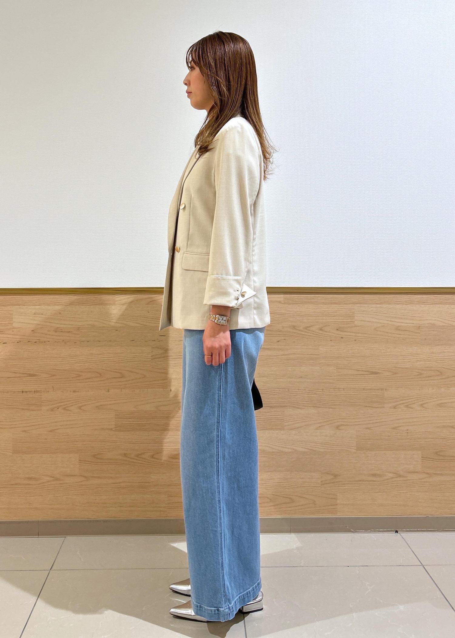 薄手の金ボタンジャケットにデニムを合わせたキレイめカジュアルなコーディネートです。