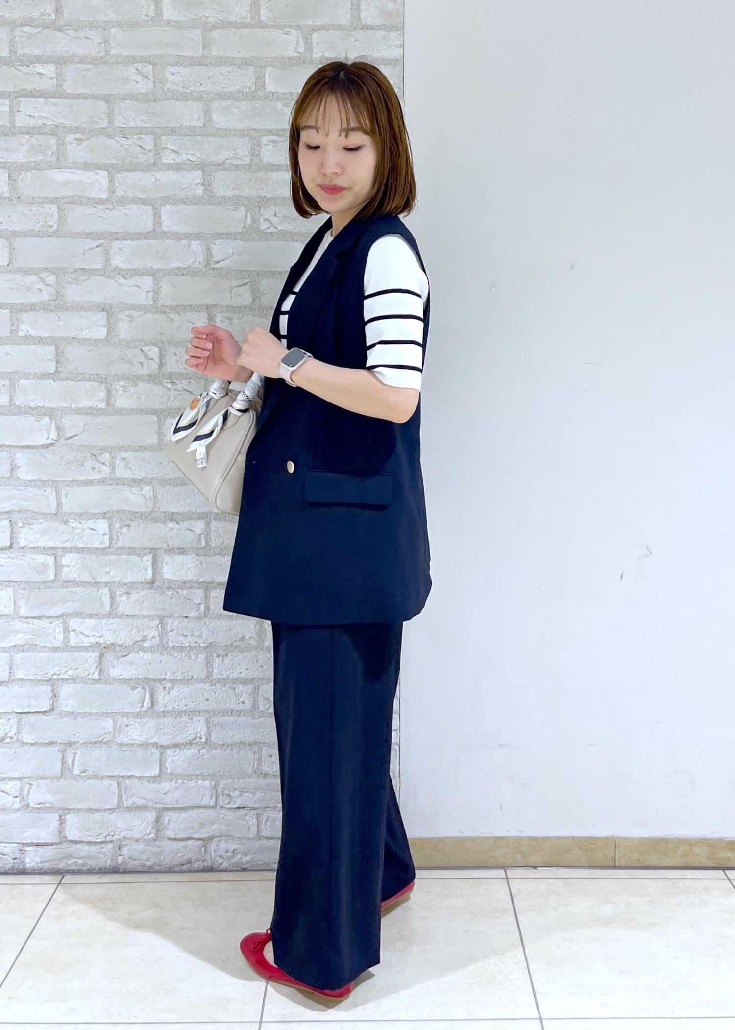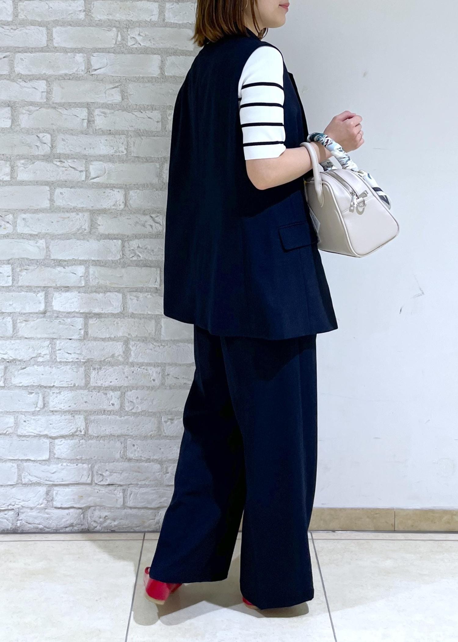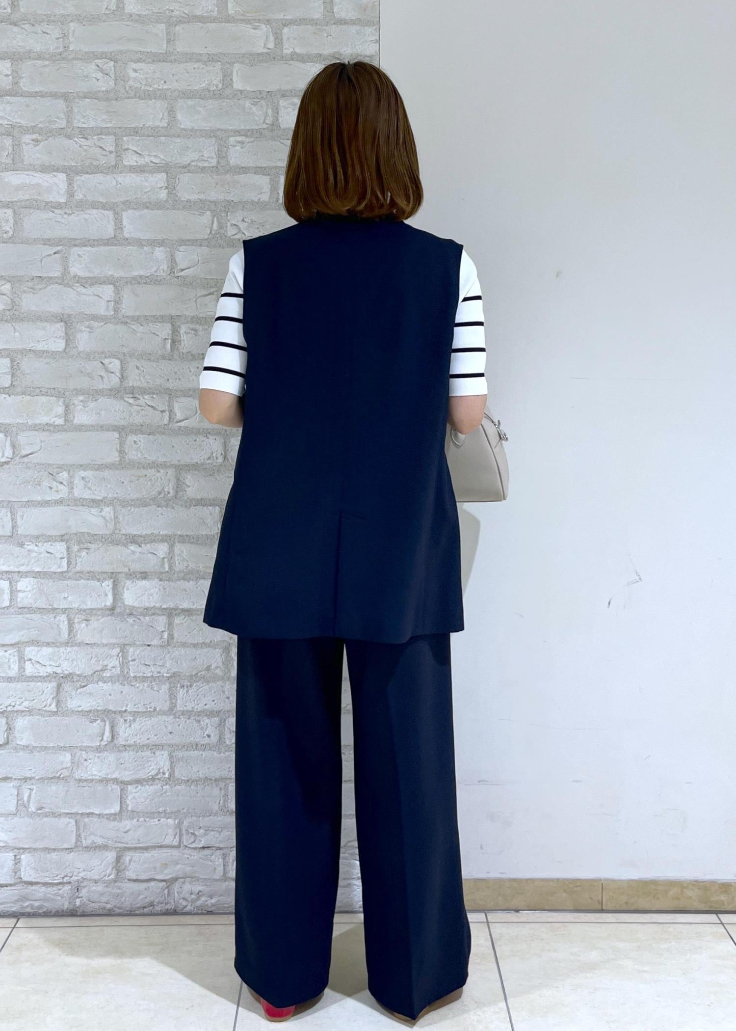 シンプルなニットにセットアップのジレとパンツで合わせた大人カジュアルコーデ♪
