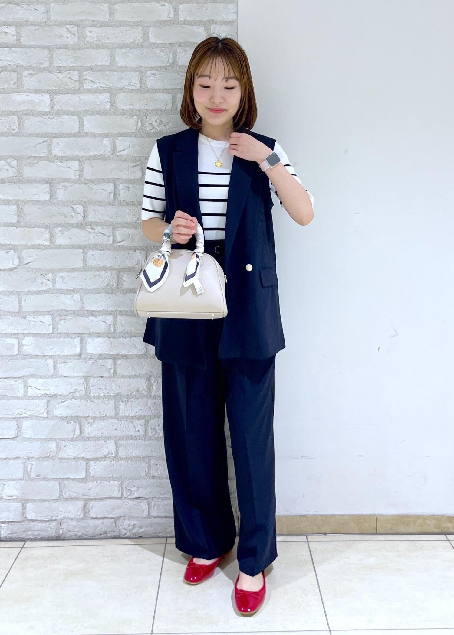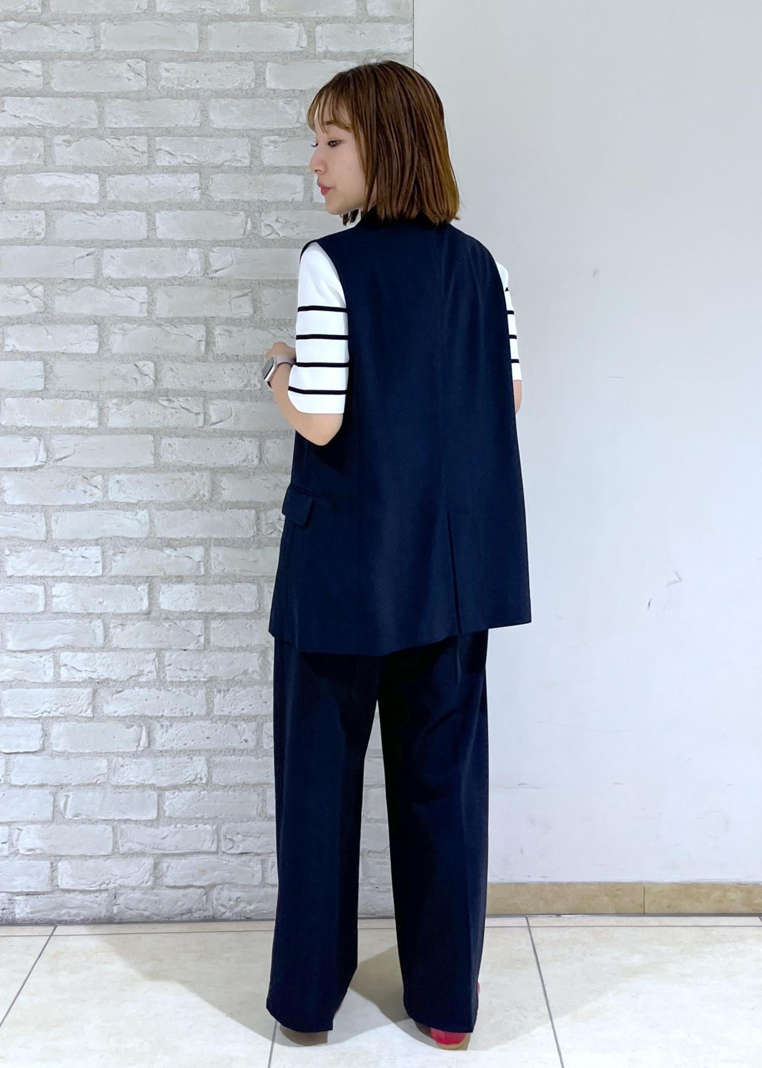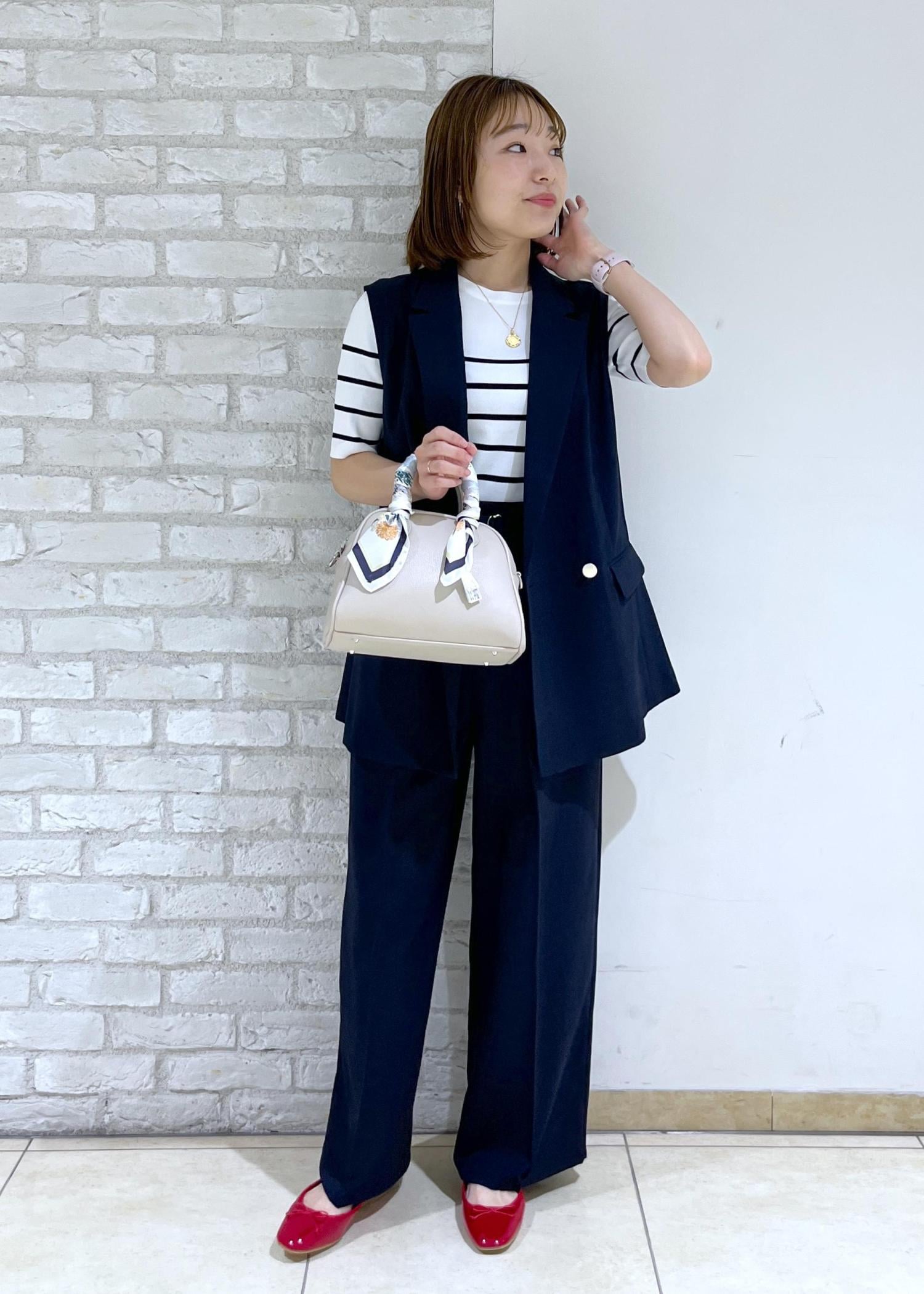 シンプルなニットにセットアップのジレとパンツで合わせた大人カジュアルコーデ♪