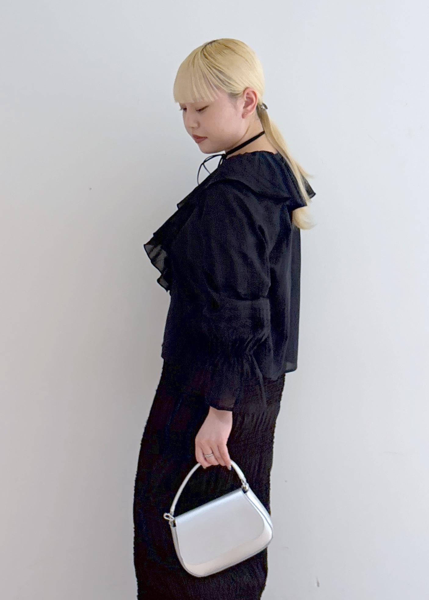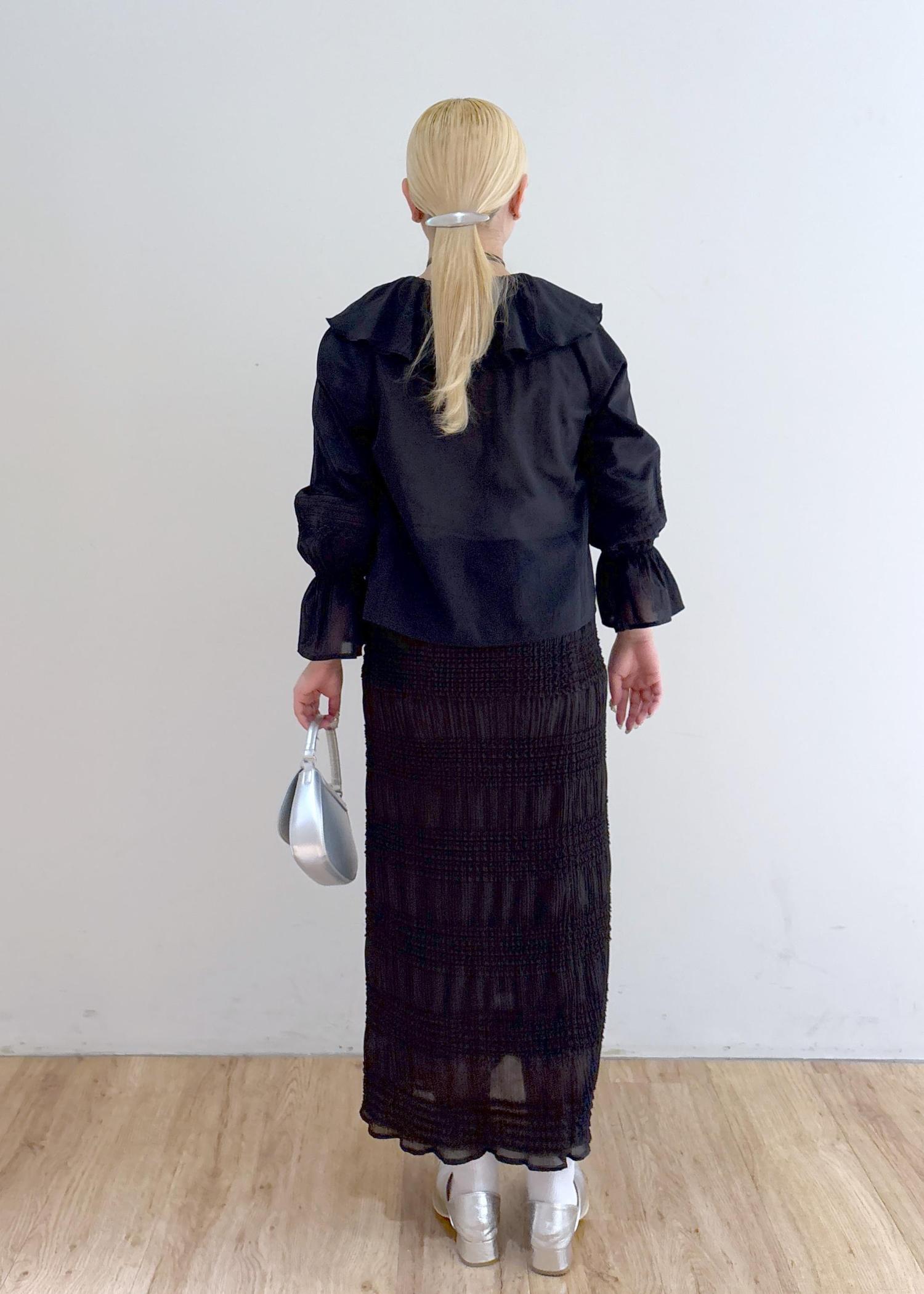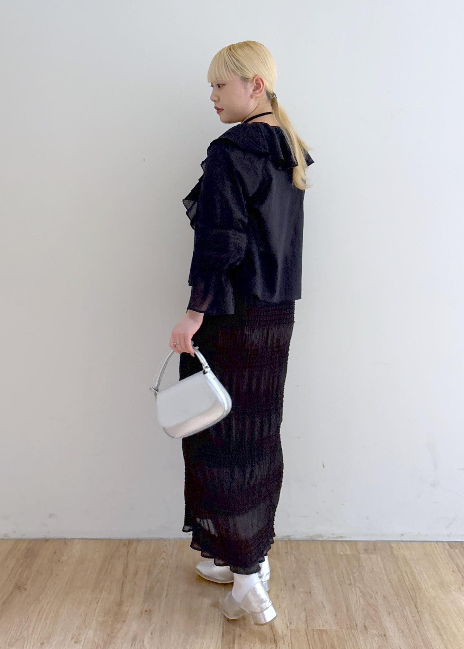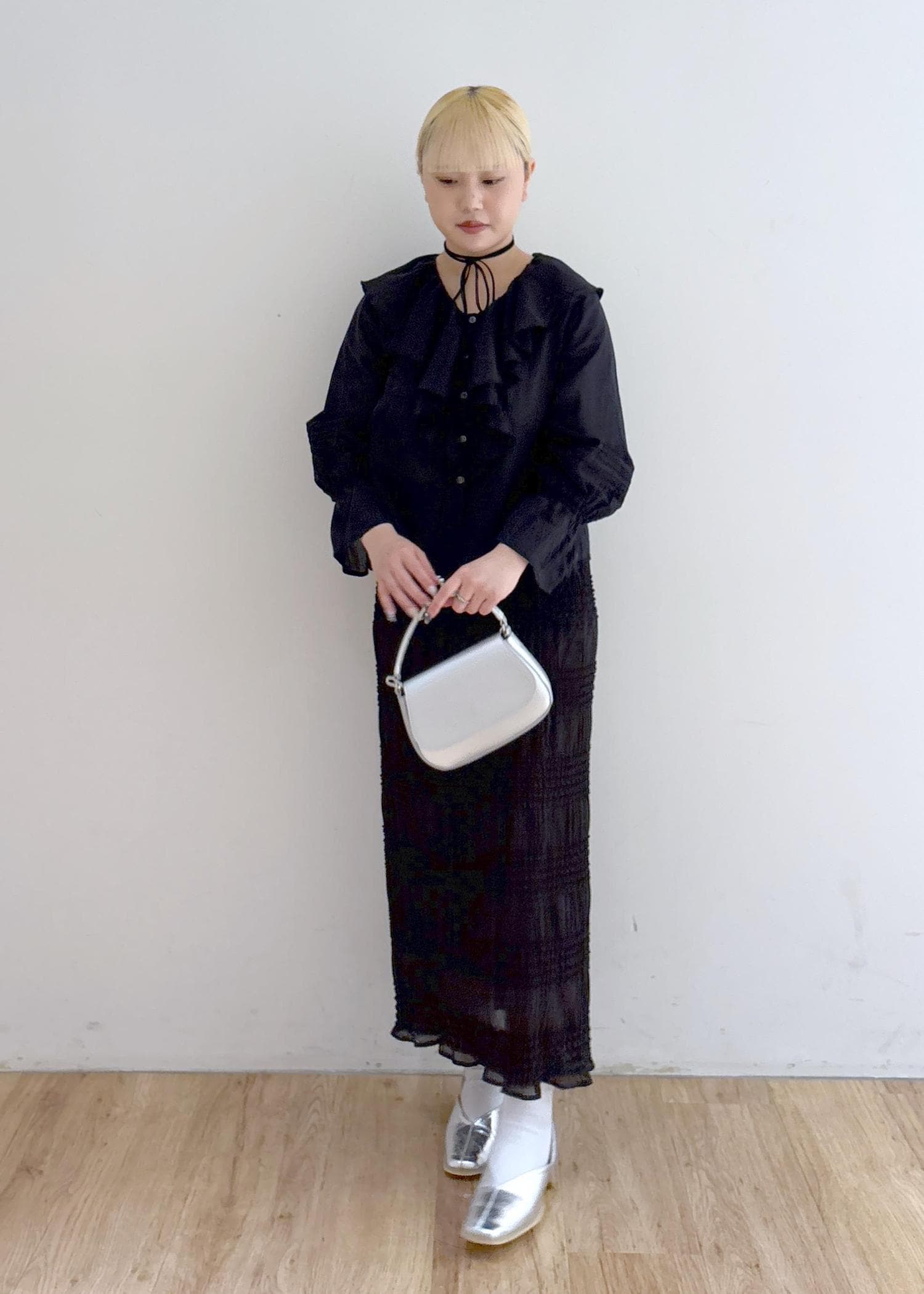 ブラックをベースに差し色でシルバーを取り入れたモード×キレイめコーデ です!