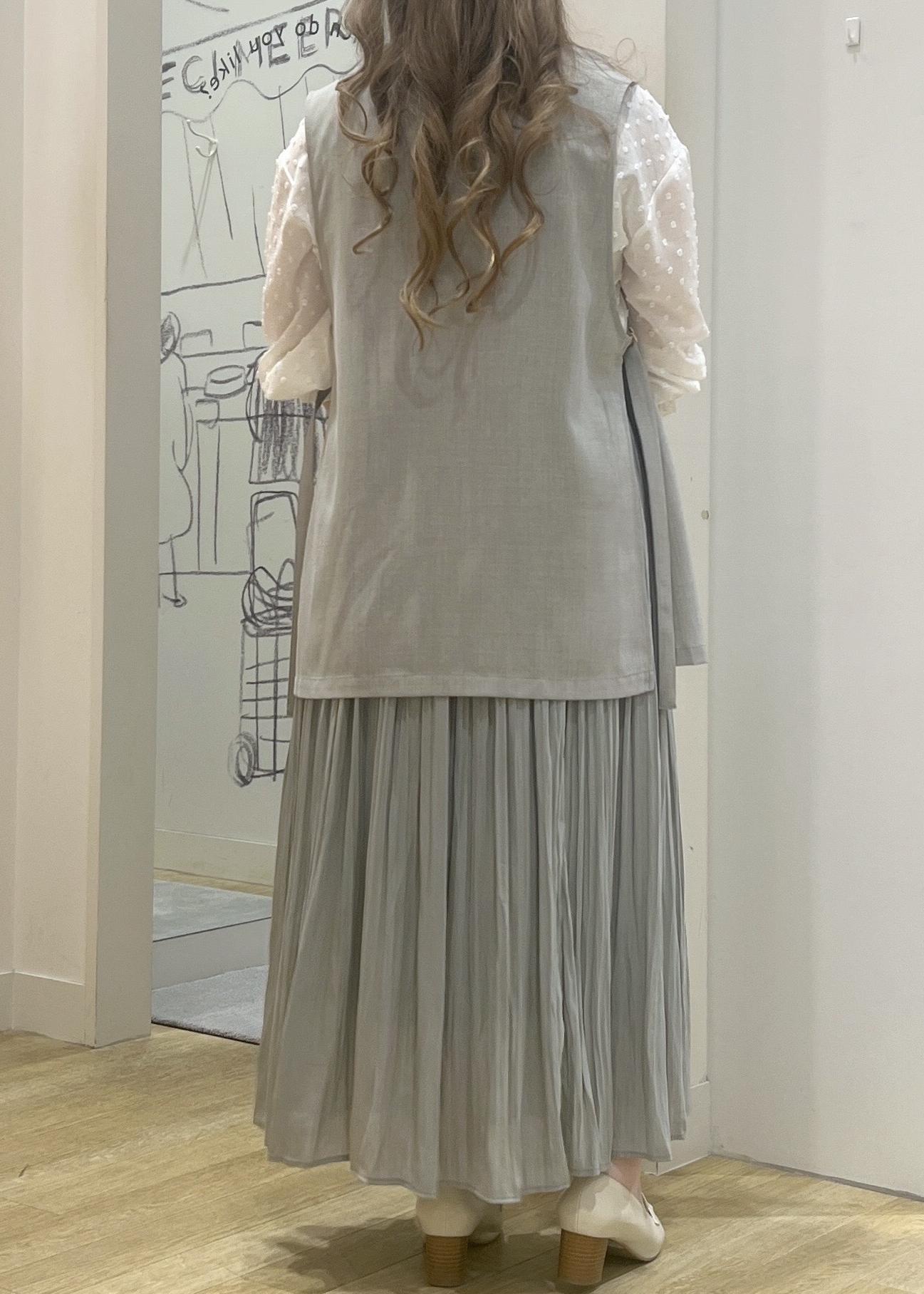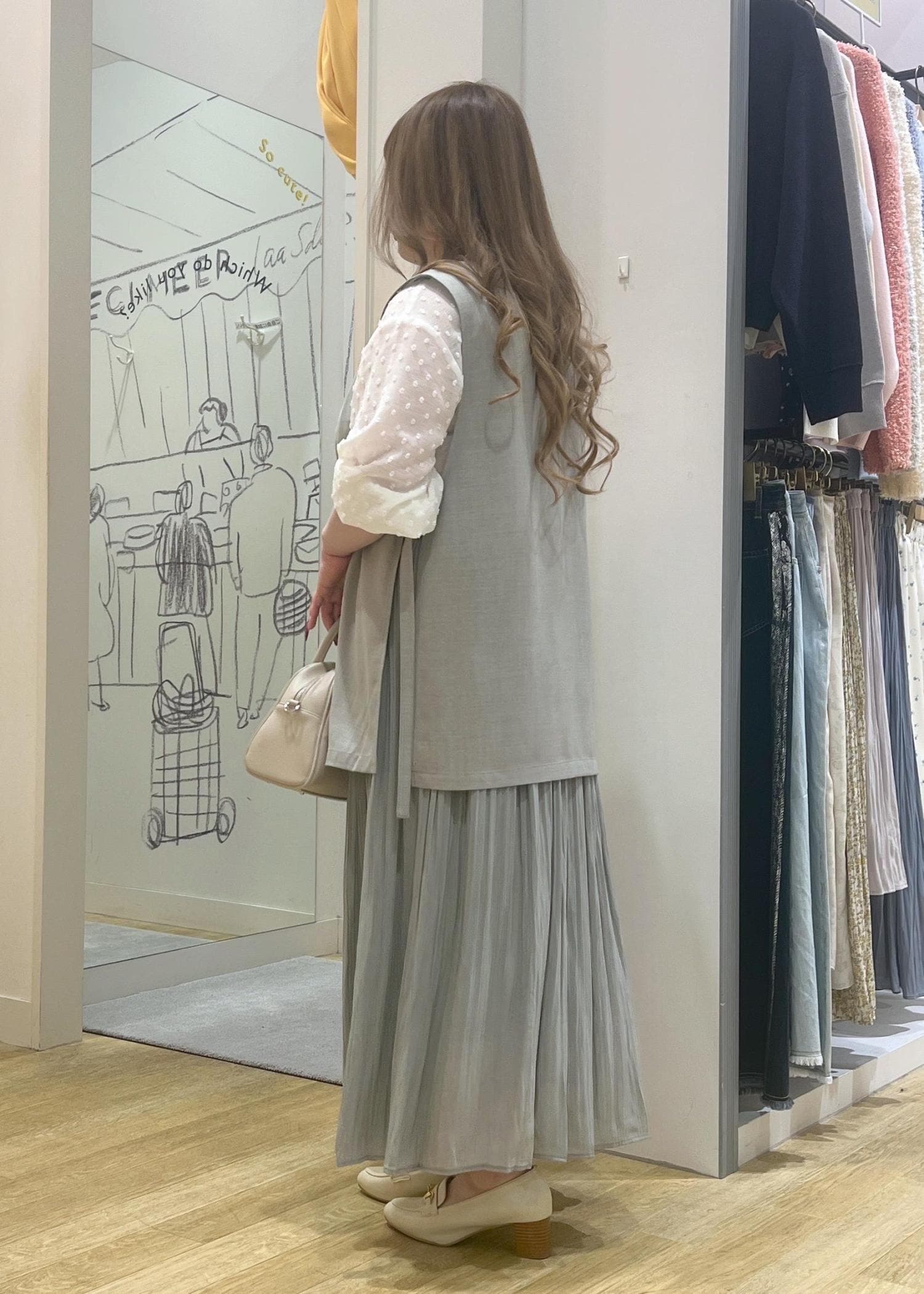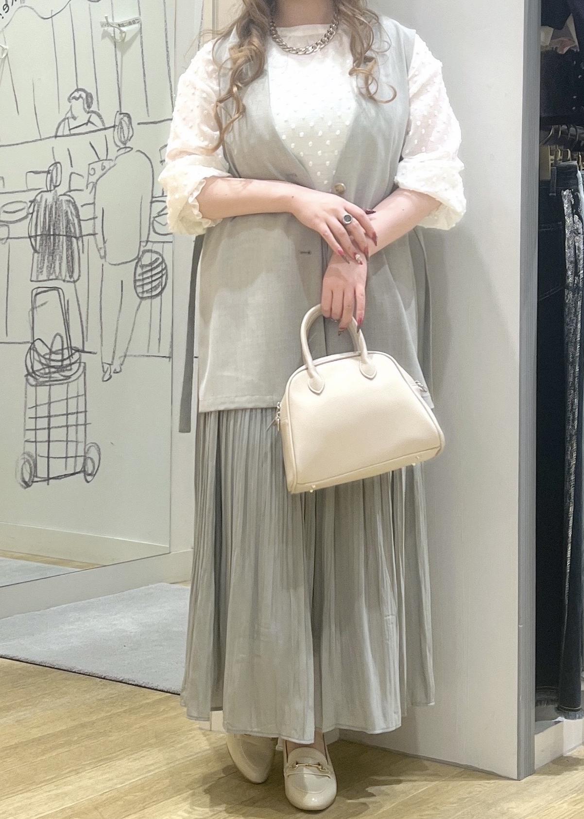 トップスのドット柄ブラウスはシアー素材になっていて透け感が可愛く、袖もボリュームのあるシルエットになっているのでふんわりした可愛しい雰囲気になります♪