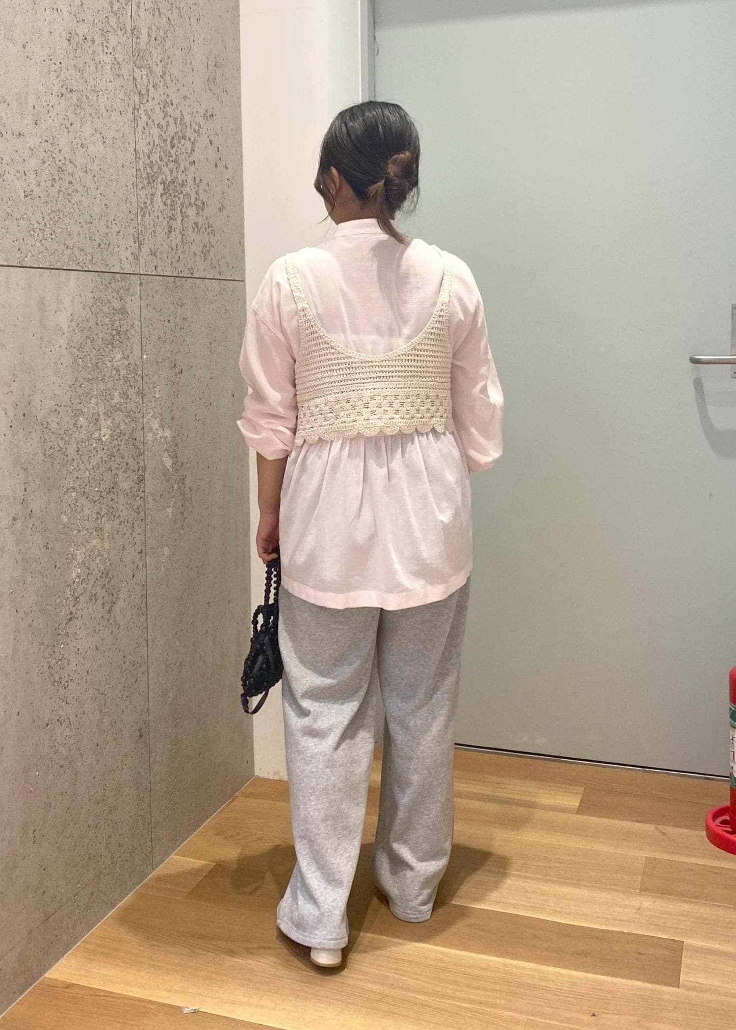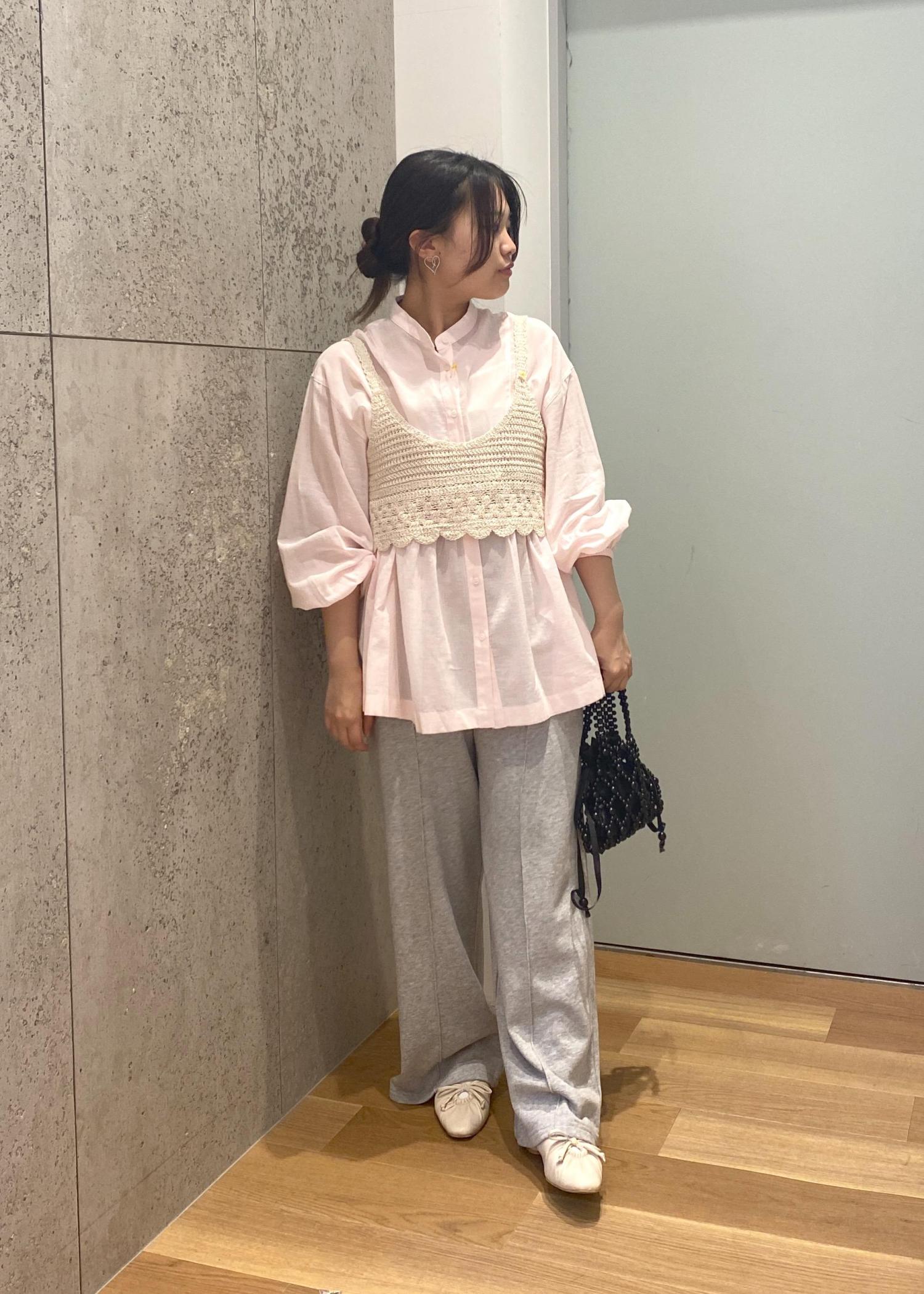 今年らしいワイドスウェットパンツにシャツを合わせてお出かけにもおすすめのコーデ◎春らしいピンクのカラーシャツがポイントです。