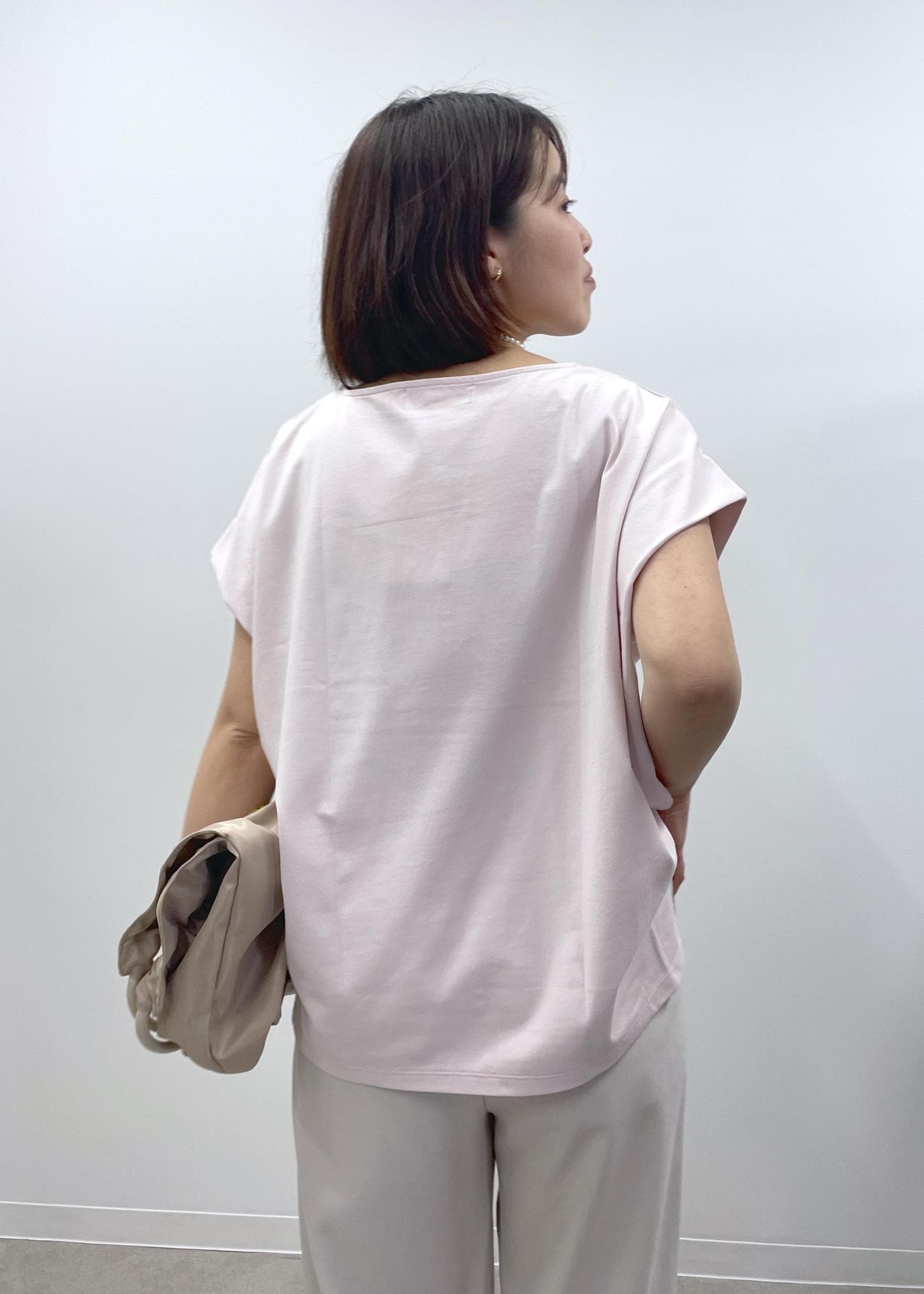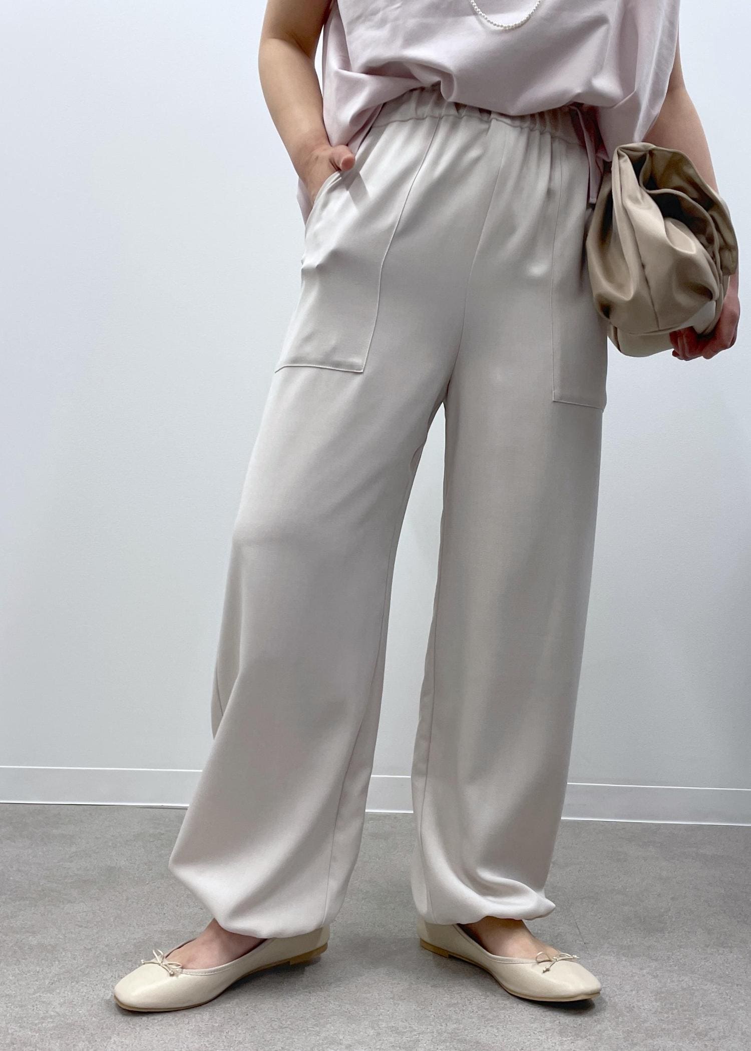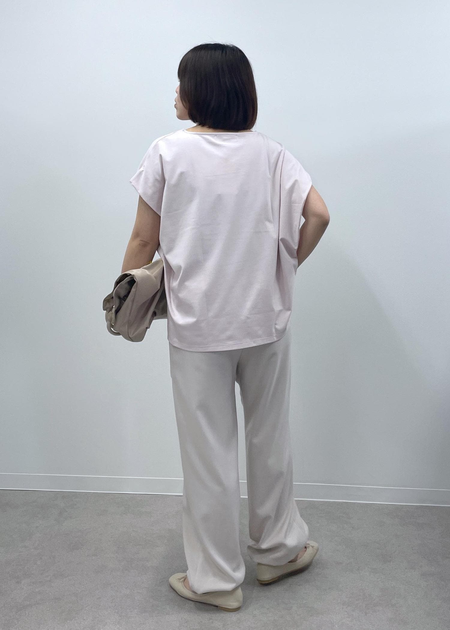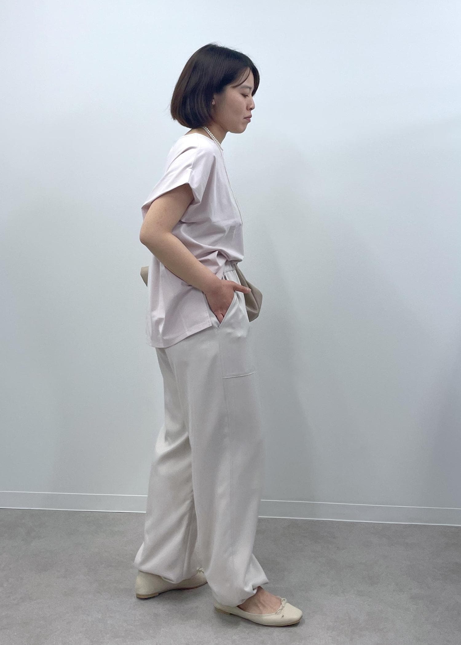 きれい見えするピンクのカットソーに淡いベージュのイージーパンツを合わせた、程良くリラックス感もある大人カジュアルコーデです!