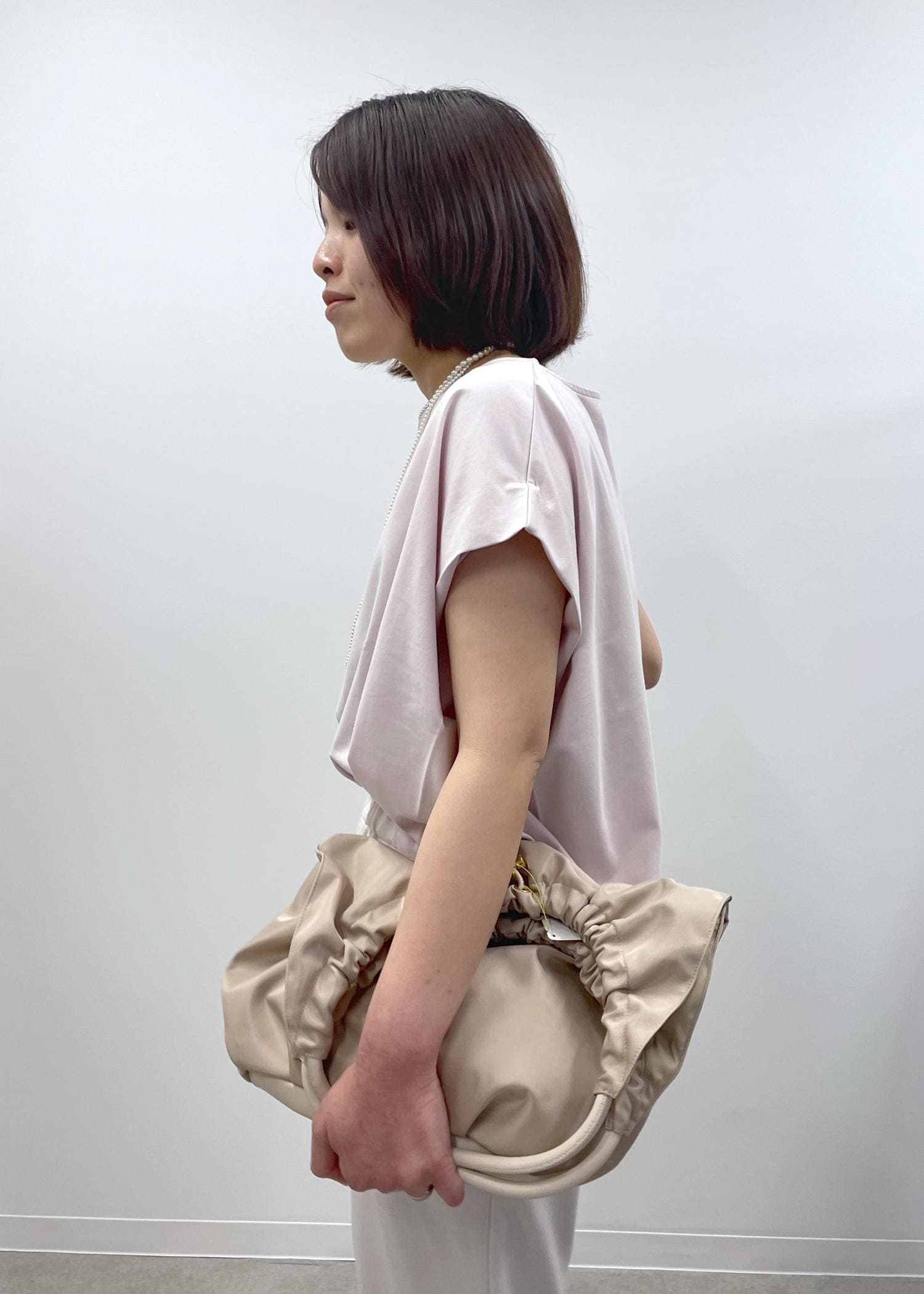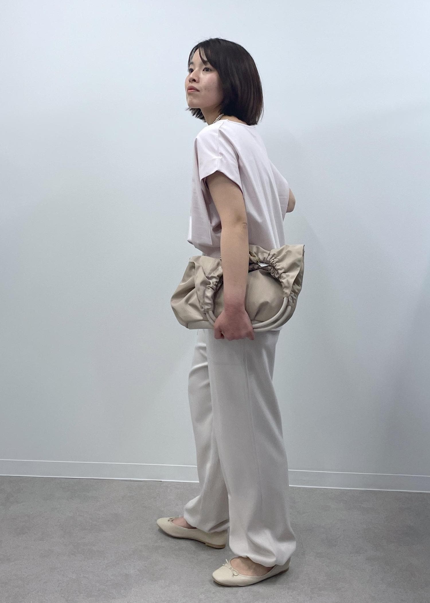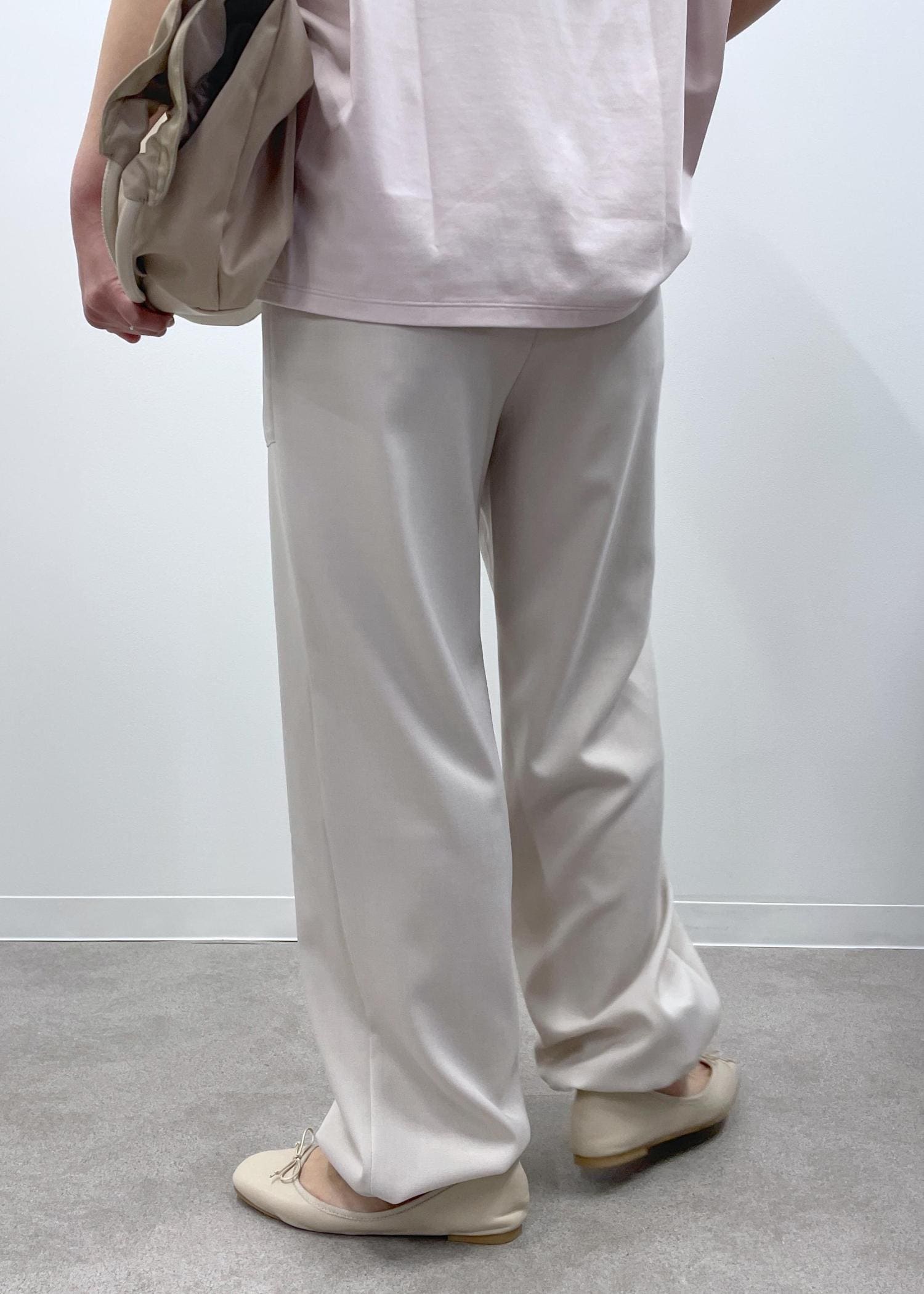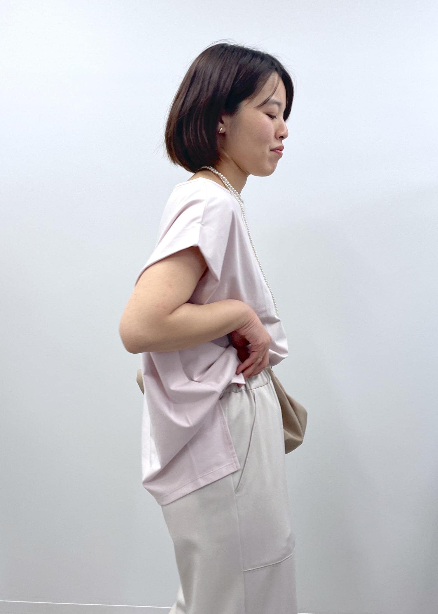 きれい見えするピンクのカットソーに淡いベージュのイージーパンツを合わせた、程良くリラックス感もある大人カジュアルコーデです!