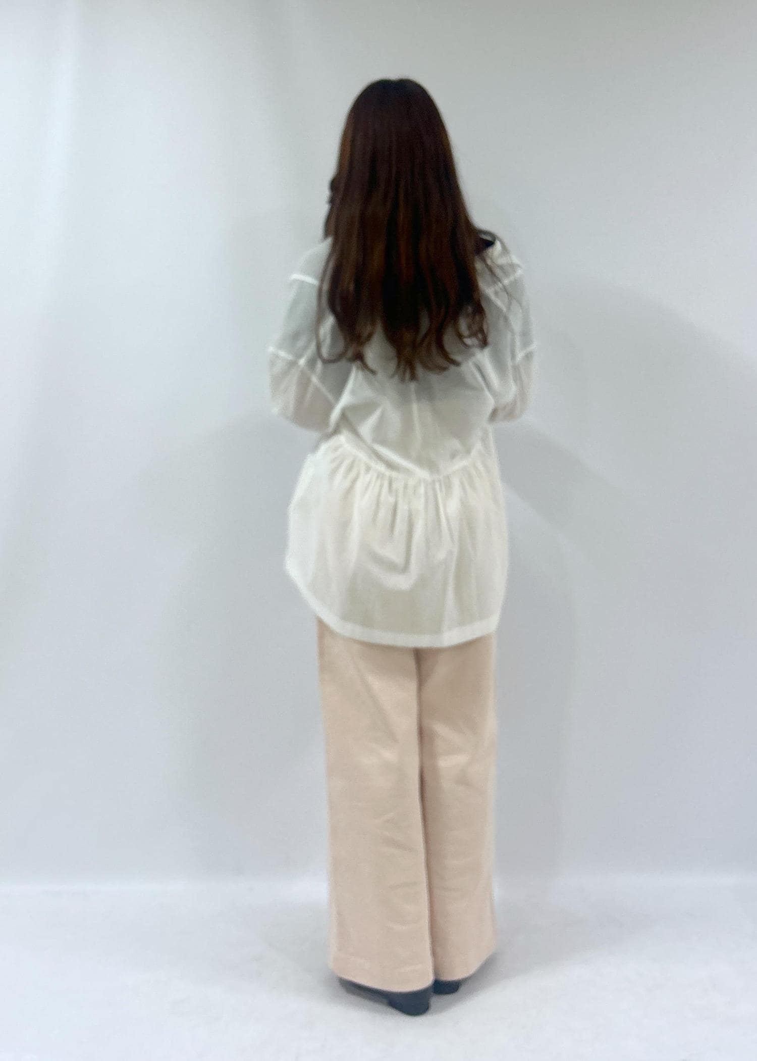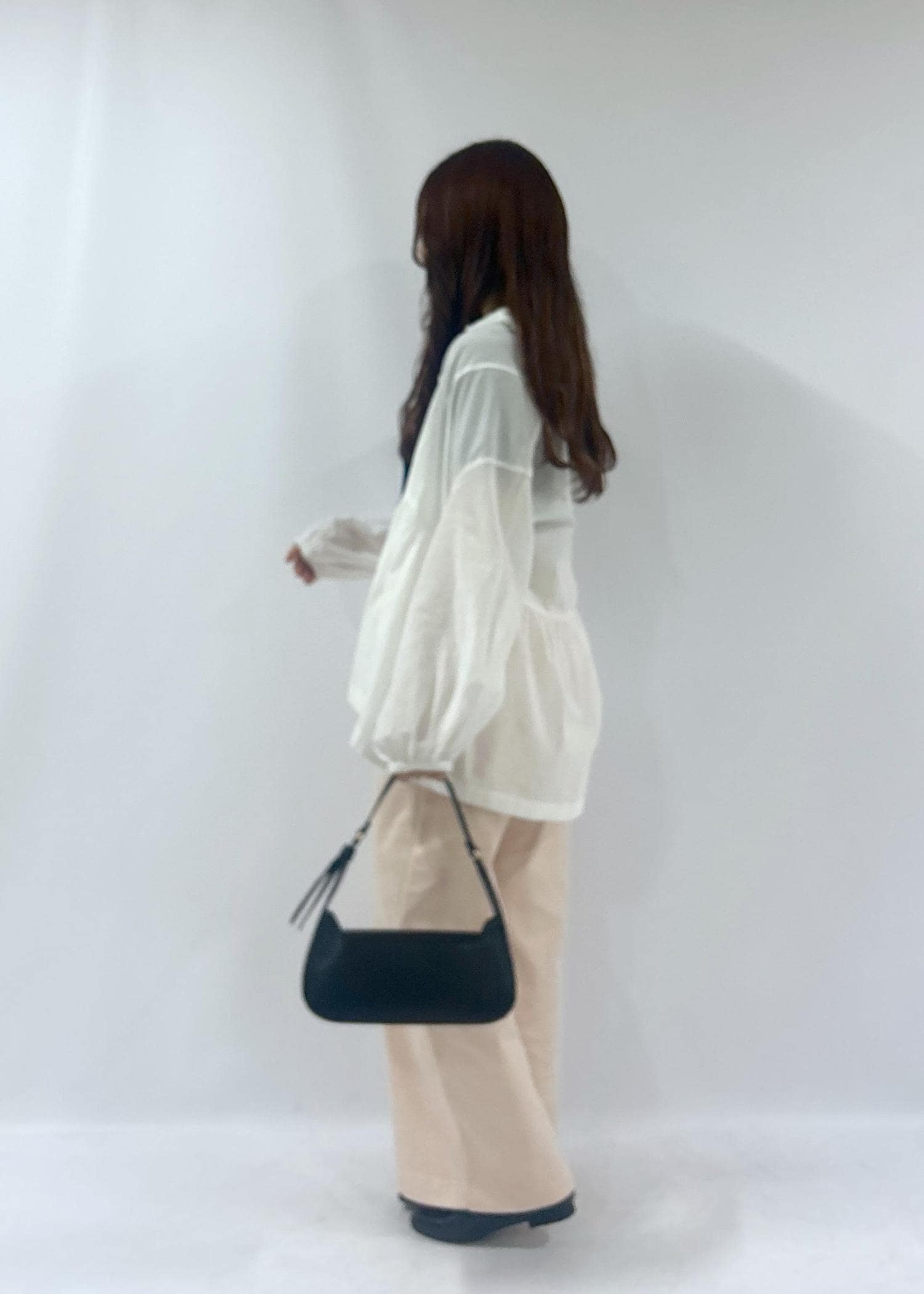 シンプルなブラウスに、春らしく明るいピンクを取り入れました!