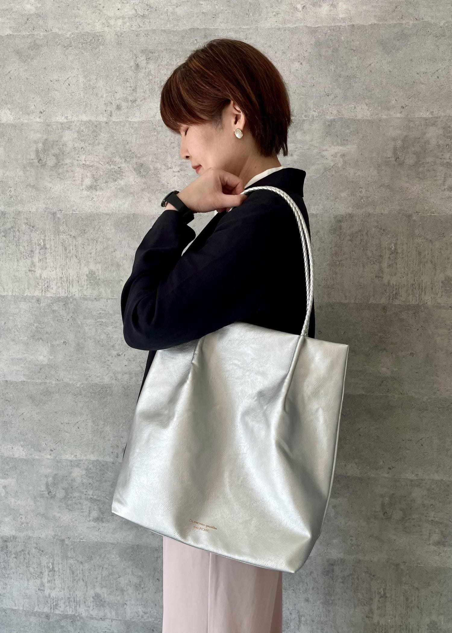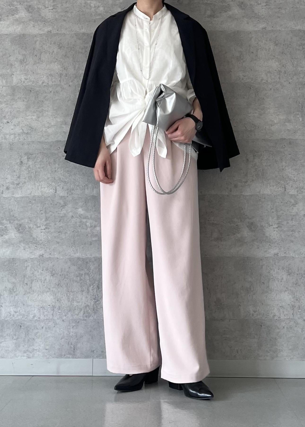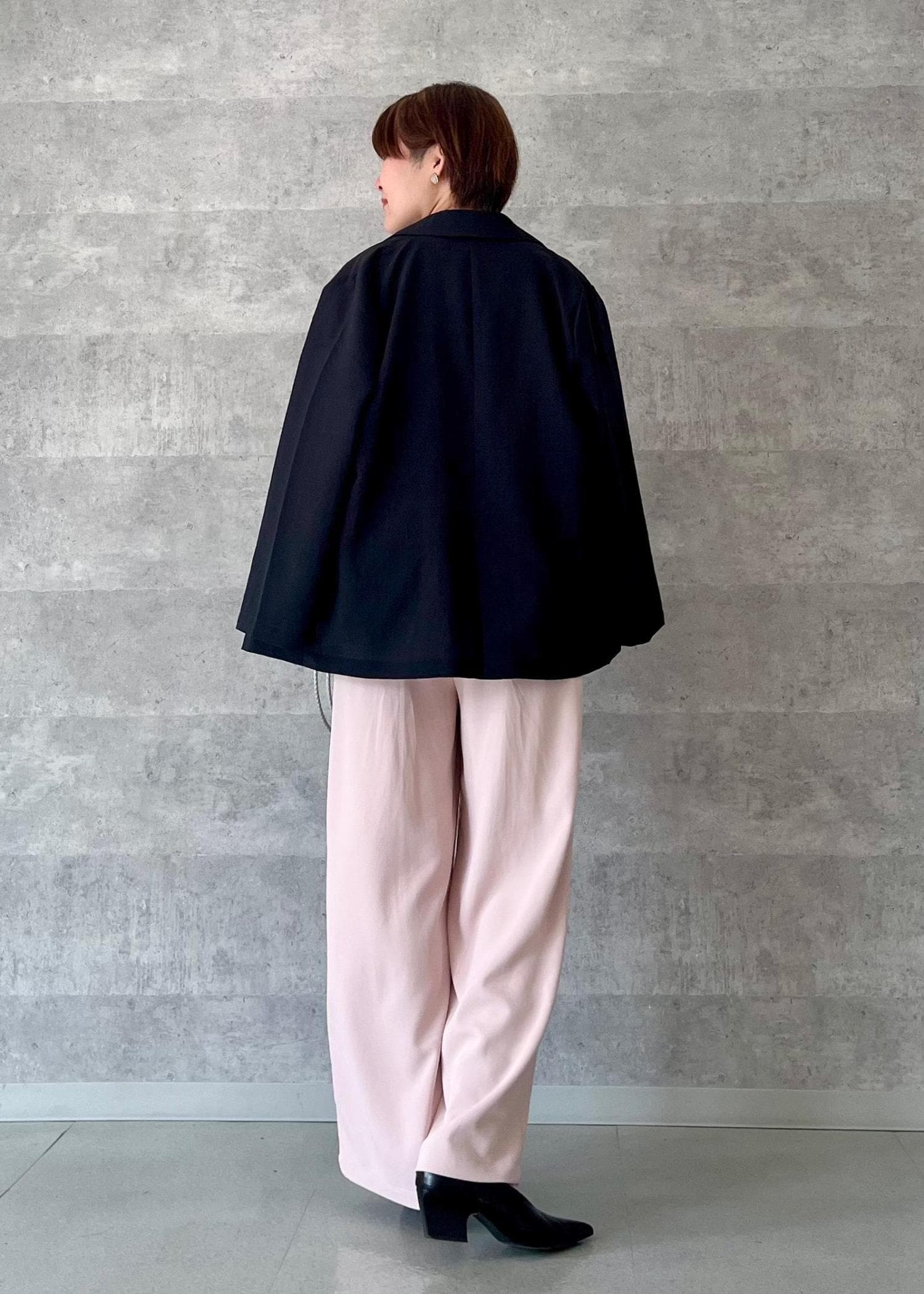 ゆるっとシルエットですが、光沢感と滑らかさのある生地感なので、カジュアルになりすぎずにオンオフ兼用で合わせていただけます◎