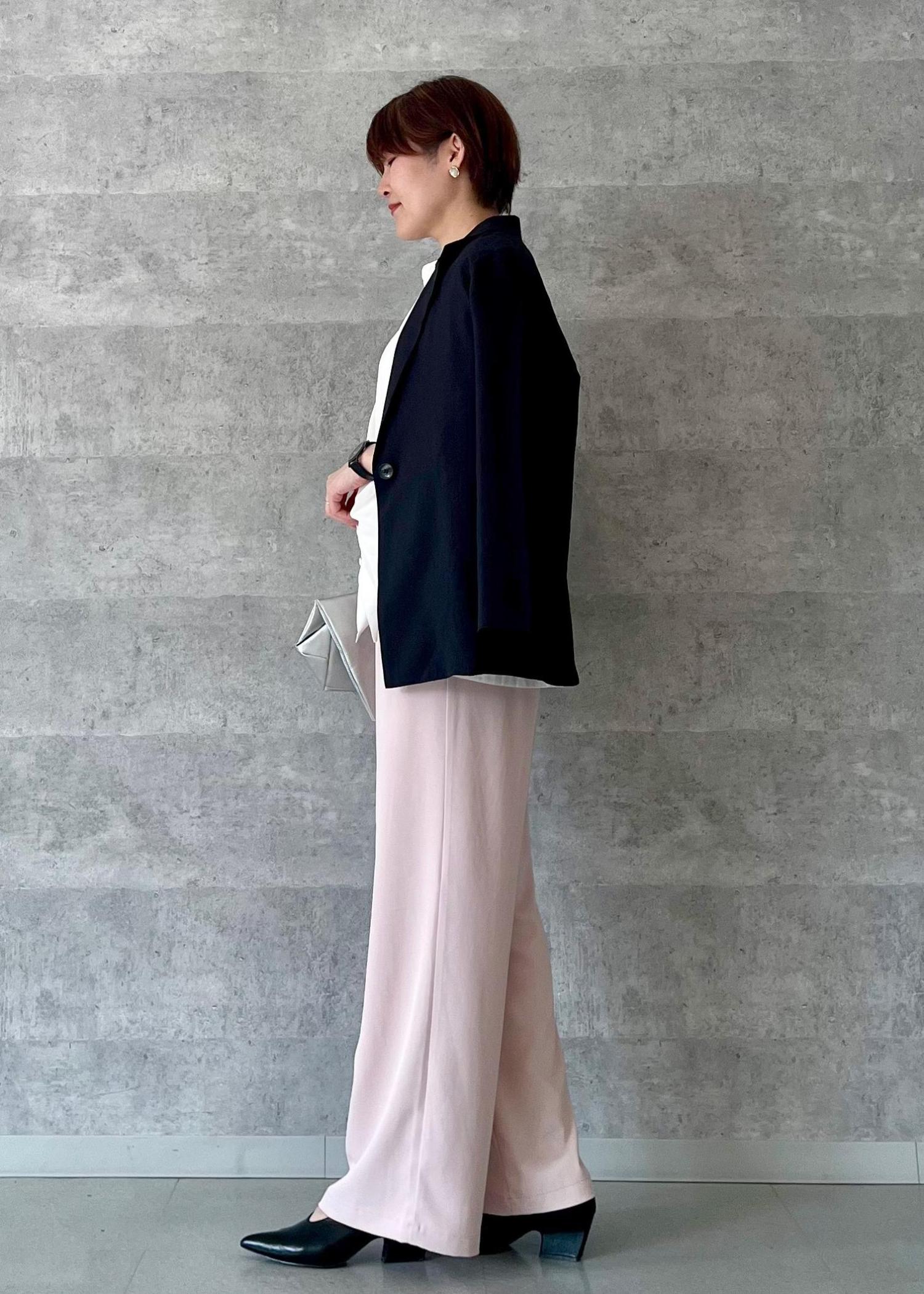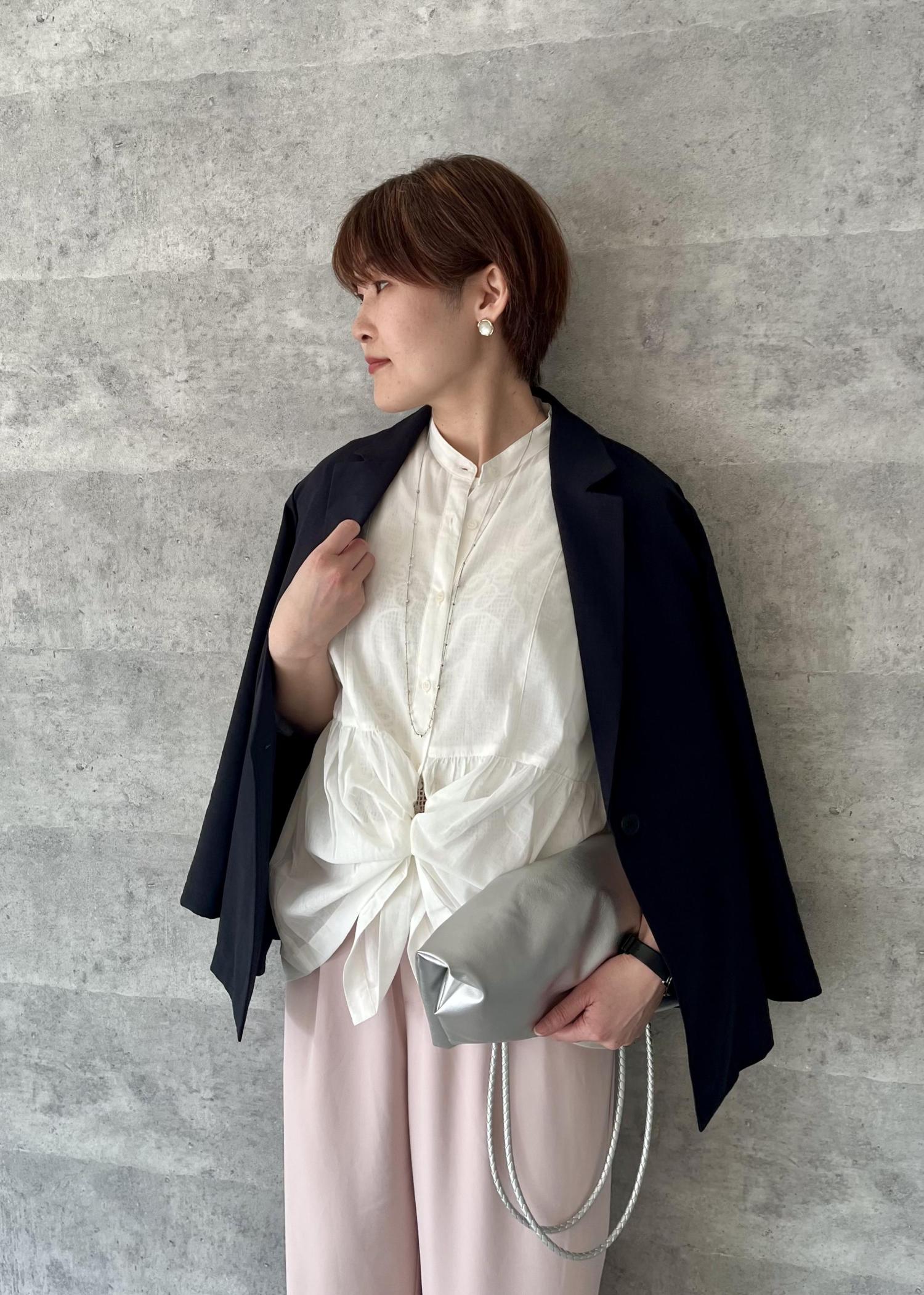 ペプラムデザインなのでボタンを閉めて着るとやや甘めな印象になりますが、首元がすっきりとしたノーカラータイプなので、かわいくなり過ぎないと思います。