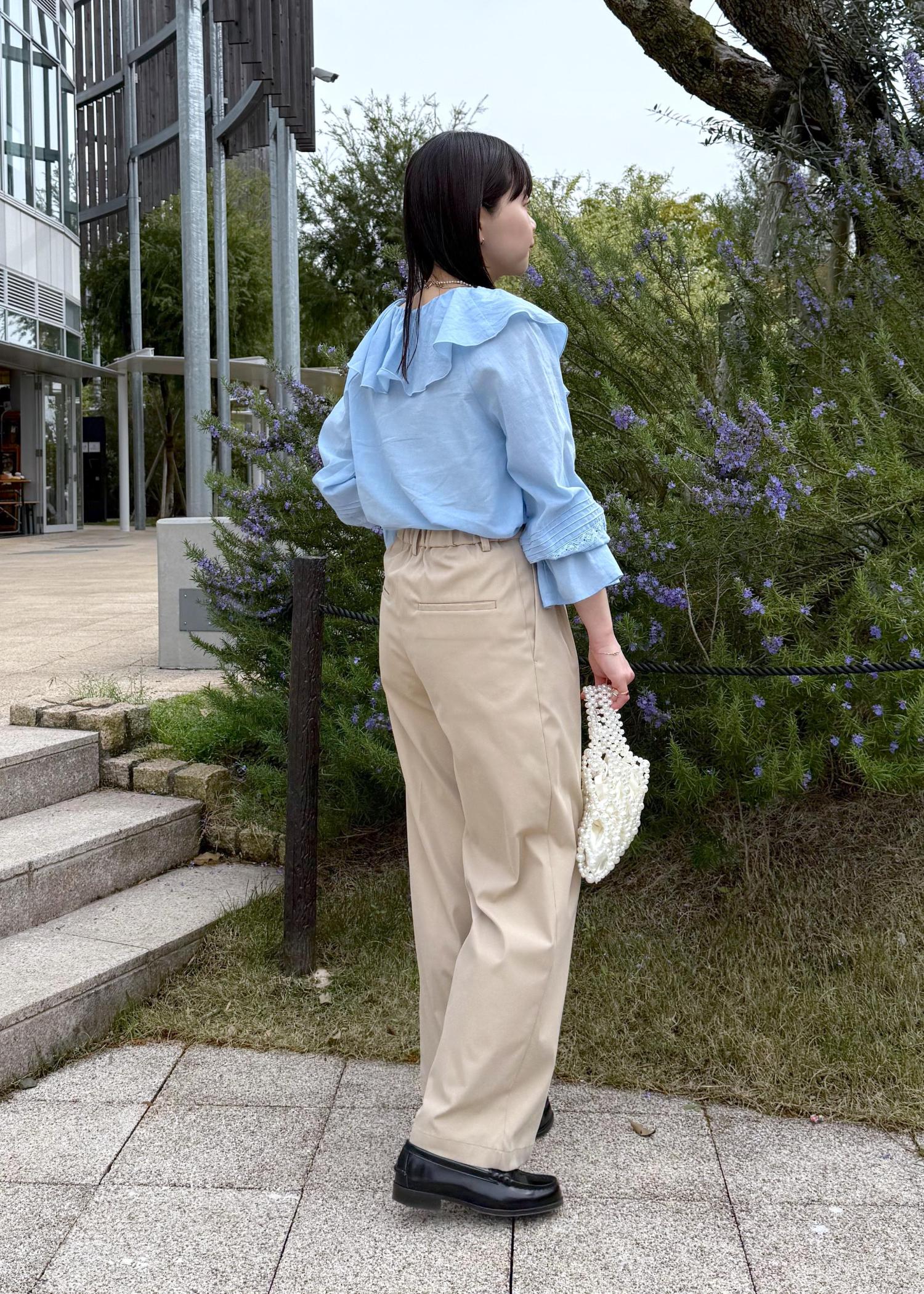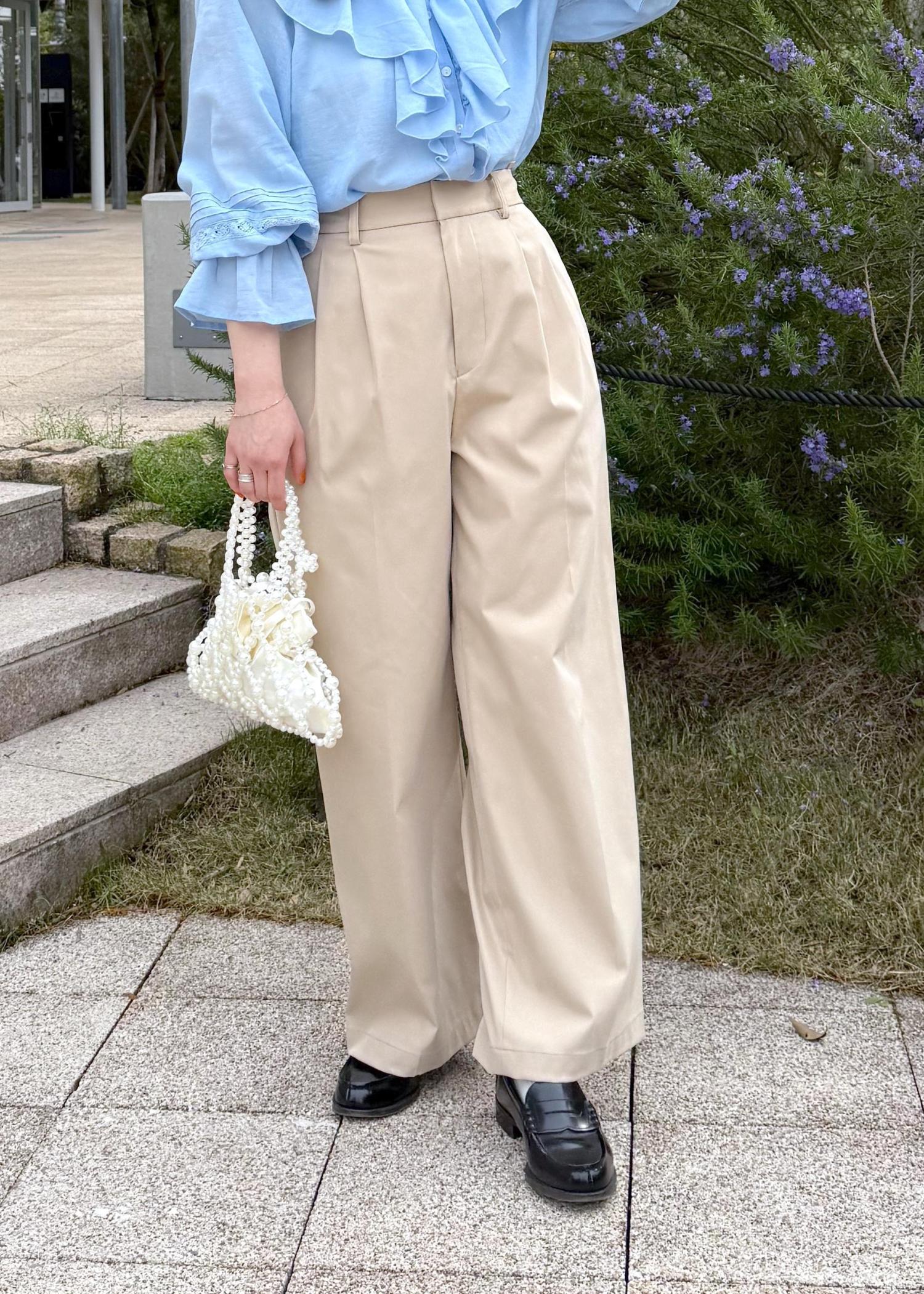 少しハリのある生地感で太すぎないワイドなのでキレイめにもお使いいただきやすいです。 -