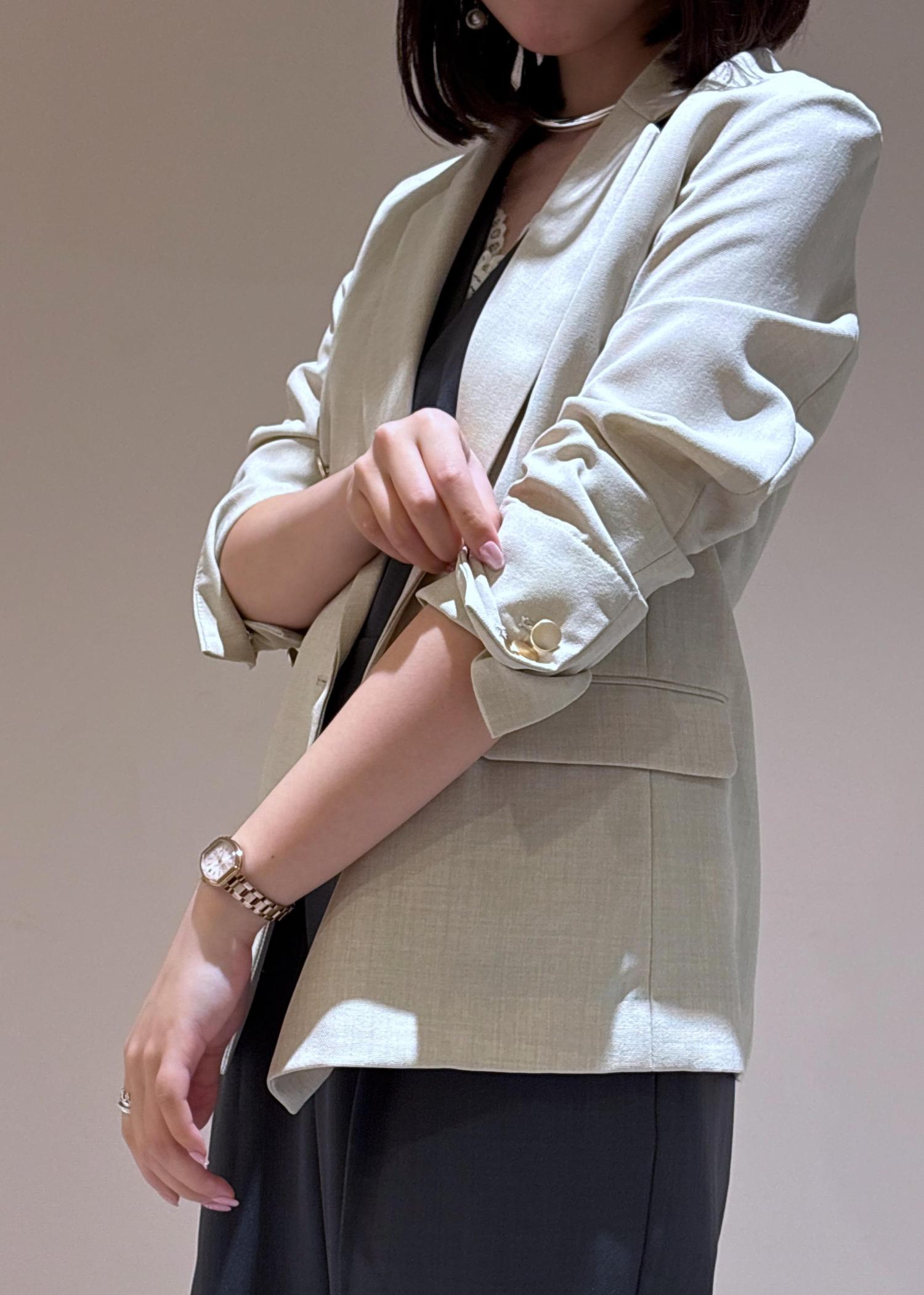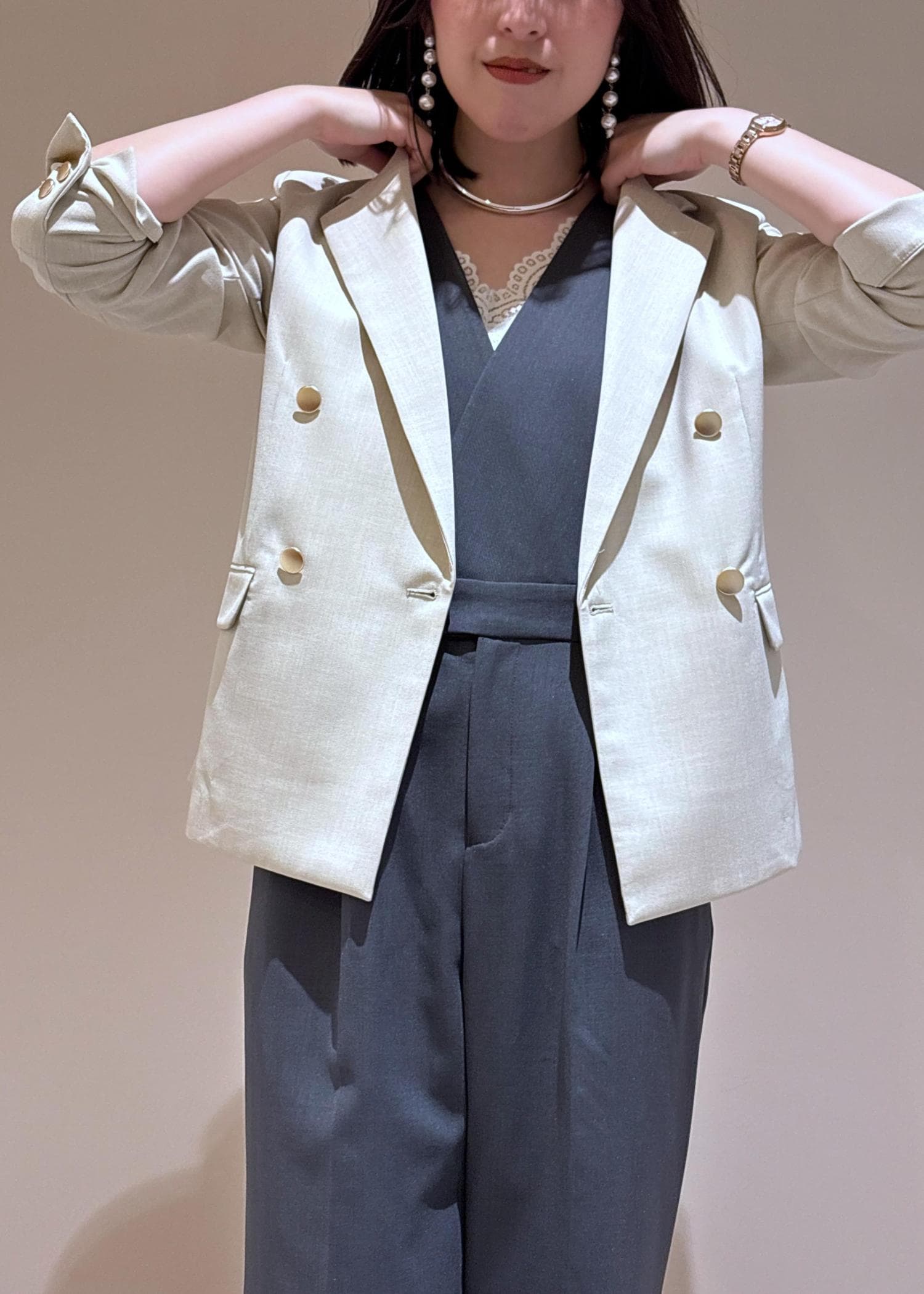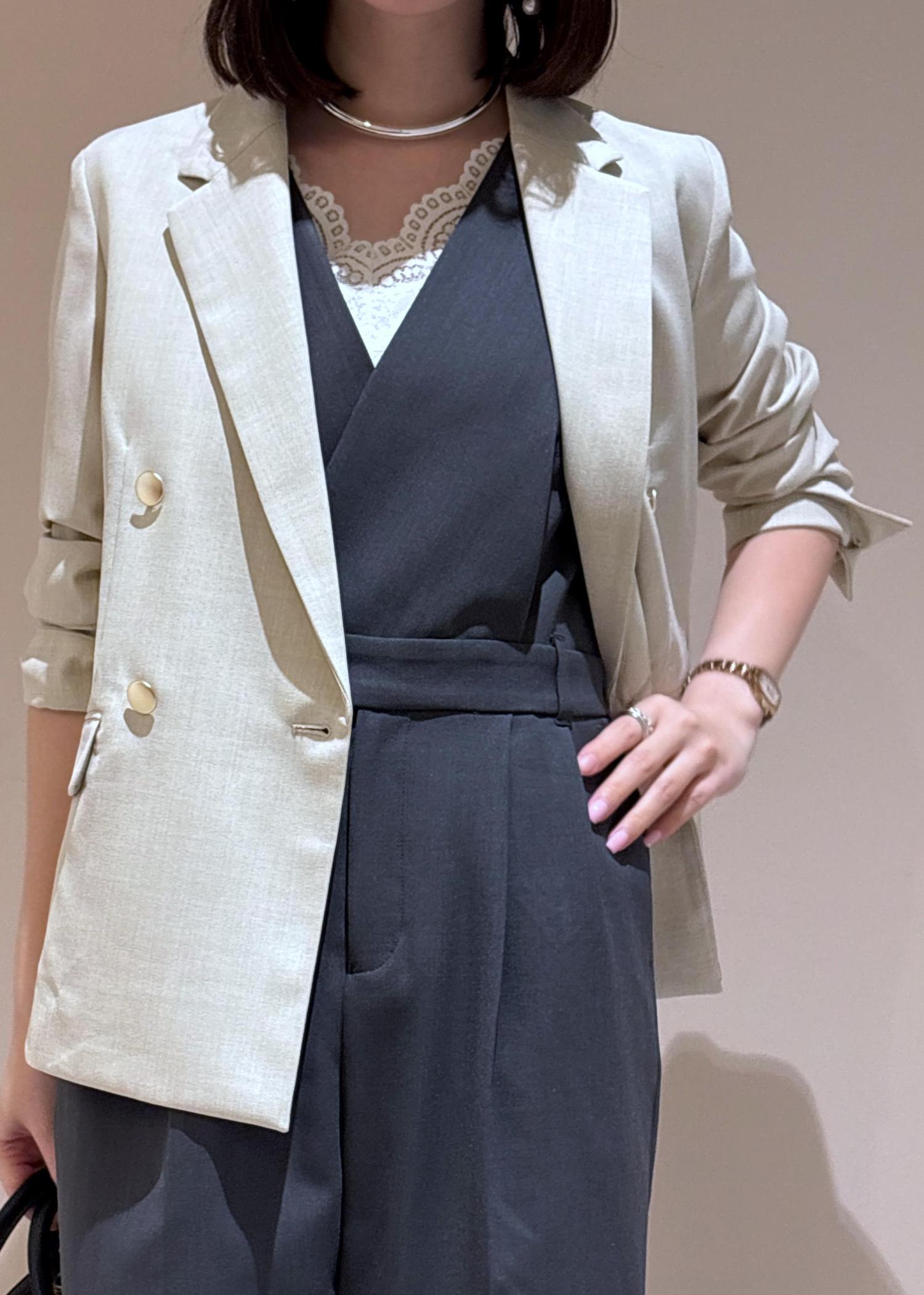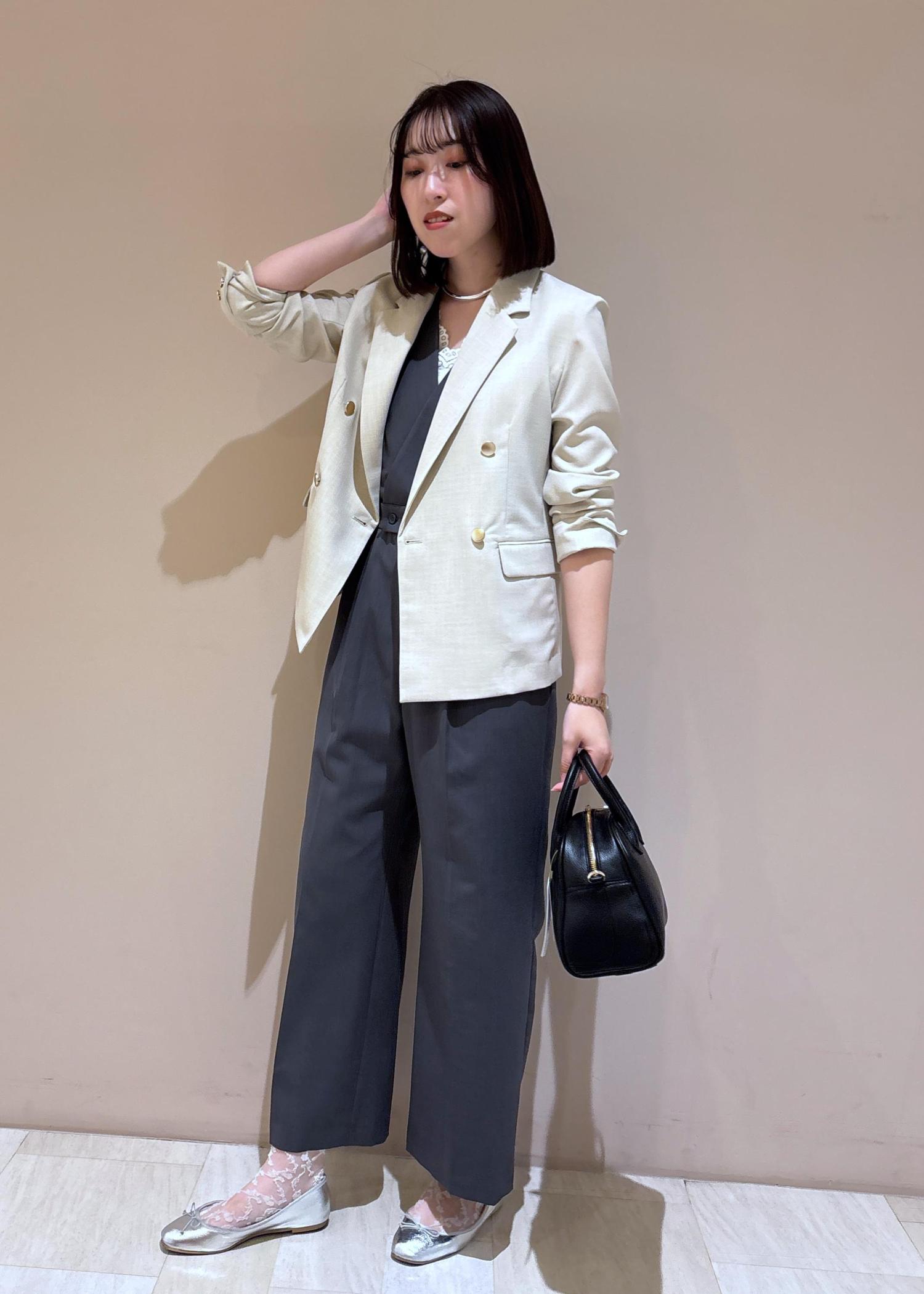 1枚着でオシャレに着れちゃうオールインワンにジャケットを合わせた大人綺麗めコーデ。