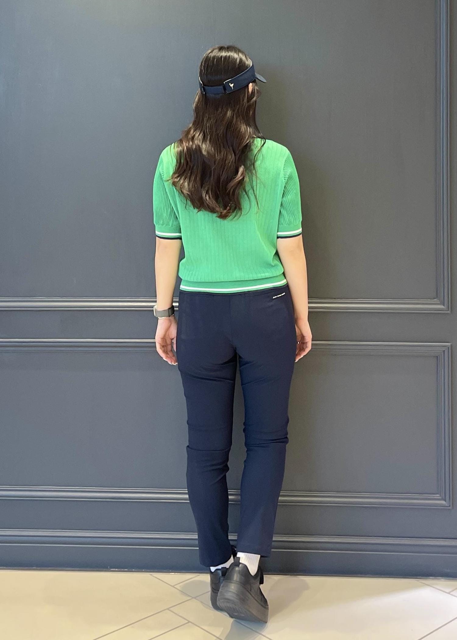 配色LINEのカラーに合わせてネイビーのパンツとバイザーを合わせることで統一感がでて可愛いですよね♪