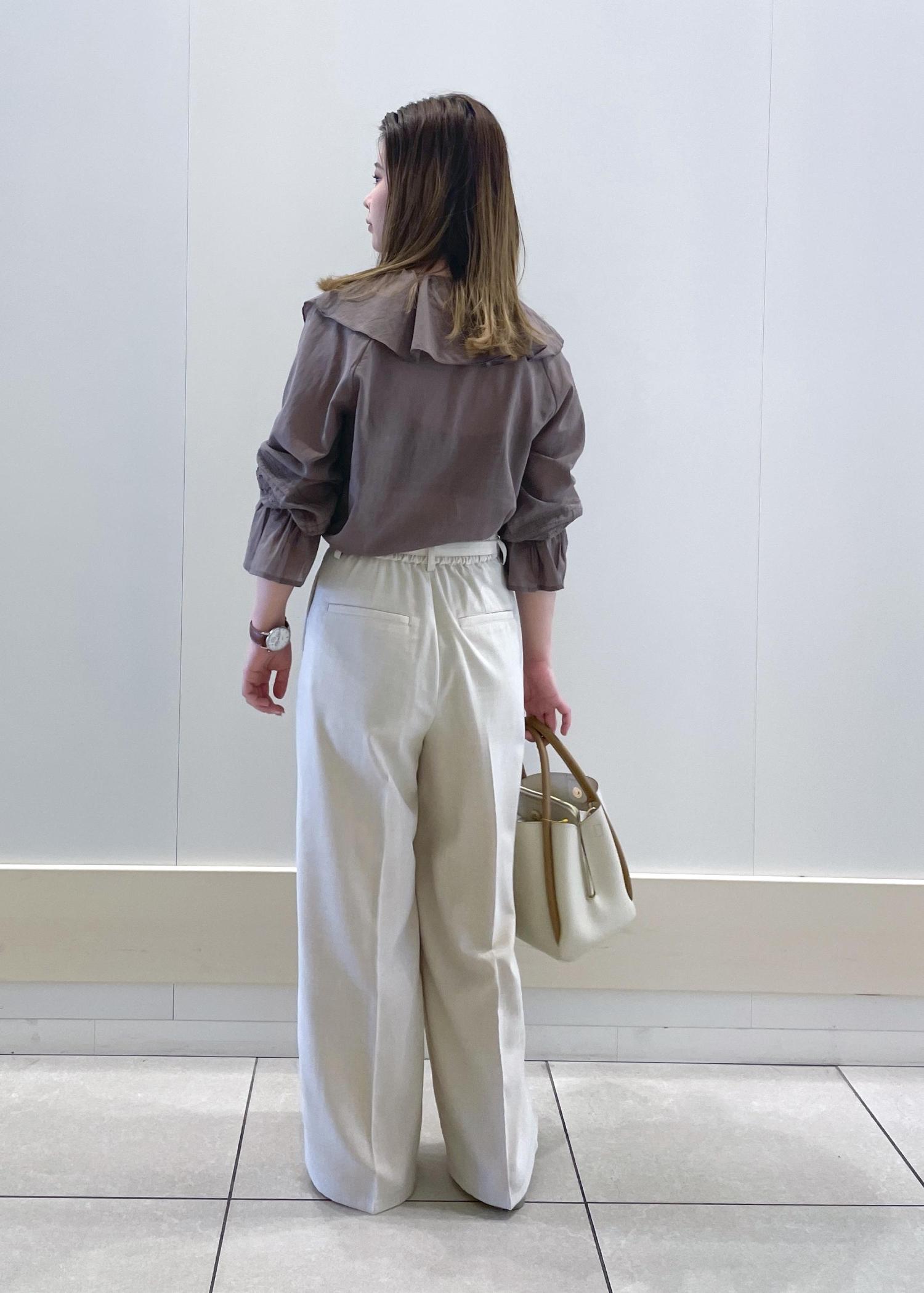 ブラウンのブラウスは程よい透け感があり、大人っぽい雰囲気が◎リネンっぽいパンツと合わせて、ヘルシーさを出しました。