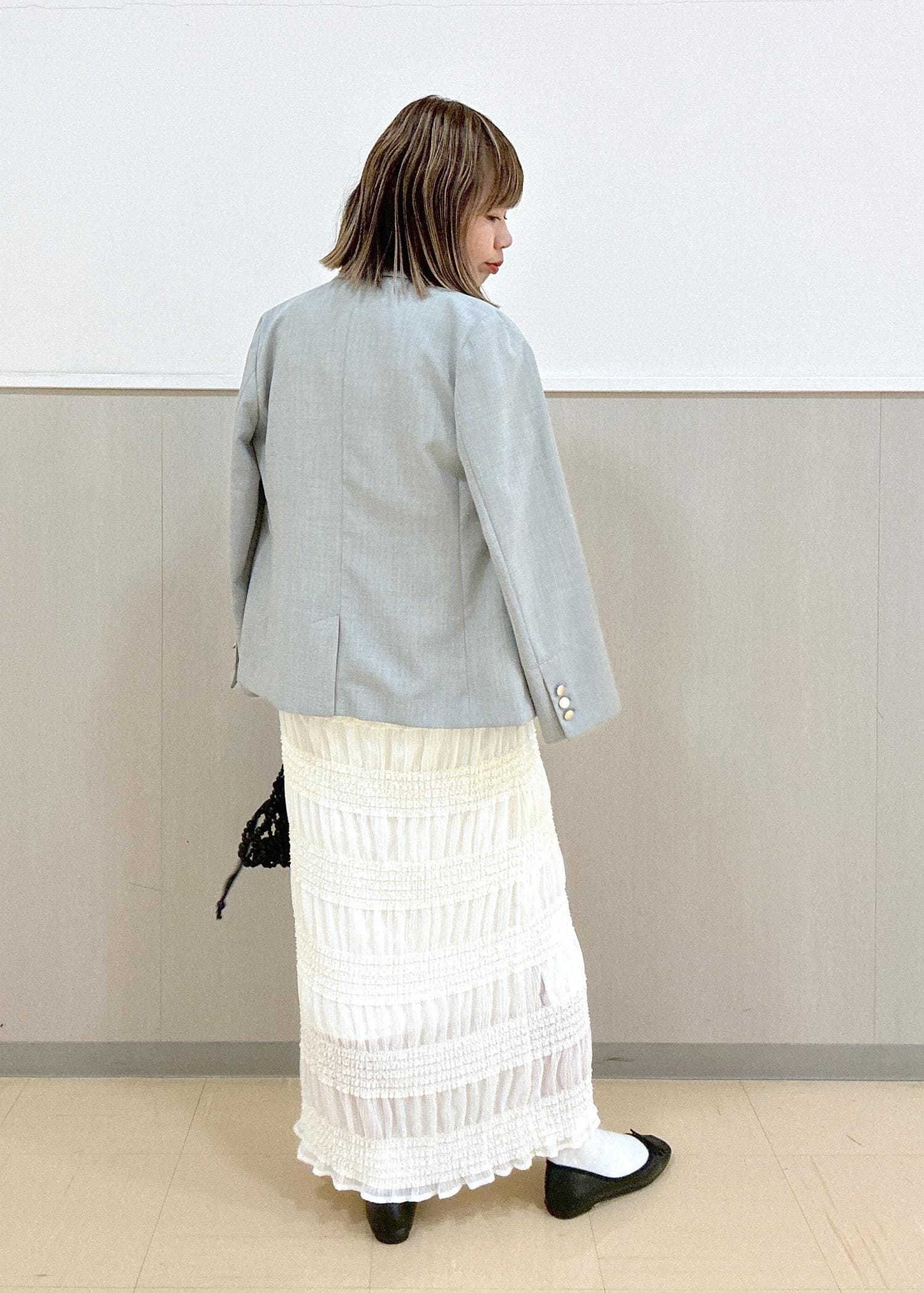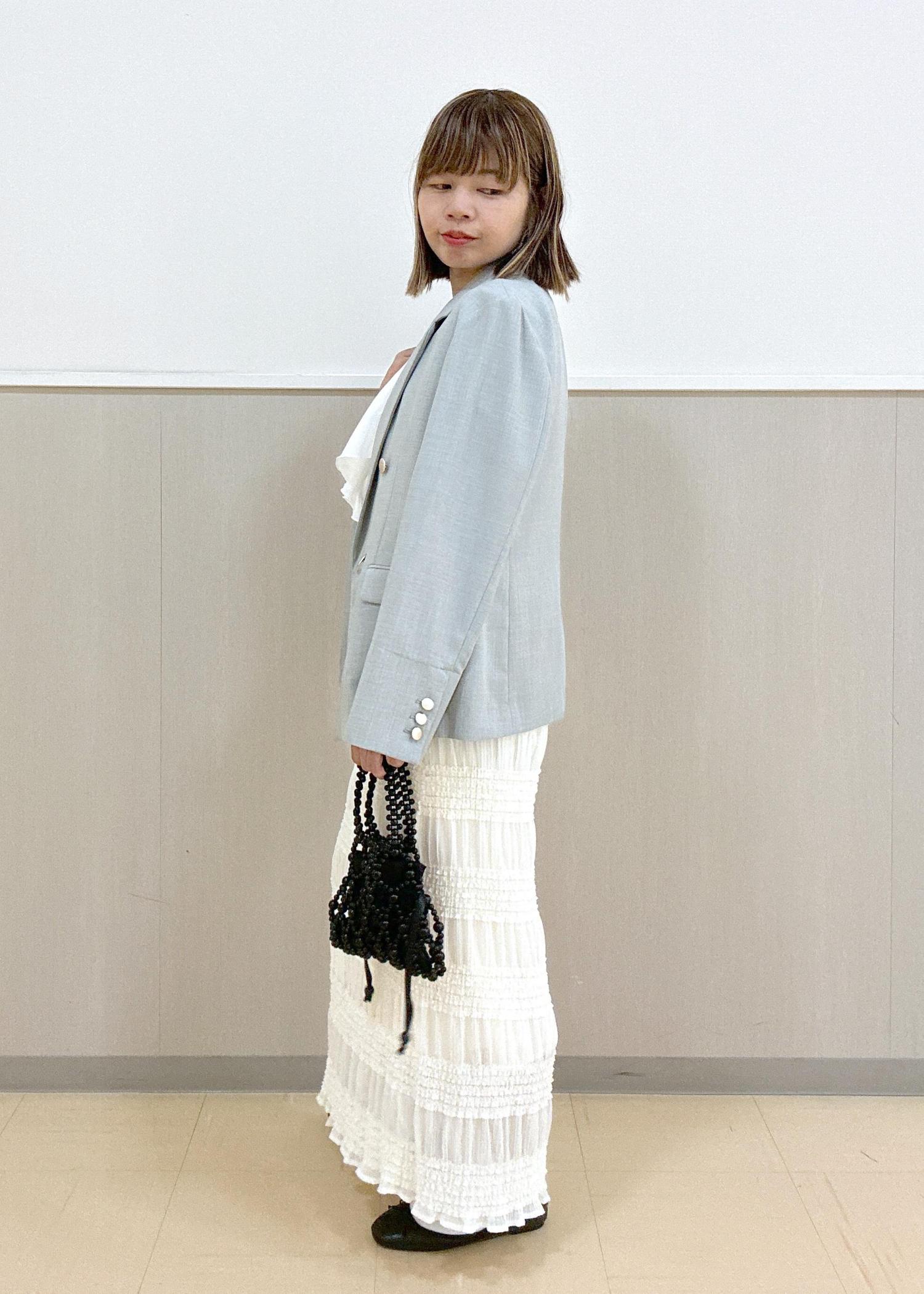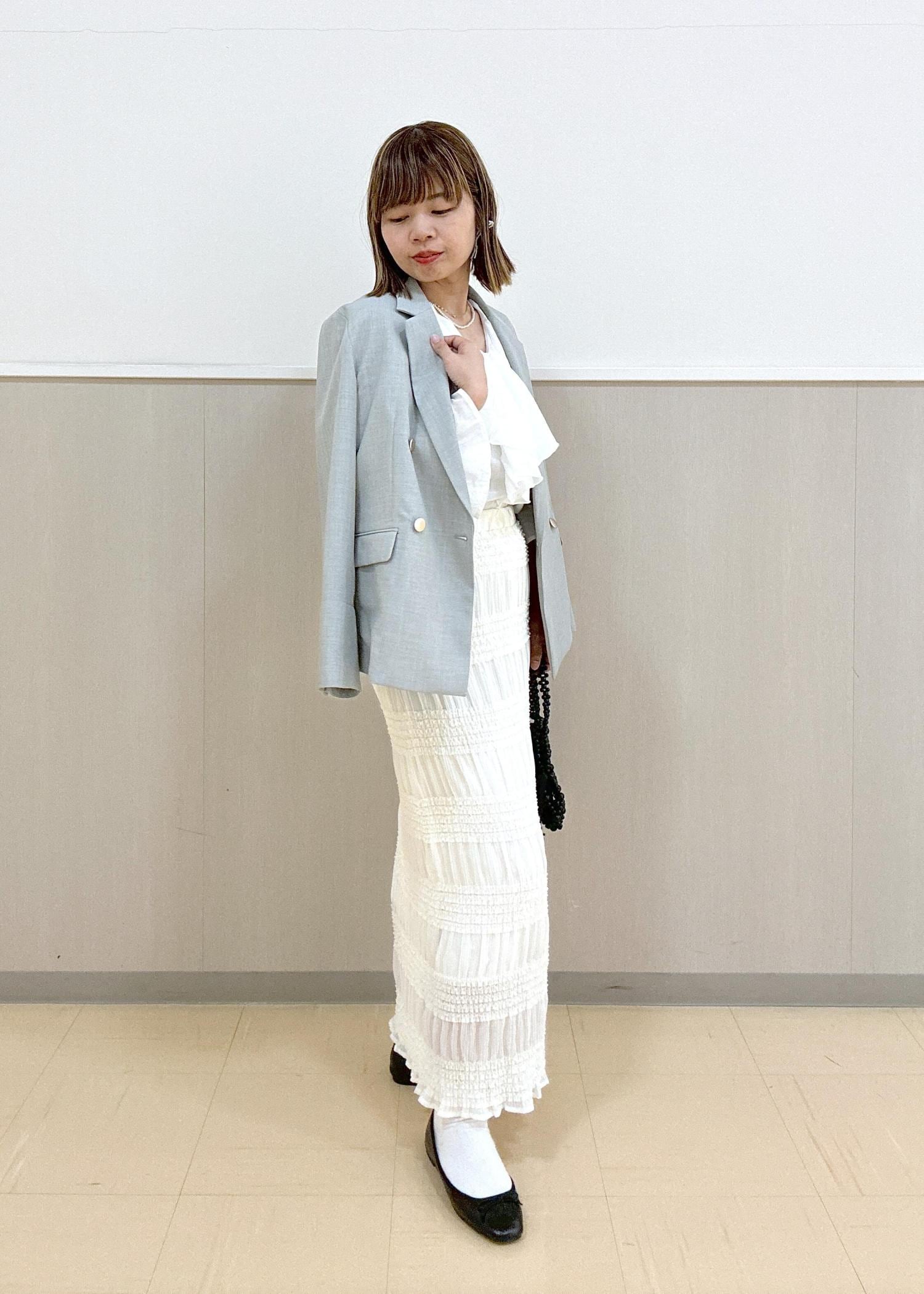 白のフリルやプリーツで女性らしいフェミニンなスタイリングに。グリーンのジャケットを合わせて涼しげな爽やかカラーで