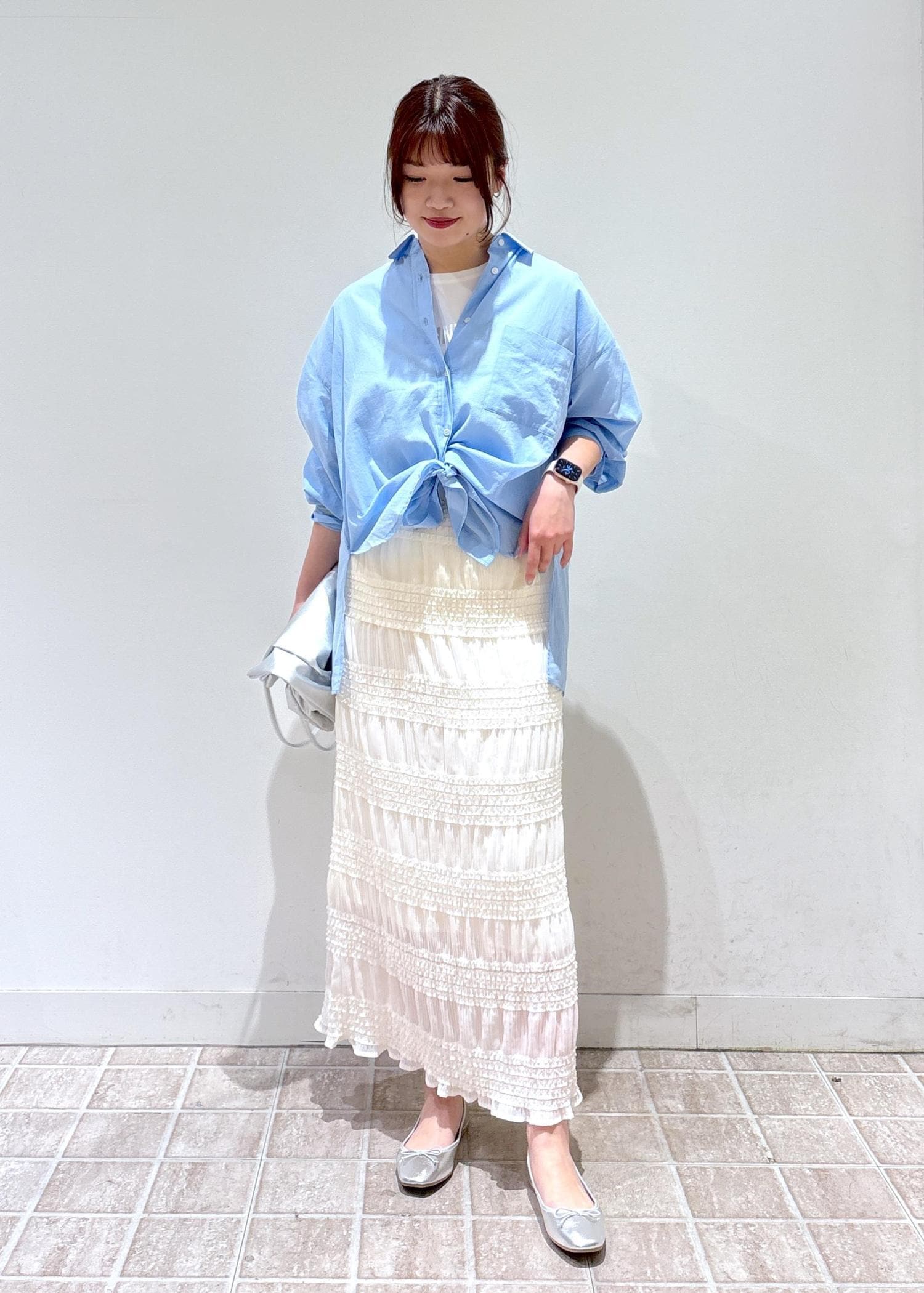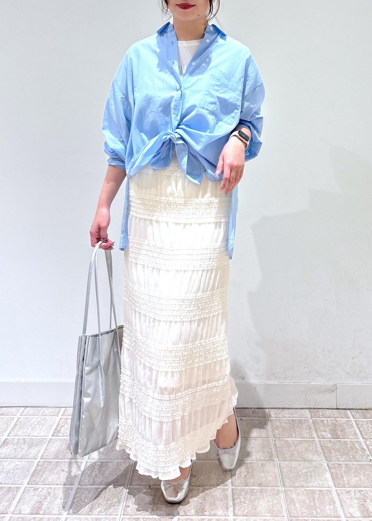そのまま羽織ってもカジュアルに合わせやすくて可愛いのですが、前結びアレンジで腰回りをスッキリ見せて、タイトなスカートと合わせてレディな印象に仕上げました♡