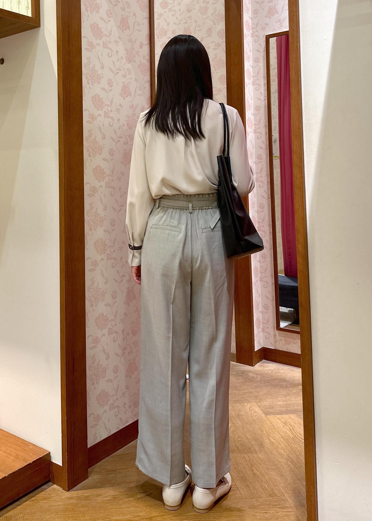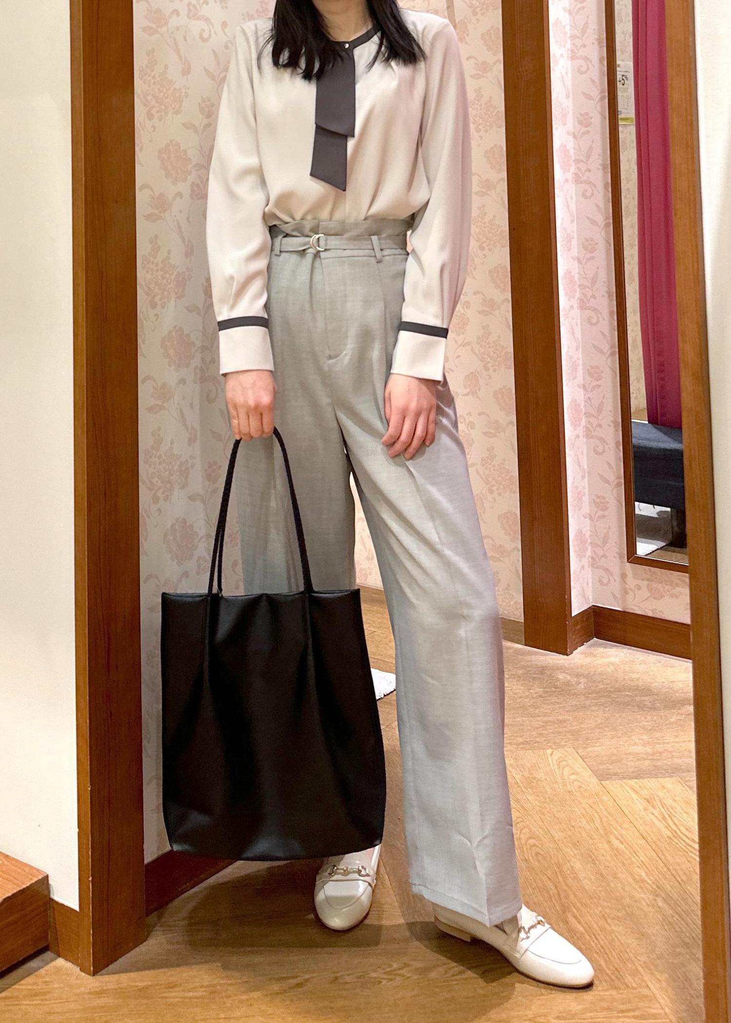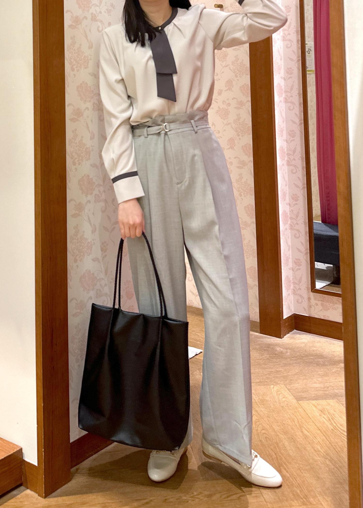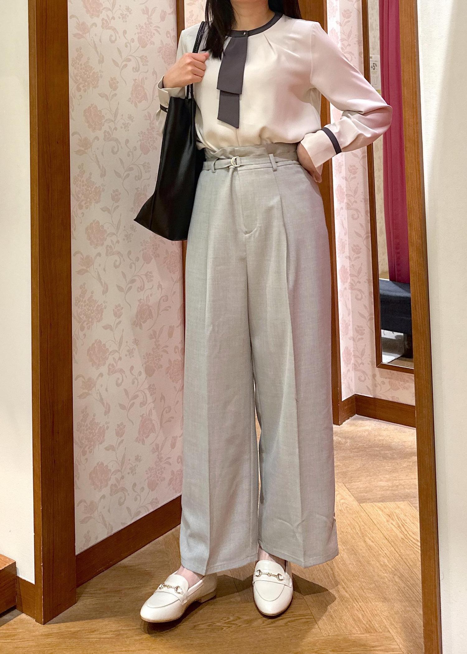 上下共にポリエステル素材で、サラッと軽やかで上品に見せてくれます◎ブラウスはボタン付きで、腕まくり可能なので冷房対策で調整しやすいです!