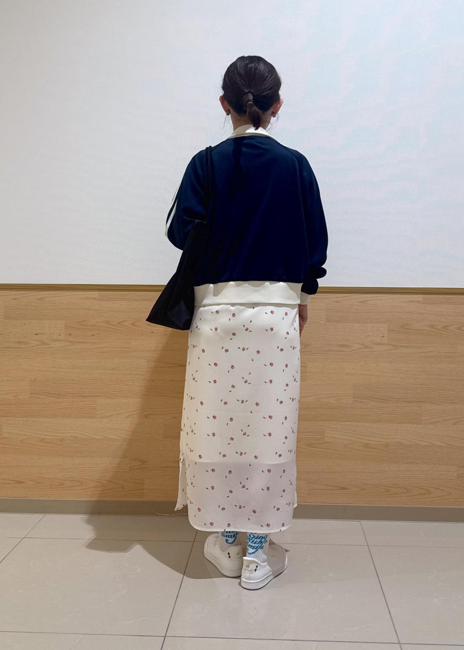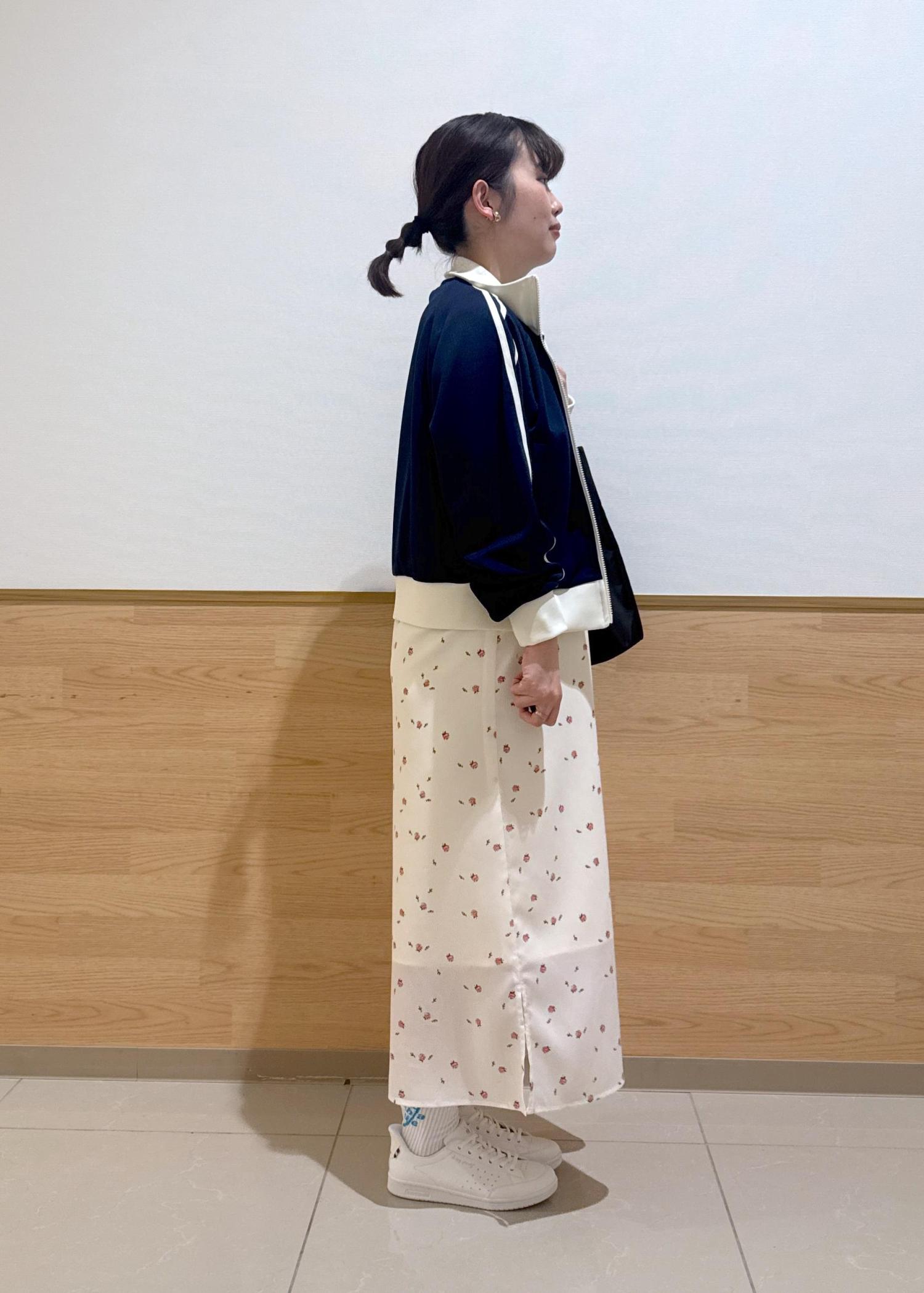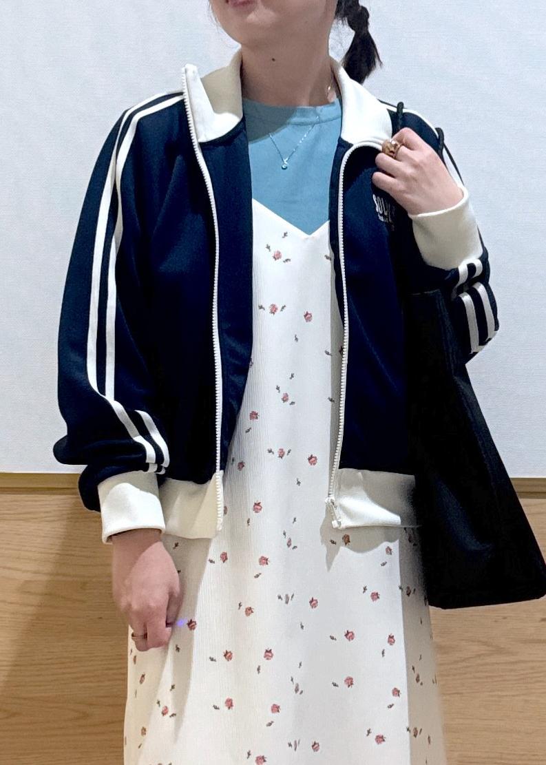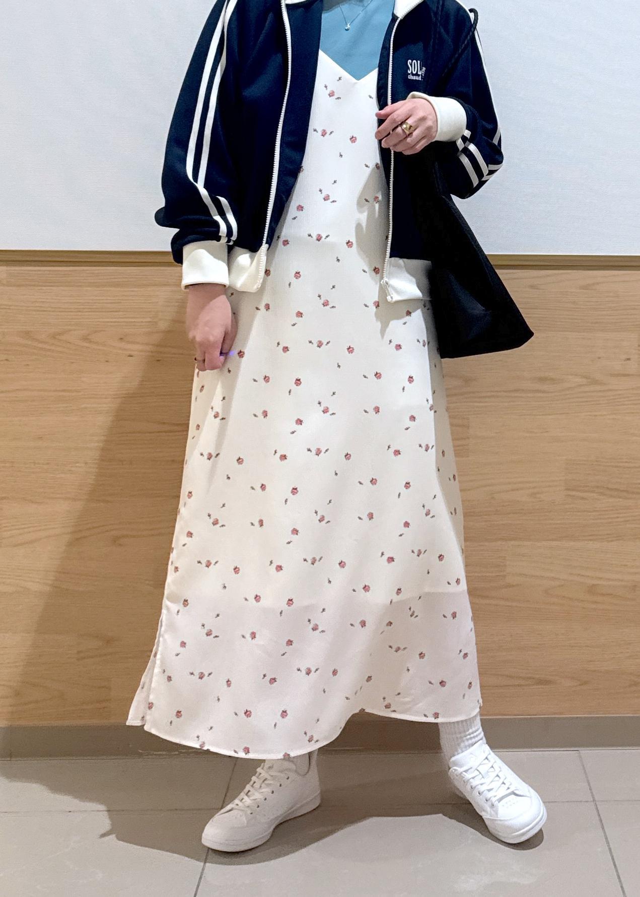 スポーティーなトラックジャケットに、甘めな花柄キャミワンピを合わせた甘めカジュアルコーデです。